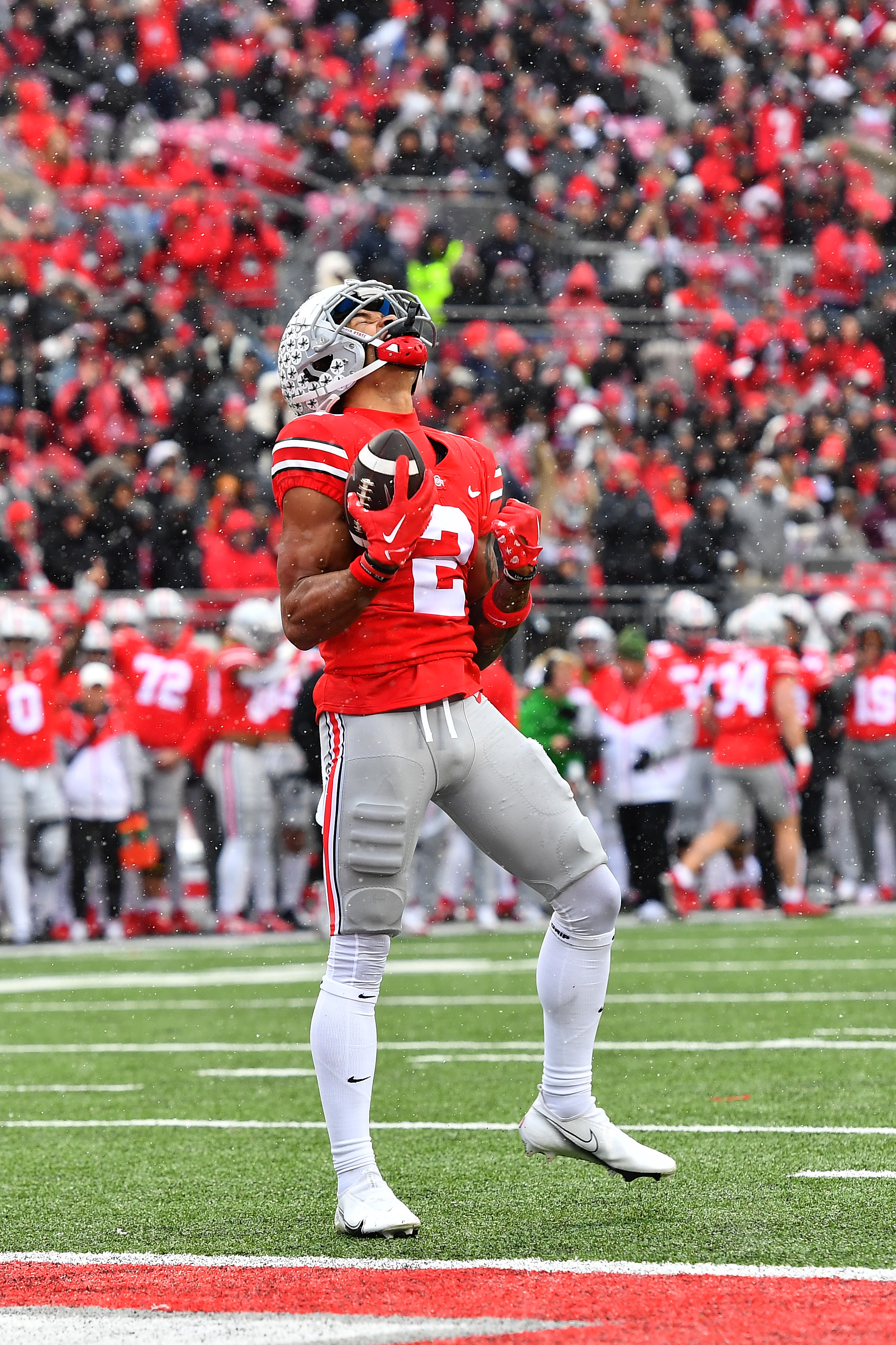 COLUMBUS, OHIO – NOVEMBER 12: Kamryn Babb #0 of the Ohio State Buckeyes reacts after scoring a touchdown during the fourth quarter of a game against the Indiana Hoosiers at Ohio Stadium on November 12, 2022 in Columbus, Ohio. (Photo by Ben Jackson/Getty Images)