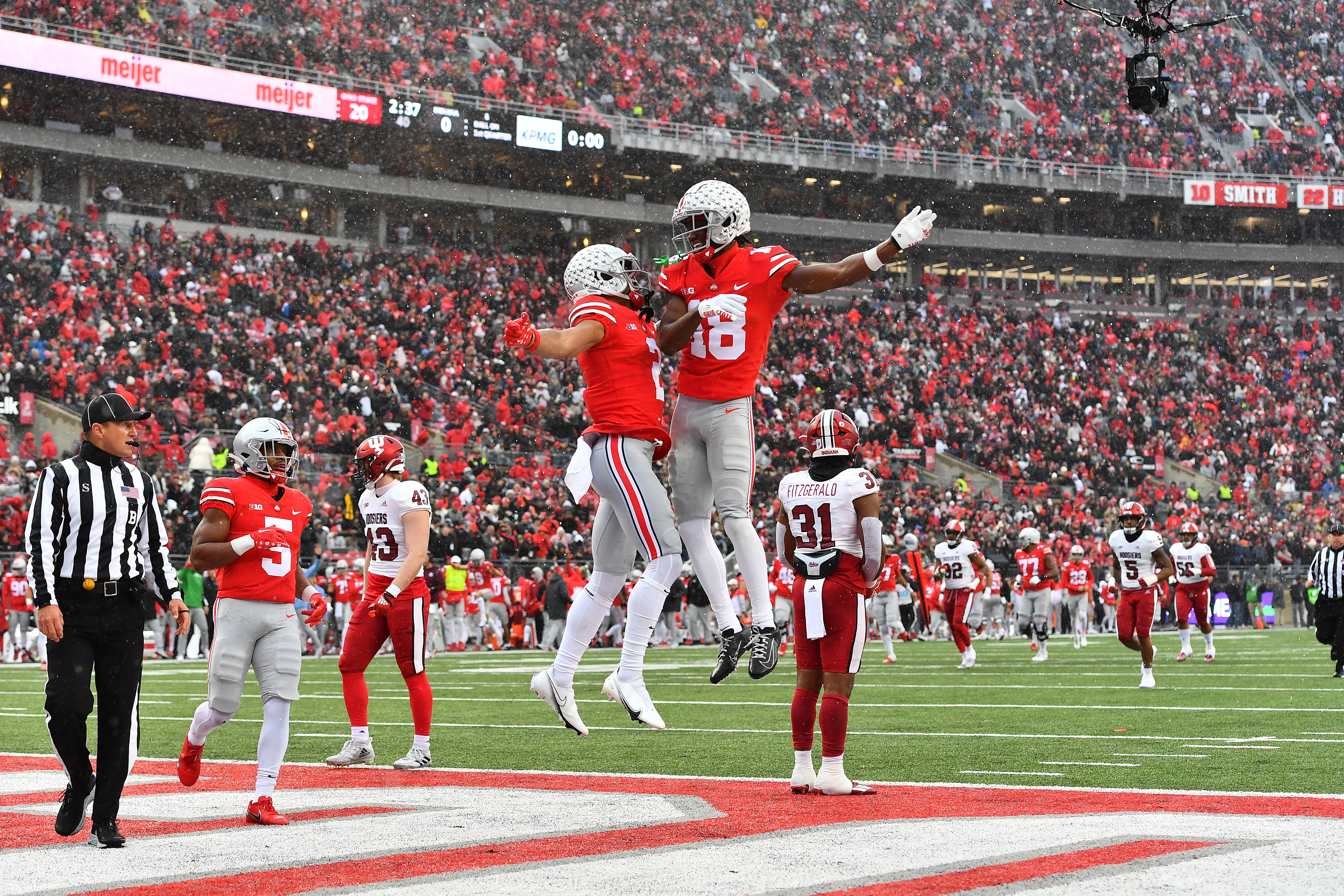 COLUMBUS, OHIO – NOVEMBER 12: Marvin Harrison Jr. #18 of the Ohio State Buckeyes celebrates his first quarter touchdown with teammate Emeka Egbuka #2 of the Ohio State Buckeyes during a game against the Indiana Hoosiers at Ohio Stadium on November 12, 2022 in Columbus, Ohio. (Photo by Ben Jackson/Getty Images)