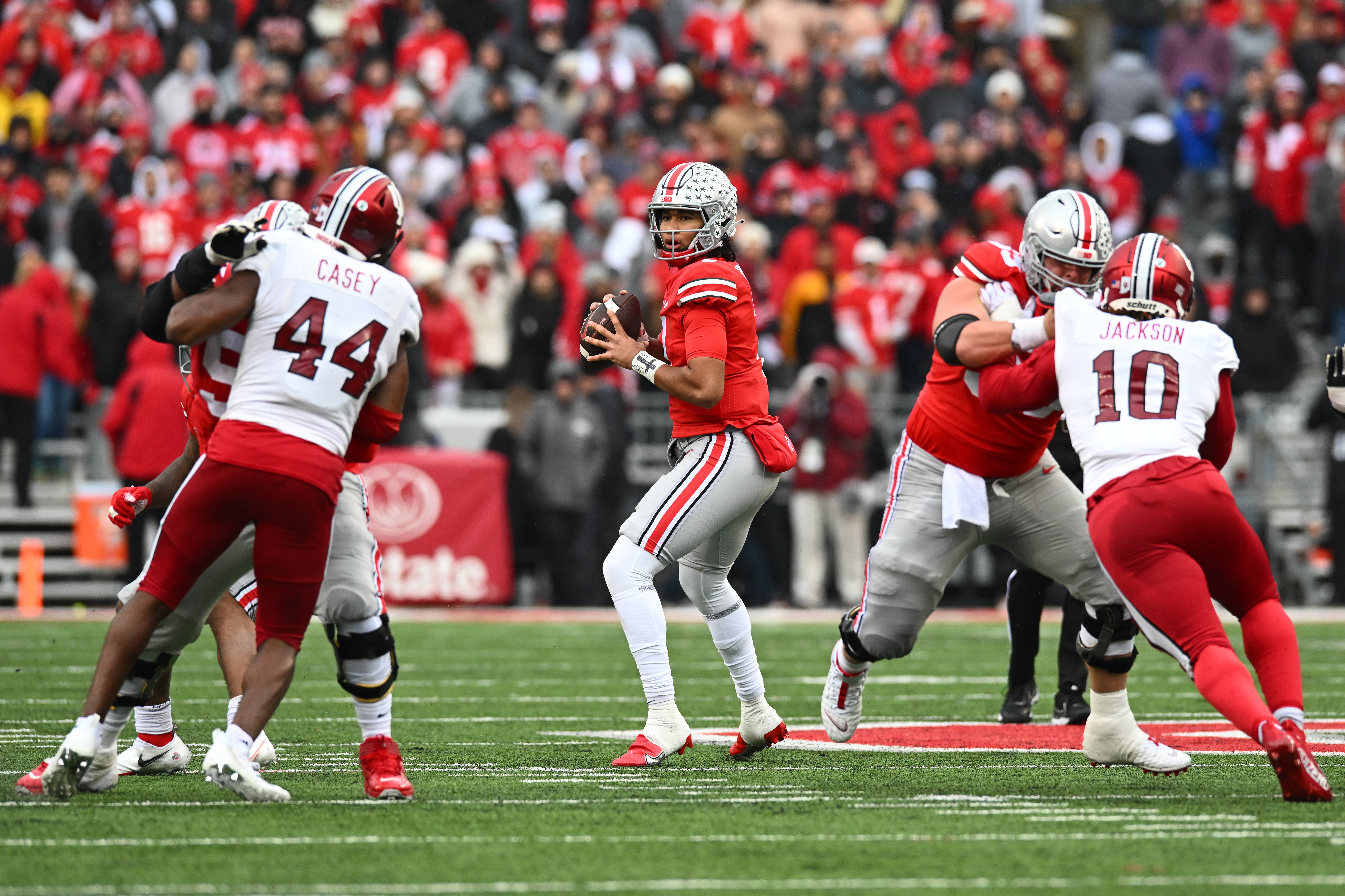 COLUMBUS, OHIO – NOVEMBER 12: C.J. Stroud #7 of the Ohio State Buckeyes drops back to pass during the second quarter of a game against the Indiana Hoosiers at Ohio Stadium on November 12, 2022 in Columbus, Ohio. (Photo by Ben Jackson/Getty Images)