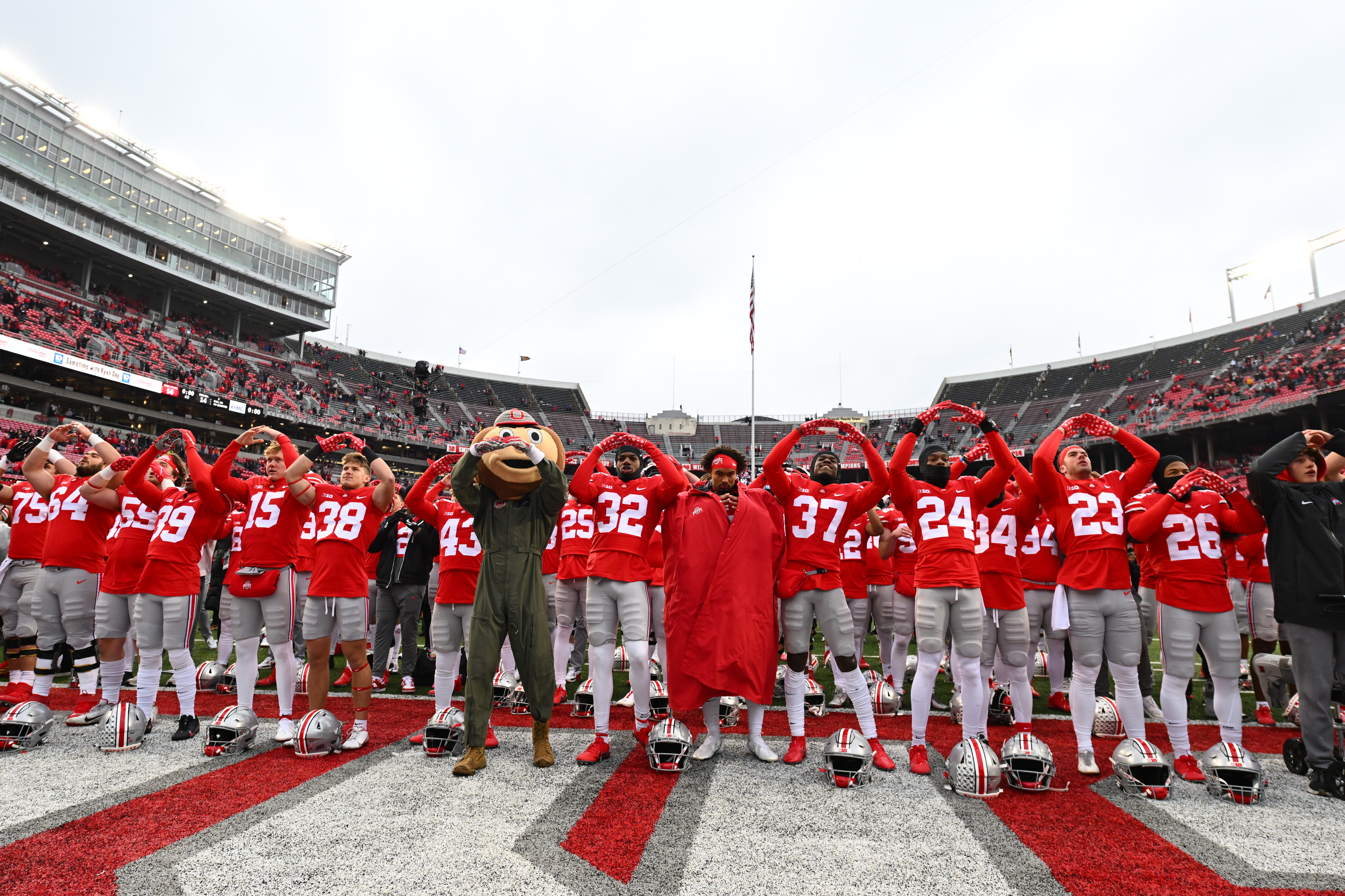 COLUMBUS, OHIO – NOVEMBER 12: The Ohio State Buckeyes take part in singing “Carmen Ohio” following a 56-14 victory over the Indiana Hoosiers at Ohio Stadium on November 12, 2022 in Columbus, Ohio. (Photo by Ben Jackson/Getty Images)