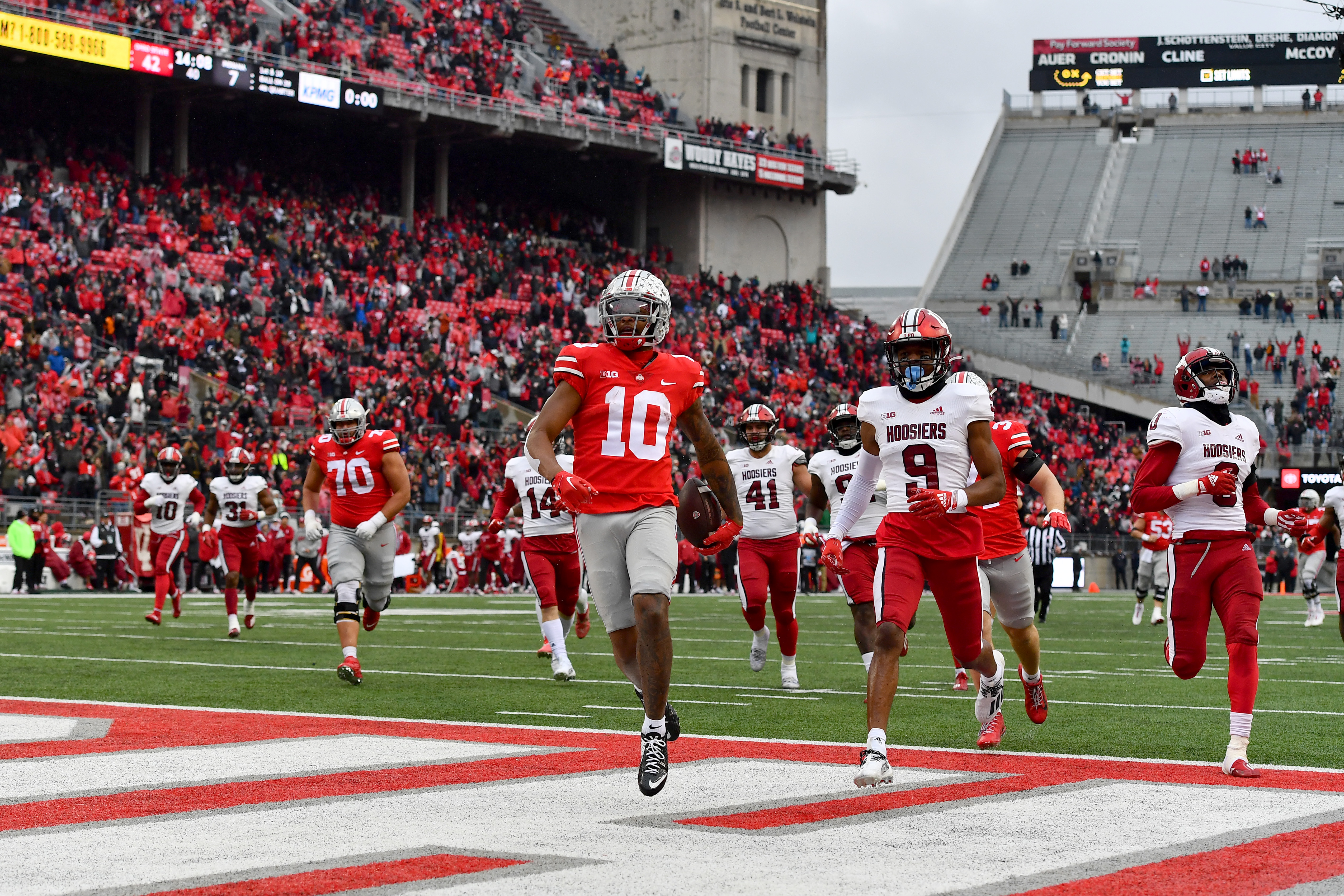 COLUMBUS, OHIO – NOVEMBER 12: Xavier Johnson #10 of the Ohio State Buckeyes scores a touchdown during the fourth quarter of a game against the Indiana Hoosiers at Ohio Stadium on November 12, 2022 in Columbus, Ohio. (Photo by Ben Jackson/Getty Images)