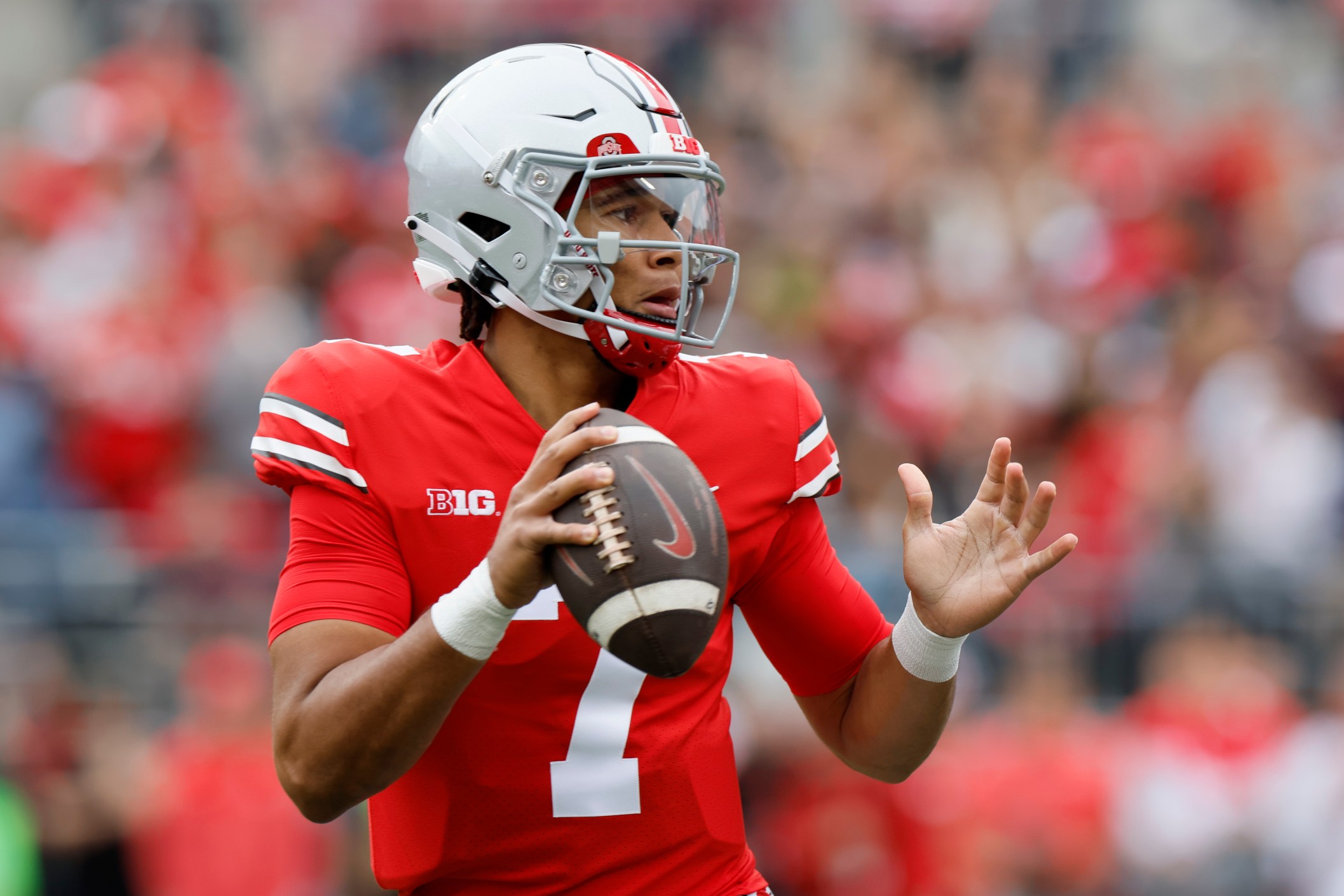 COLUMBUS, OHIO – OCTOBER 01: C.J. Stroud #7 of the Ohio State Buckeyes looks to pass during the first quarter of a game against the Rutgers Scarlet Knights at Ohio Stadium on October 01, 2022 in Columbus, Ohio. (Photo by Ben Jackson/Getty Images)