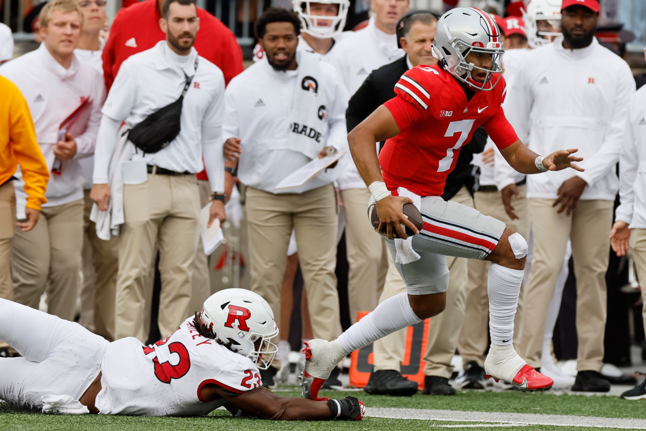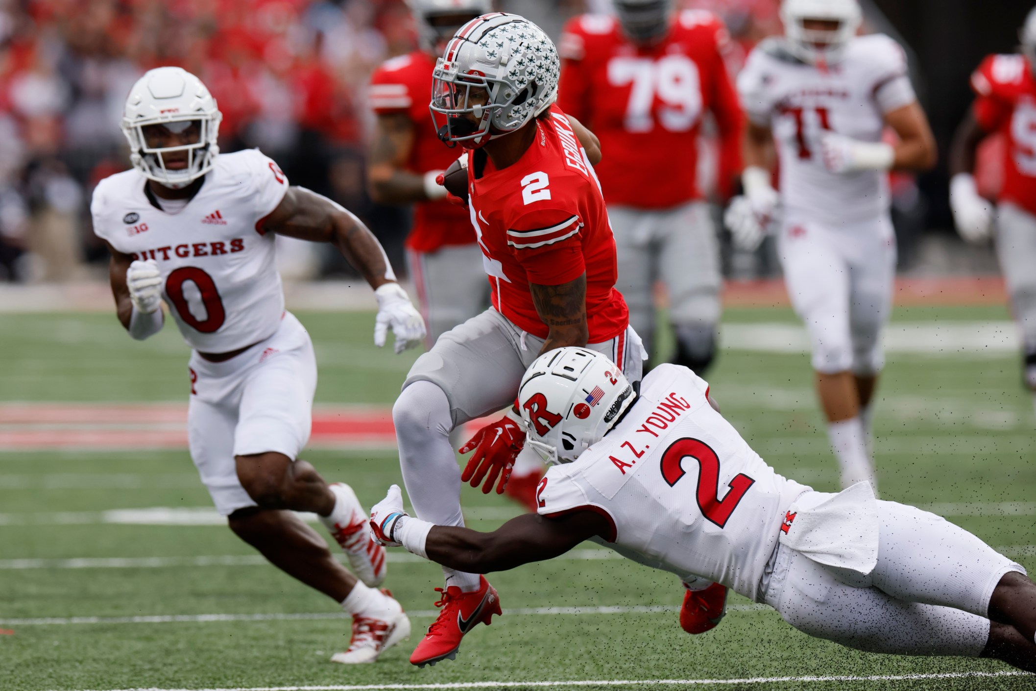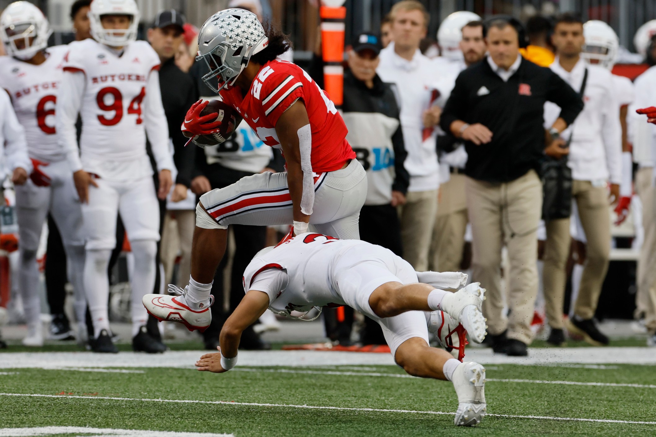 Ohio State got the ball at its 26-yard line following a three and out series from Rutgers. and converted a third-and-8 with a 27-yard strike from CJ Stroud to Egbuka, and they connected again on second-and-10 to take the ball down to the Rutgers 15. Marvin Harrison Jr. nearly got in on a reverse, getting pushed out inside the one.
