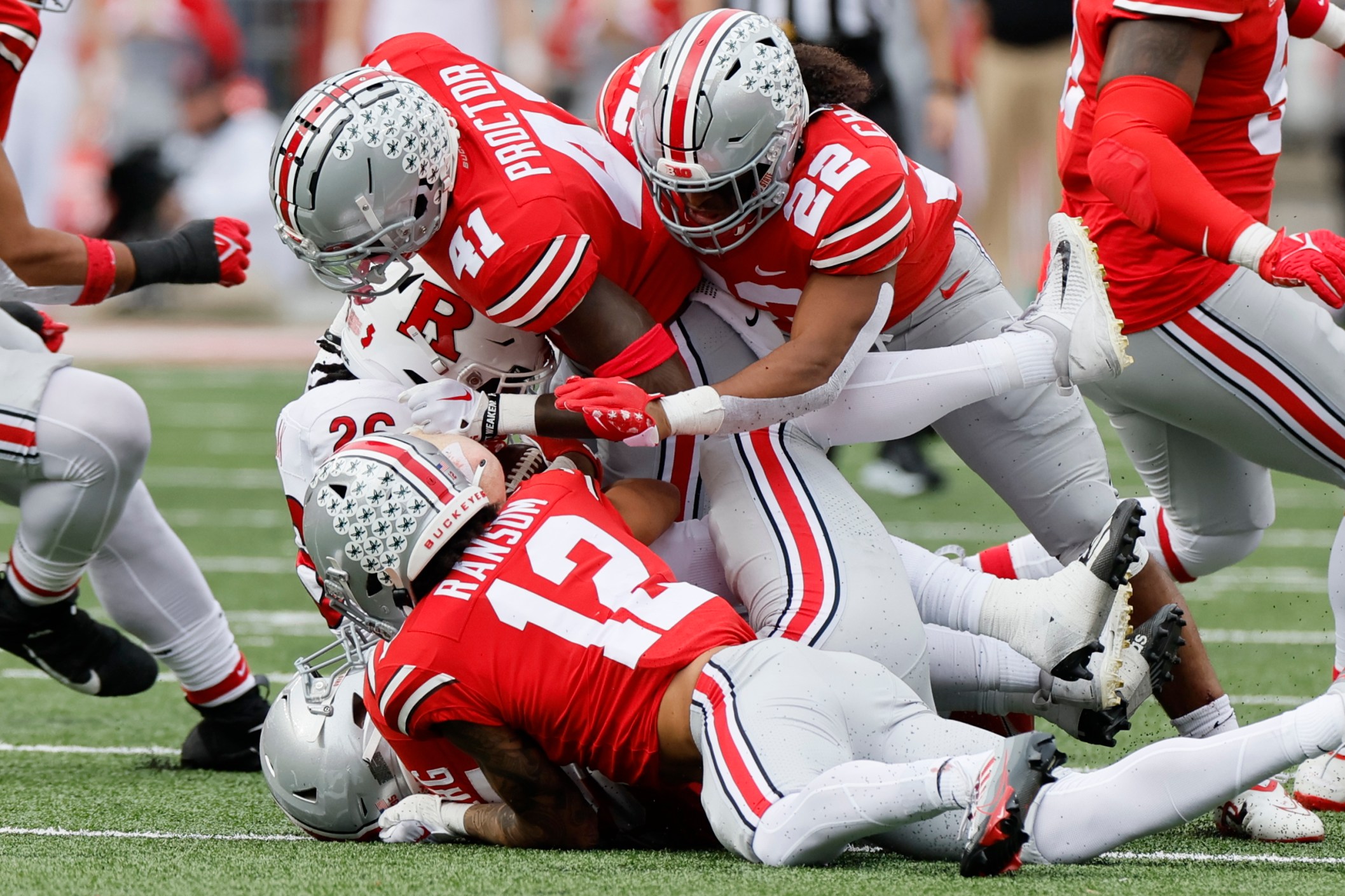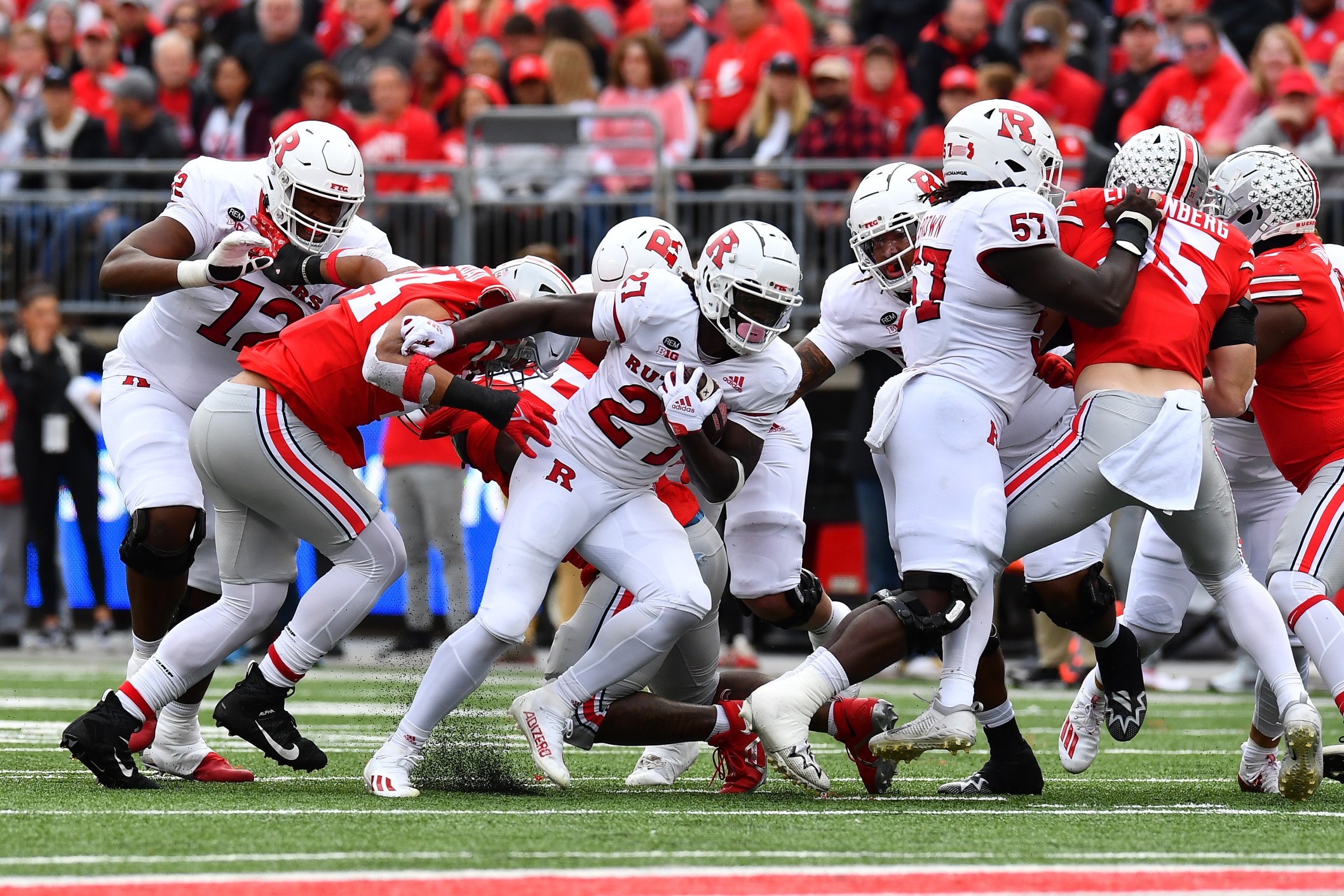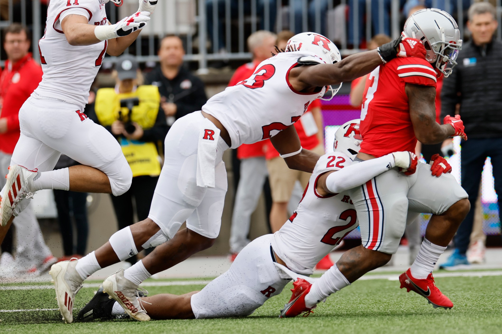 COLUMBUS, OHIO – OCTOBER 01: Kyle Monangai #23 of the Rutgers Scarlet Knights is tackled by Steele Chambers #22 of the Ohio State Buckeyes in the third quarter of a game at Ohio Stadium on October 01, 2022 in Columbus, Ohio. (Photo by Ben Jackson/Getty Images)