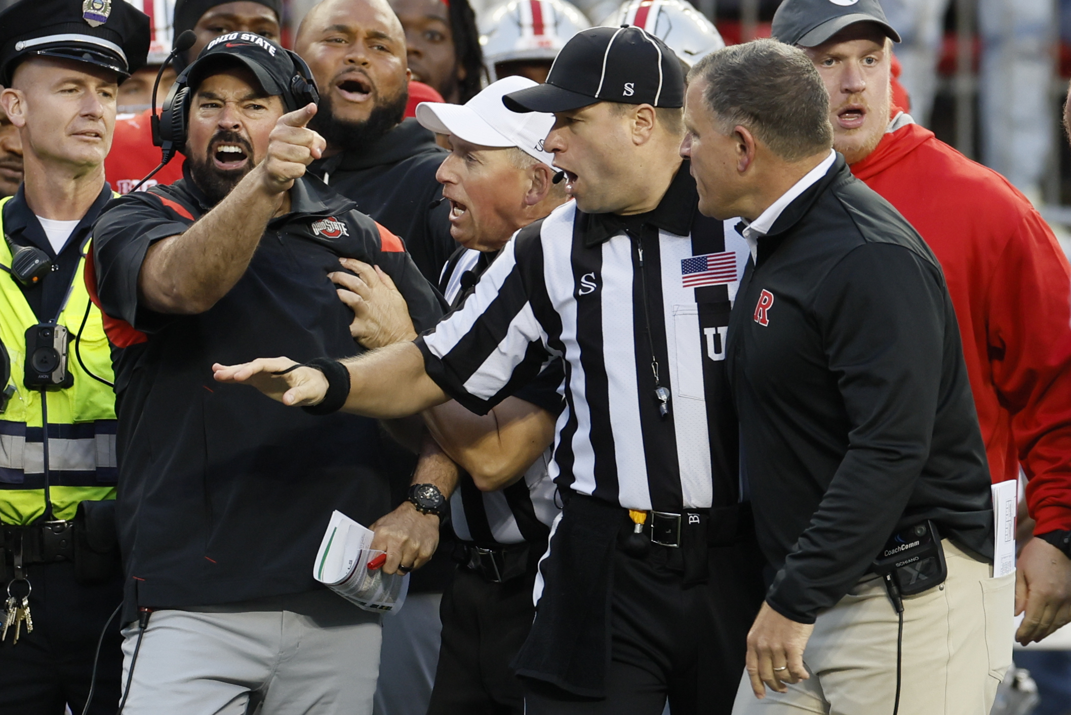 Ohio State head coach Ryan Day, left, argues with Rutgers head coach Greg Schiano during the second half of an NCAA college football game, Saturday, Oct. 1, 2022, in Columbus, Ohio. (AP Photo/Jay LaPrete)
