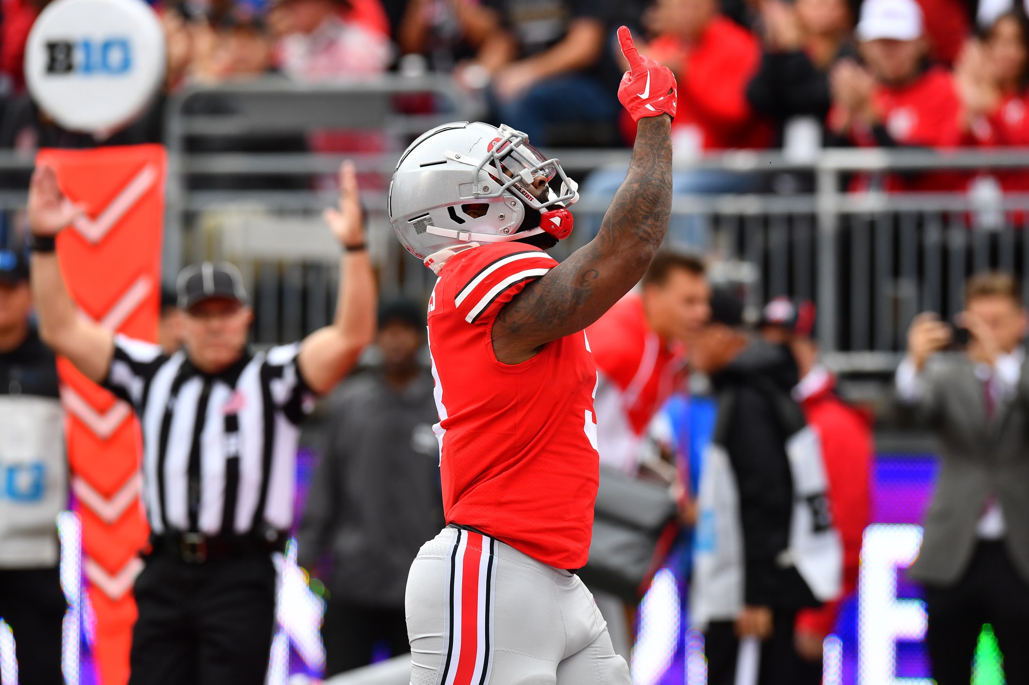 COLUMBUS, OHIO – OCTOBER 01: Miyan Williams #3 of the Ohio State Buckeyes celebrates his first quarter touchdown during a game against the Rutgers Scarlet Knights at Ohio Stadium on October 01, 2022 in Columbus, Ohio. (Photo by Ben Jackson/Getty Images)