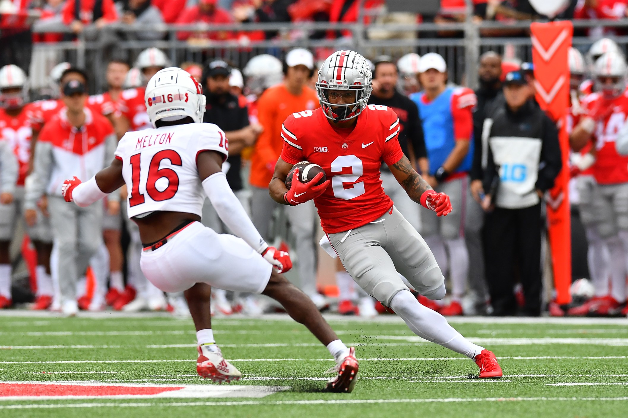 COLUMBUS, OHIO – OCTOBER 01: Emeka Egbuka #2 of the Ohio State Buckeyes runs with the ball during the first quarter of a game against the Rutgers Scarlet Knights at Ohio Stadium on October 01, 2022 in Columbus, Ohio. (Photo by Ben Jackson/Getty Images)