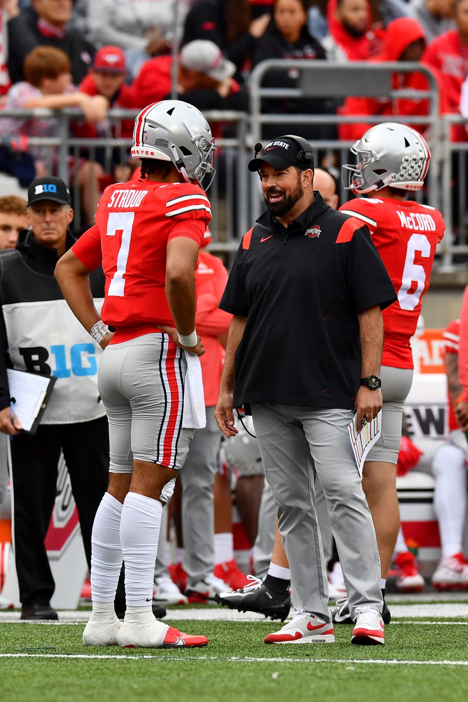 COLUMBUS, OHIO – OCTOBER 01: Head Coach Ryan Day of the Ohio State Buckeyes talks with C.J. Stroud #7 of the Ohio State Buckeyes during the second quarter of a game against the Rutgers Scarlet Knights at Ohio Stadium on October 01, 2022 in Columbus, Ohio. (Photo by Ben Jackson/Getty Images)