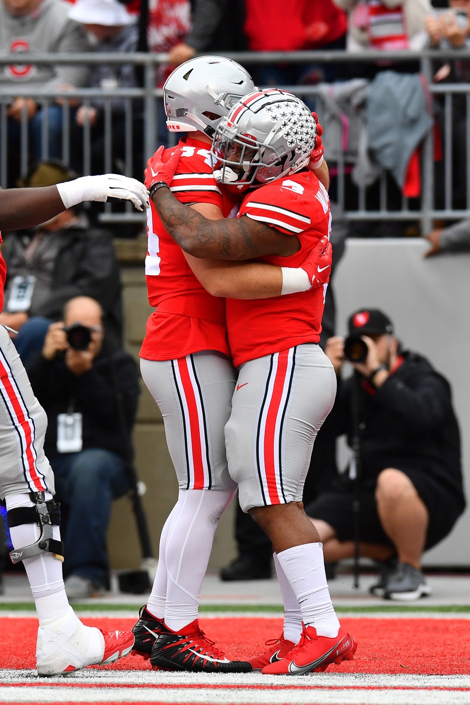 COLUMBUS, OHIO – OCTOBER 01: Miyan Williams #3 of the Ohio State Buckeyes celebrates a first quarter touchdown with teammate Mitch Rossi #34 during a game against the Rutgers Scarlet Knights at Ohio Stadium on October 01, 2022 in Columbus, Ohio. (Photo by Ben Jackson/Getty Images)