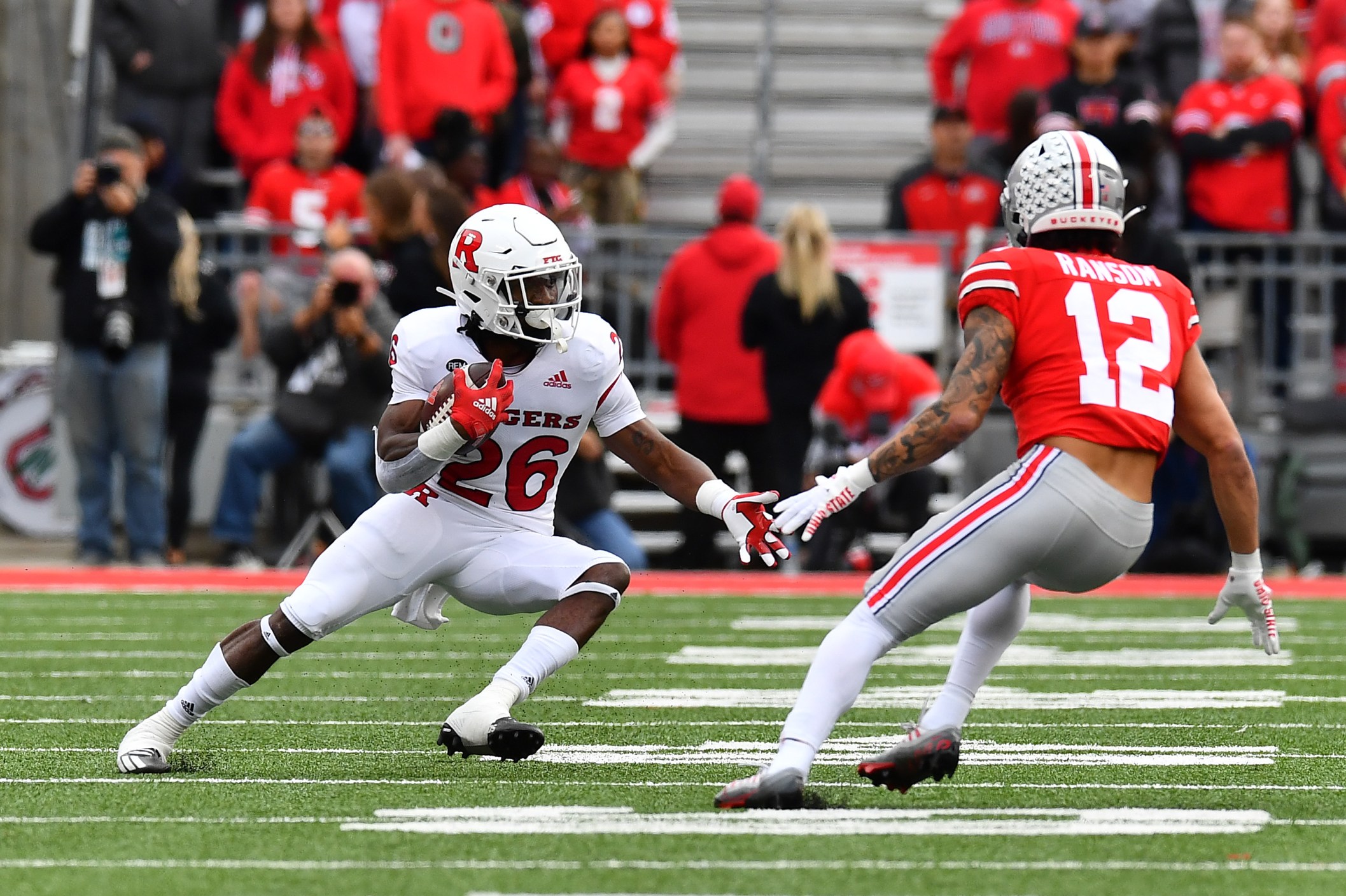 COLUMBUS, OHIO – OCTOBER 01: Al-Shadee Salaam #26 of the Rutgers Scarlet Knights runs with the ball during the second quarter of a game against the Ohio State Buckeyes at Ohio Stadium on October 01, 2022 in Columbus, Ohio. (Photo by Ben Jackson/Getty Images)