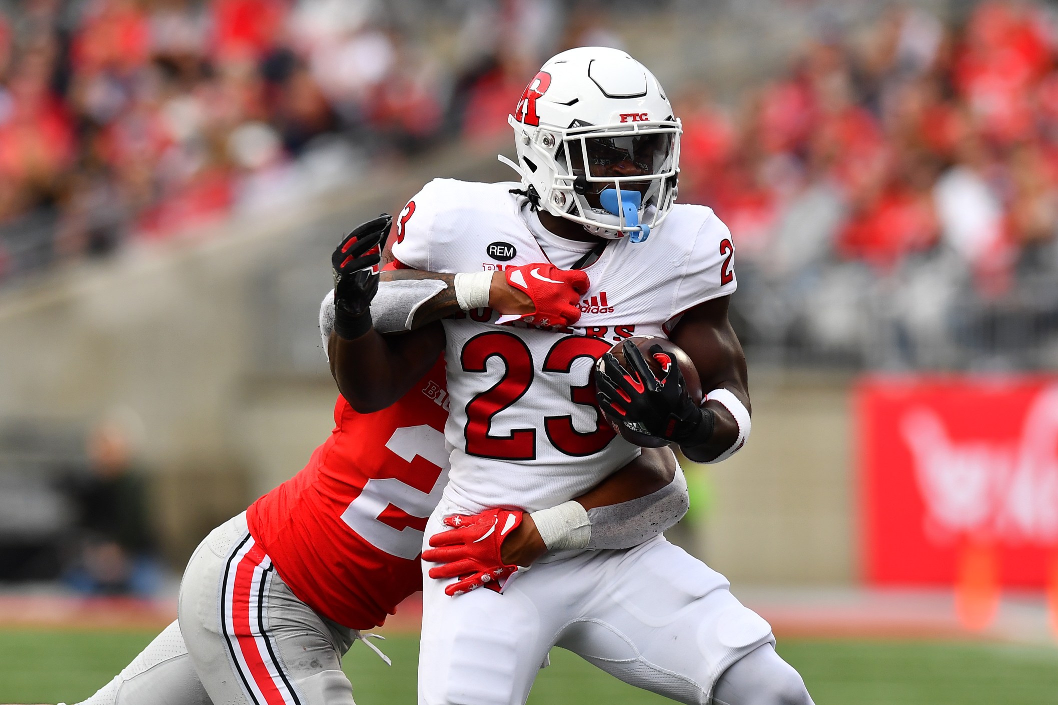 COLUMBUS, OHIO – OCTOBER 01: Samuel Brown V #27 of the Rutgers Scarlet Knights runs with the ball during the second quarter of a game against the Ohio State Buckeyes at Ohio Stadium on October 01, 2022 in Columbus, Ohio. (Photo by Ben Jackson/Getty Images)