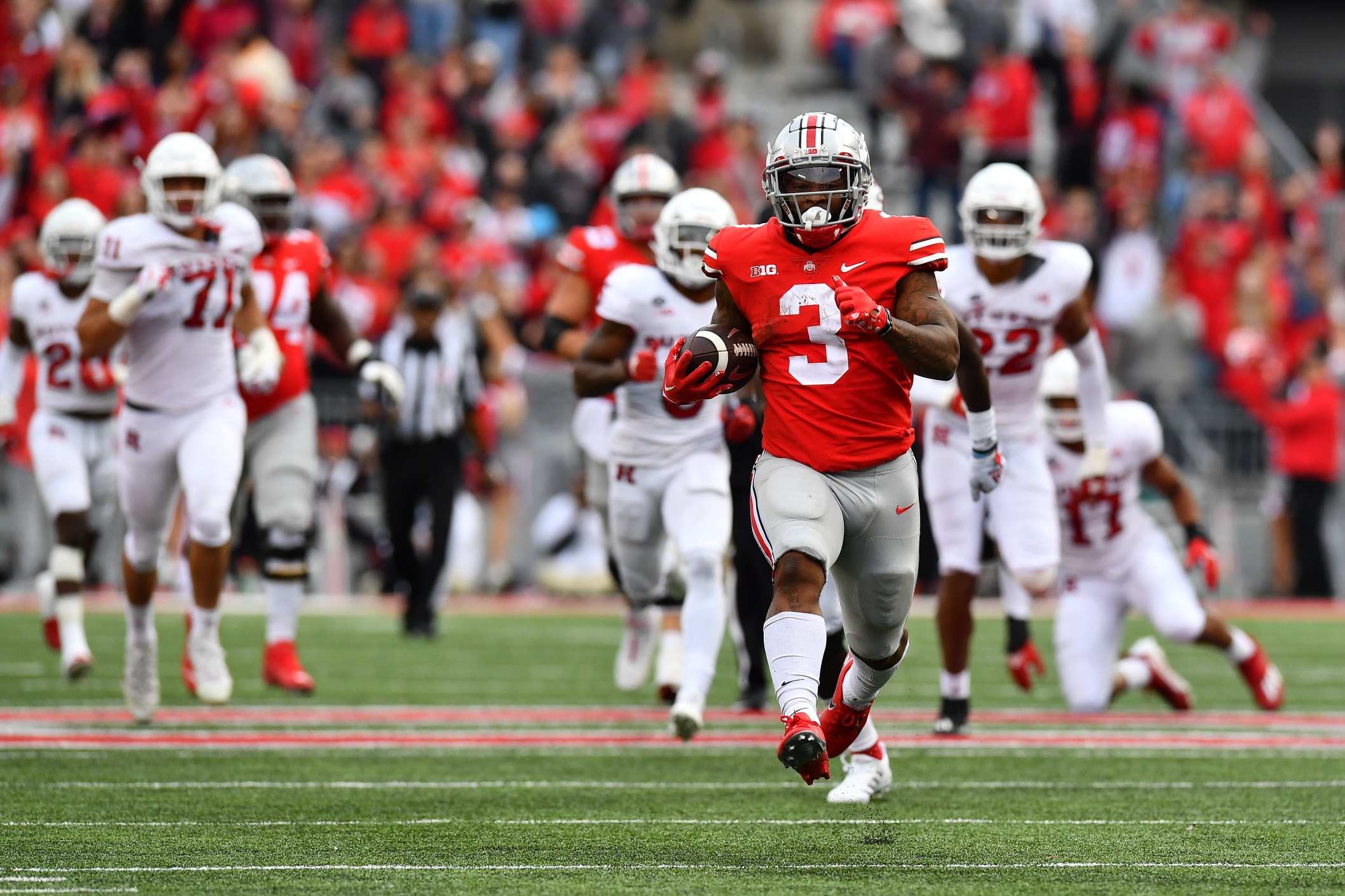 COLUMBUS, OHIO – OCTOBER 01: Miyan Williams #3 of the Ohio State Buckeyes runs with the ball during the first quarter of a game against the Rutgers Scarlet Knights at Ohio Stadium on October 01, 2022 in Columbus, Ohio. (Photo by Ben Jackson/Getty Images)