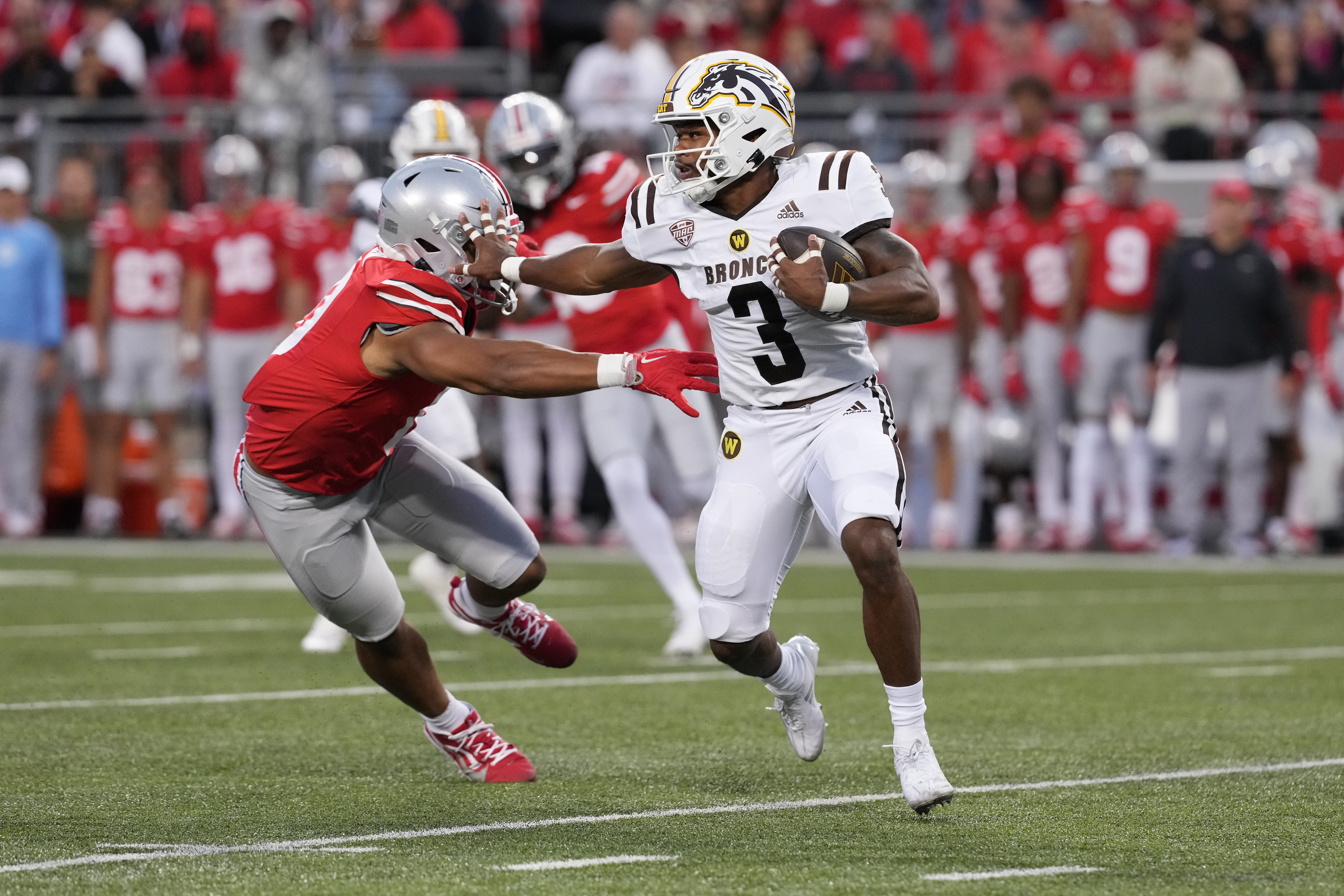 Western Michigan quarterback Hayden Wolff is swallowed up by the Buckeyes defense, forcing a Broncos punt.