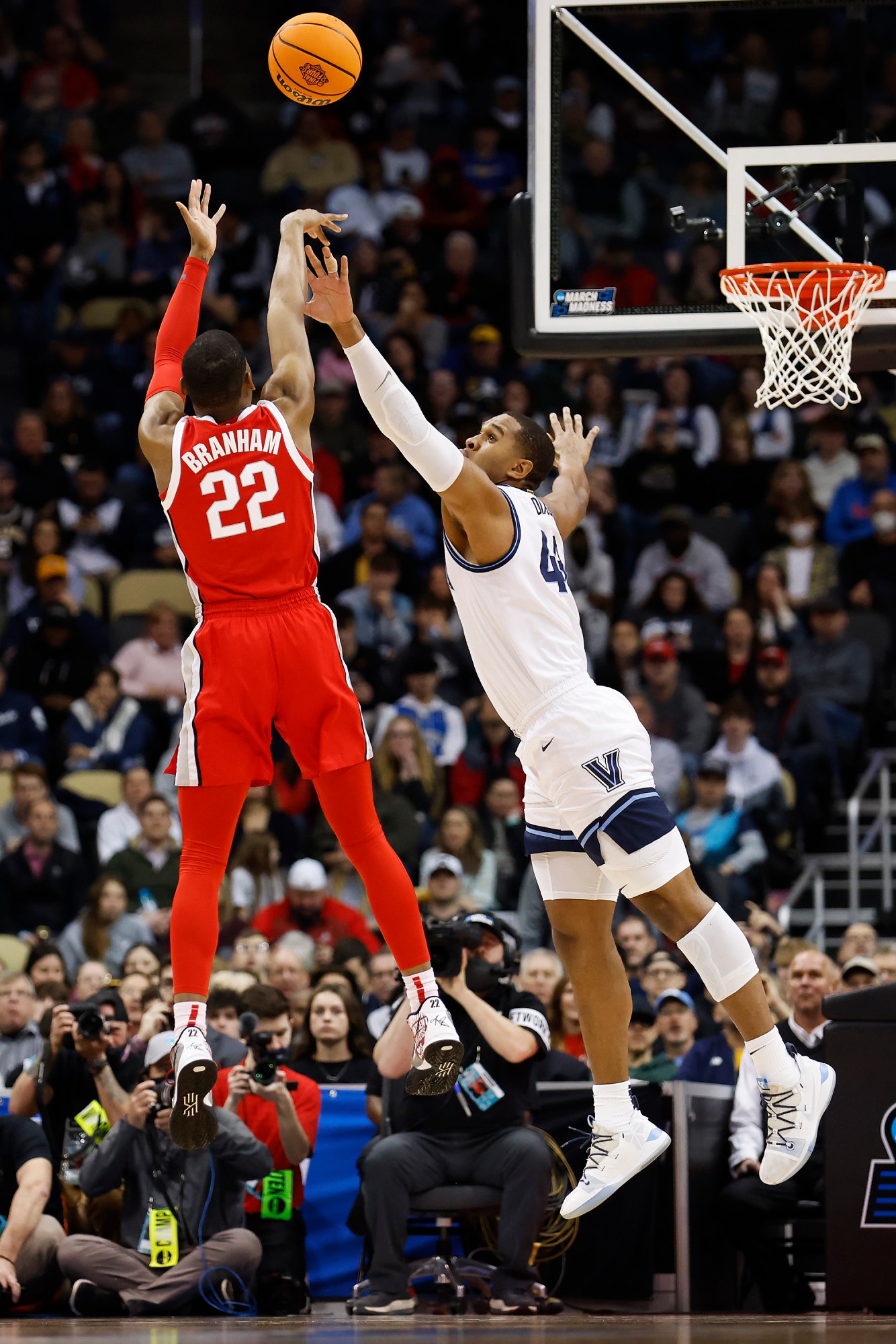 PITTSBURGH, PENNSYLVANIA – MARCH 20: Malaki Branham #22 of the Ohio State Buckeyes shoots the ball as Eric Dixon #43 of the Villanova Wildcats defends in the first half of the game during the second round of the 2022 NCAA Men’s Basketball Tournament at PPG PAINTS Arena on March 20, 2022 in Pittsburgh, Pennsylvania. (Photo by Kirk Irwin/Getty Images)