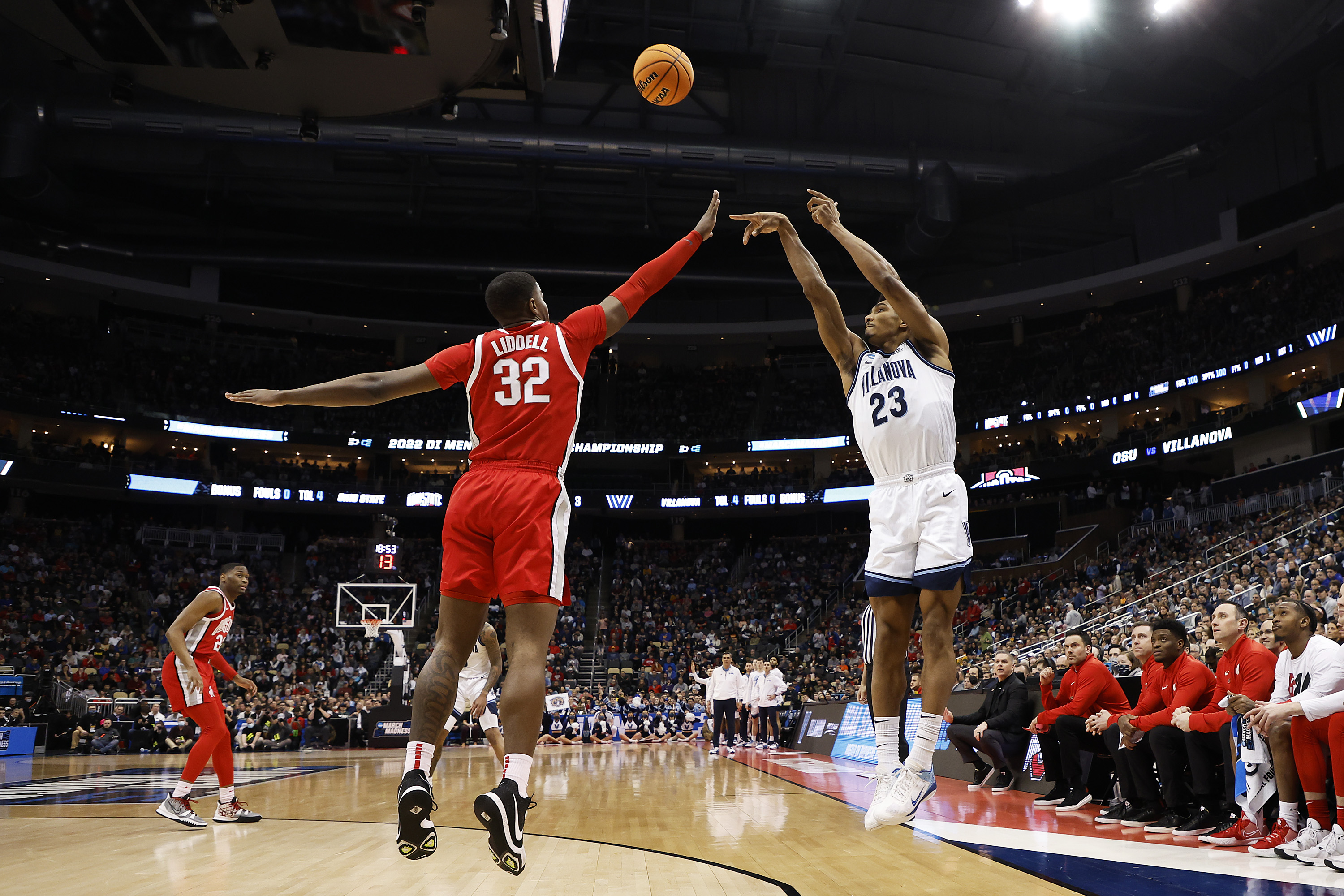PITTSBURGH, PENNSYLVANIA – MARCH 20: Jermaine Samuels #23 of the Villanova Wildcats shoots the ball as E.J. Liddell #32 of the Ohio State Buckeyes defends in the first half of the game during the second round of the 2022 NCAA Men’s Basketball Tournament at PPG PAINTS Arena on March 20, 2022 in Pittsburgh, Pennsylvania. (Photo by Kirk Irwin/Getty Images)