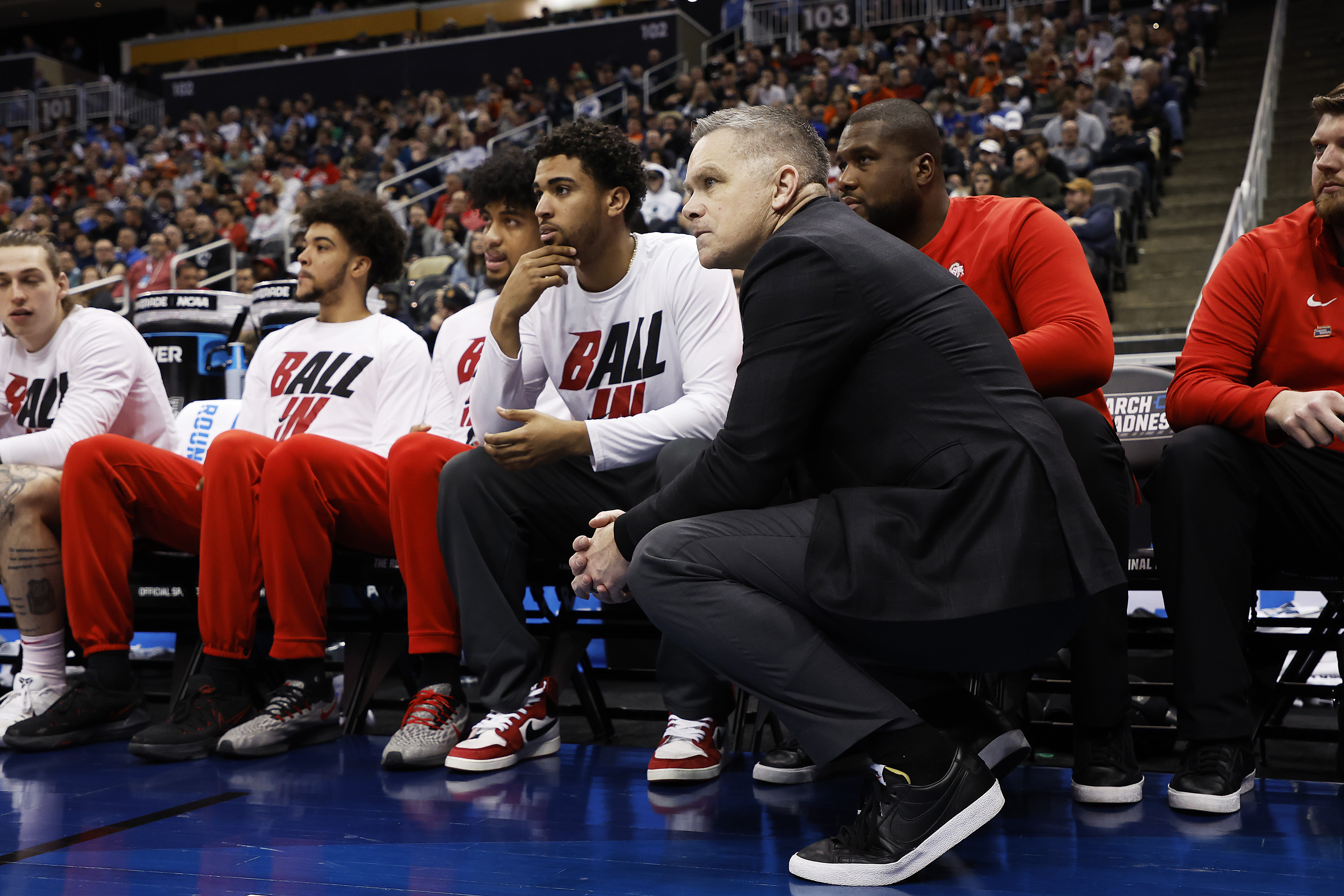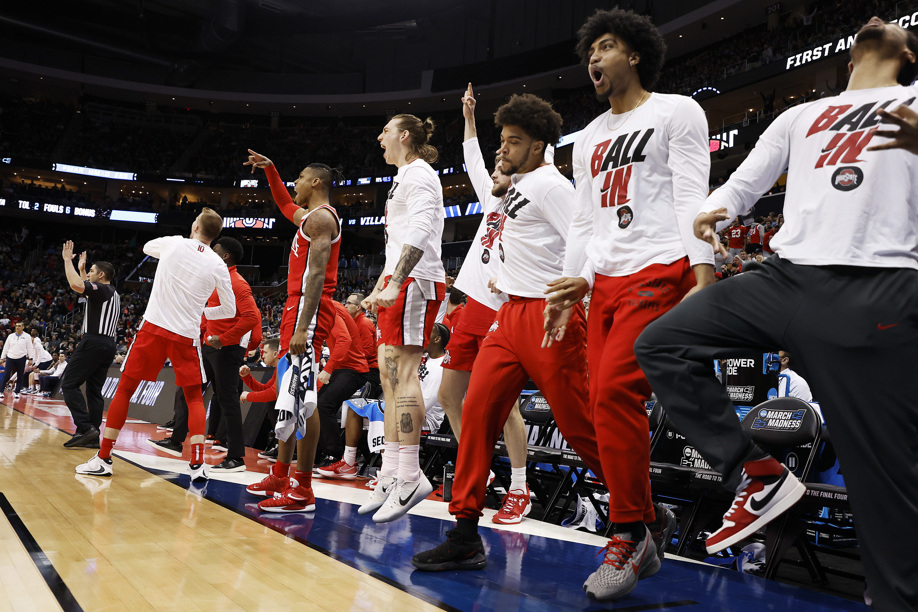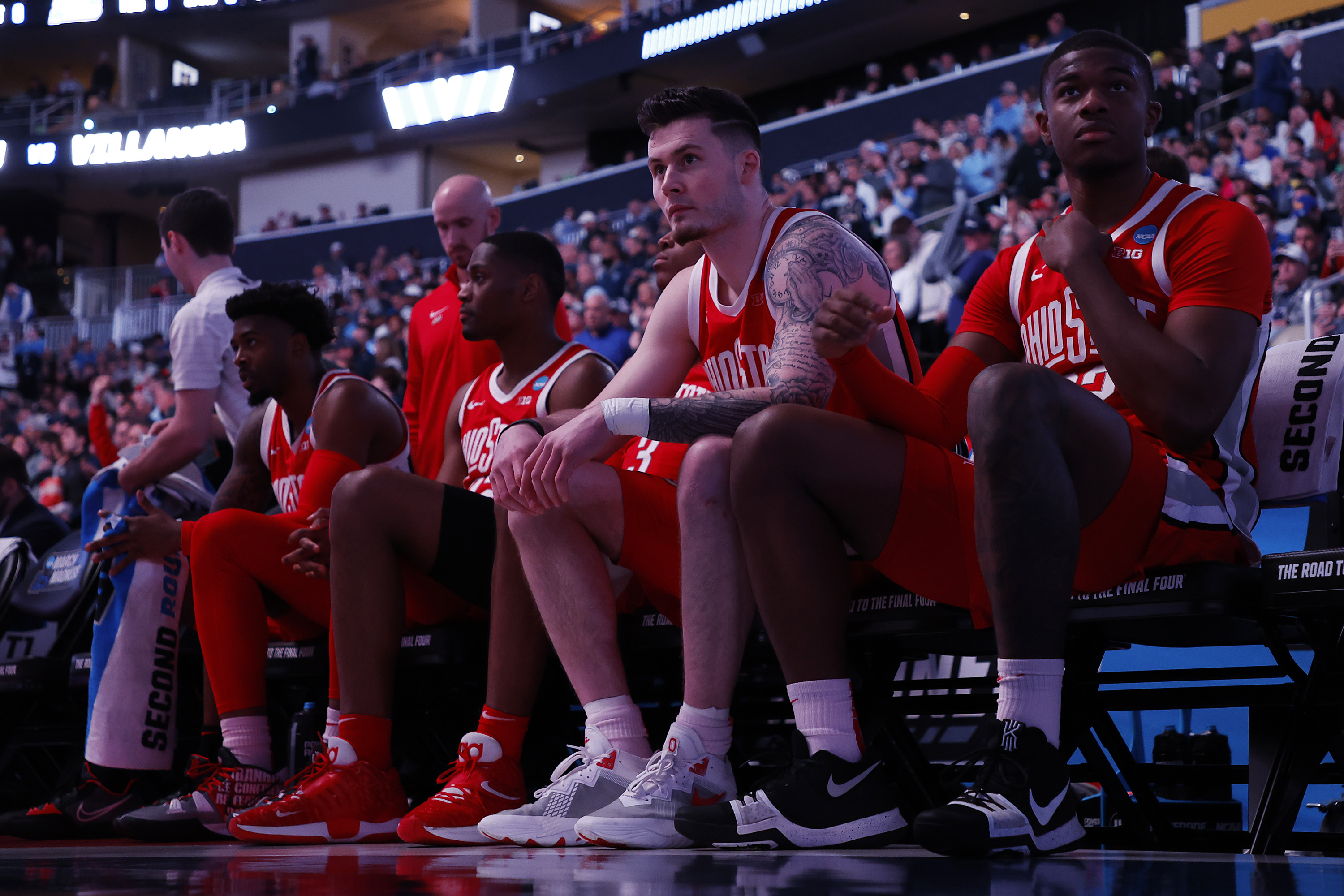 PITTSBURGH, PENNSYLVANIA – MARCH 20: Ohio State Buckeyes players react on the sidelines in the second half of the game against the Villanova Wildcats during the second round of the 2022 NCAA Men’s Basketball Tournament at PPG PAINTS Arena on March 20, 2022 in Pittsburgh, Pennsylvania. (Photo by Kirk Irwin/Getty Images)
