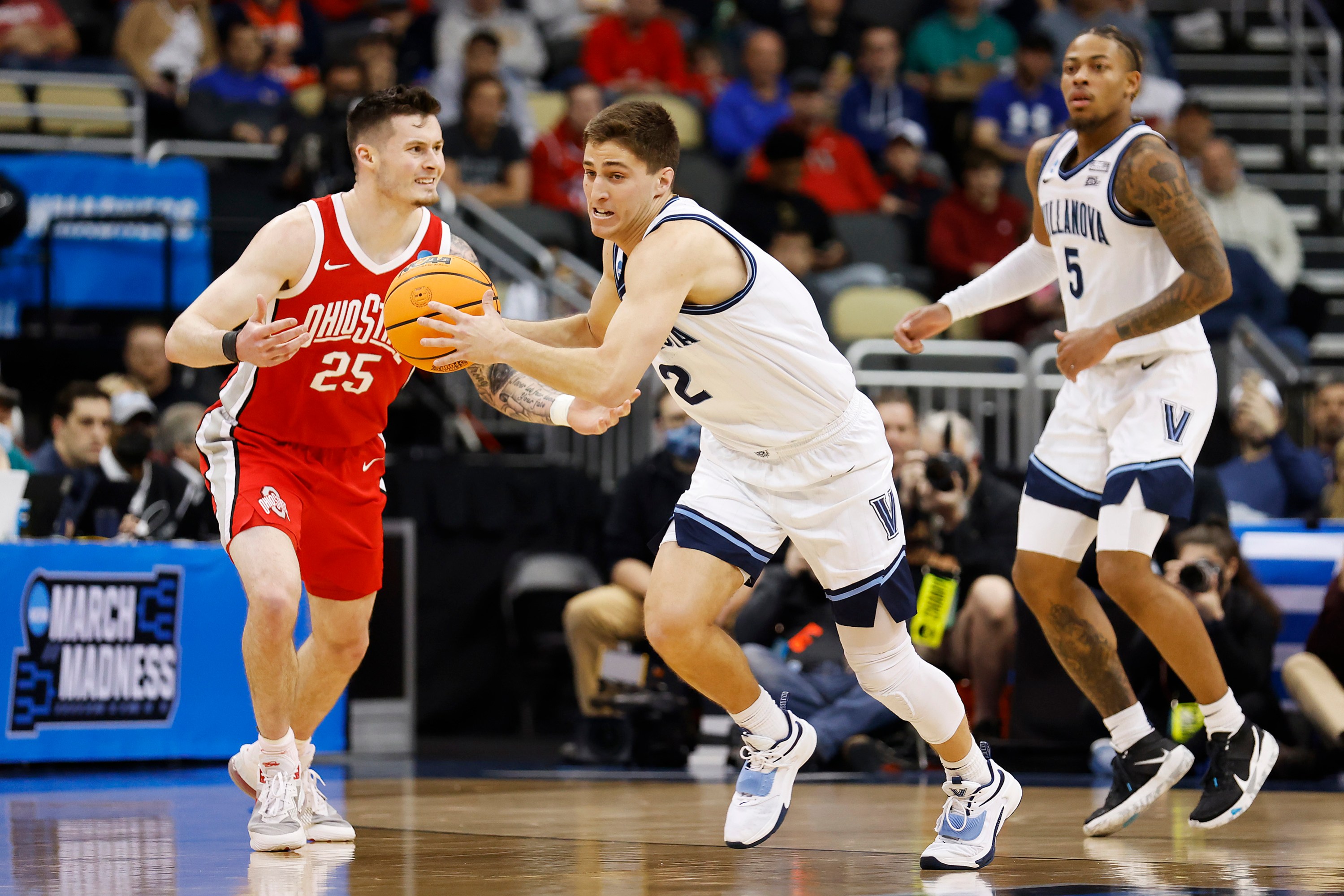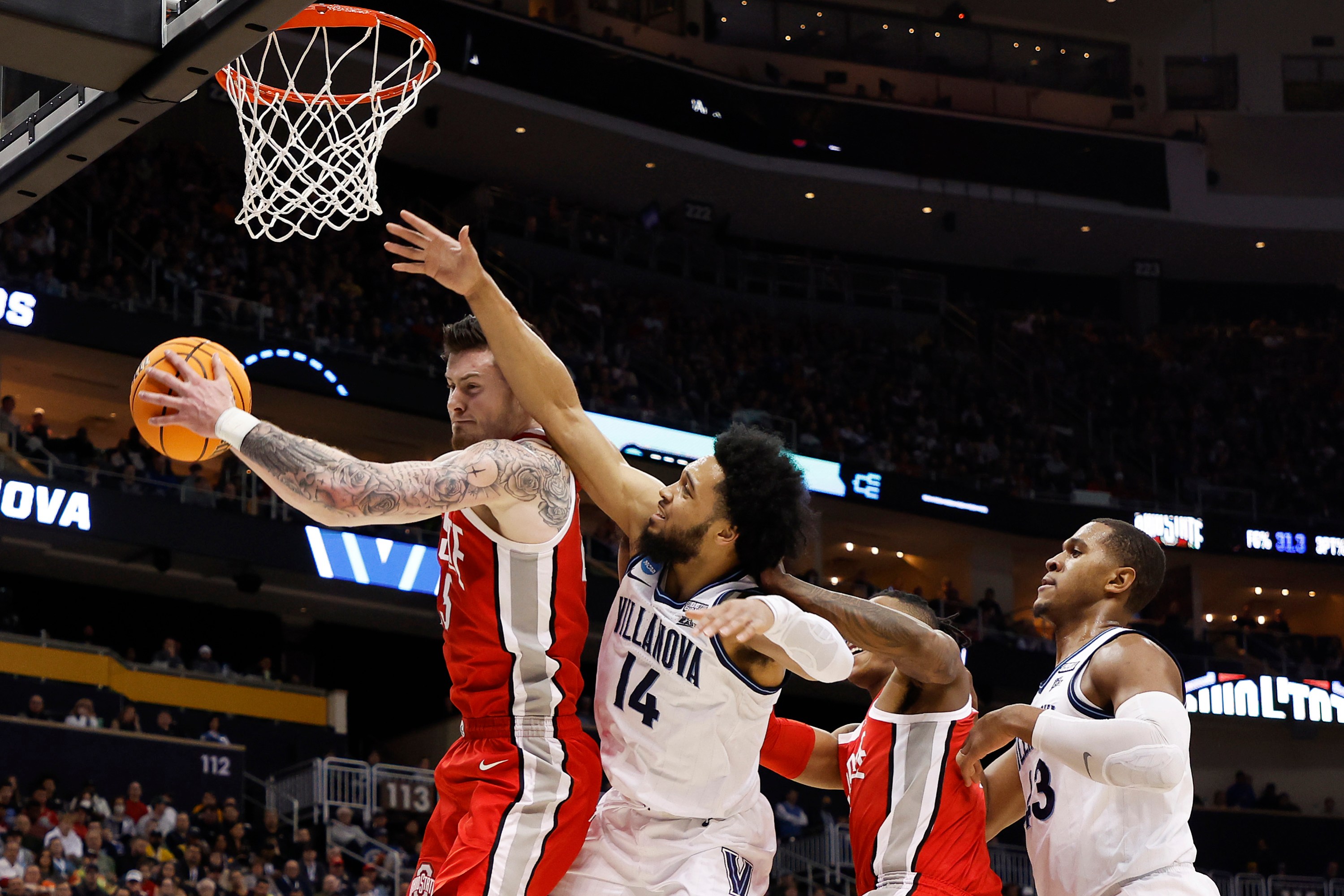 PITTSBURGH, PENNSYLVANIA – MARCH 20: Kyle Young #25 of the Ohio State Buckeyes is stripped of the ball by Justin Moore #5 of the Villanova Wildcats in the first half of the game during the second round of the 2022 NCAA Men’s Basketball Tournament at PPG PAINTS Arena on March 20, 2022 in Pittsburgh, Pennsylvania. (Photo by Kirk Irwin/Getty Images)