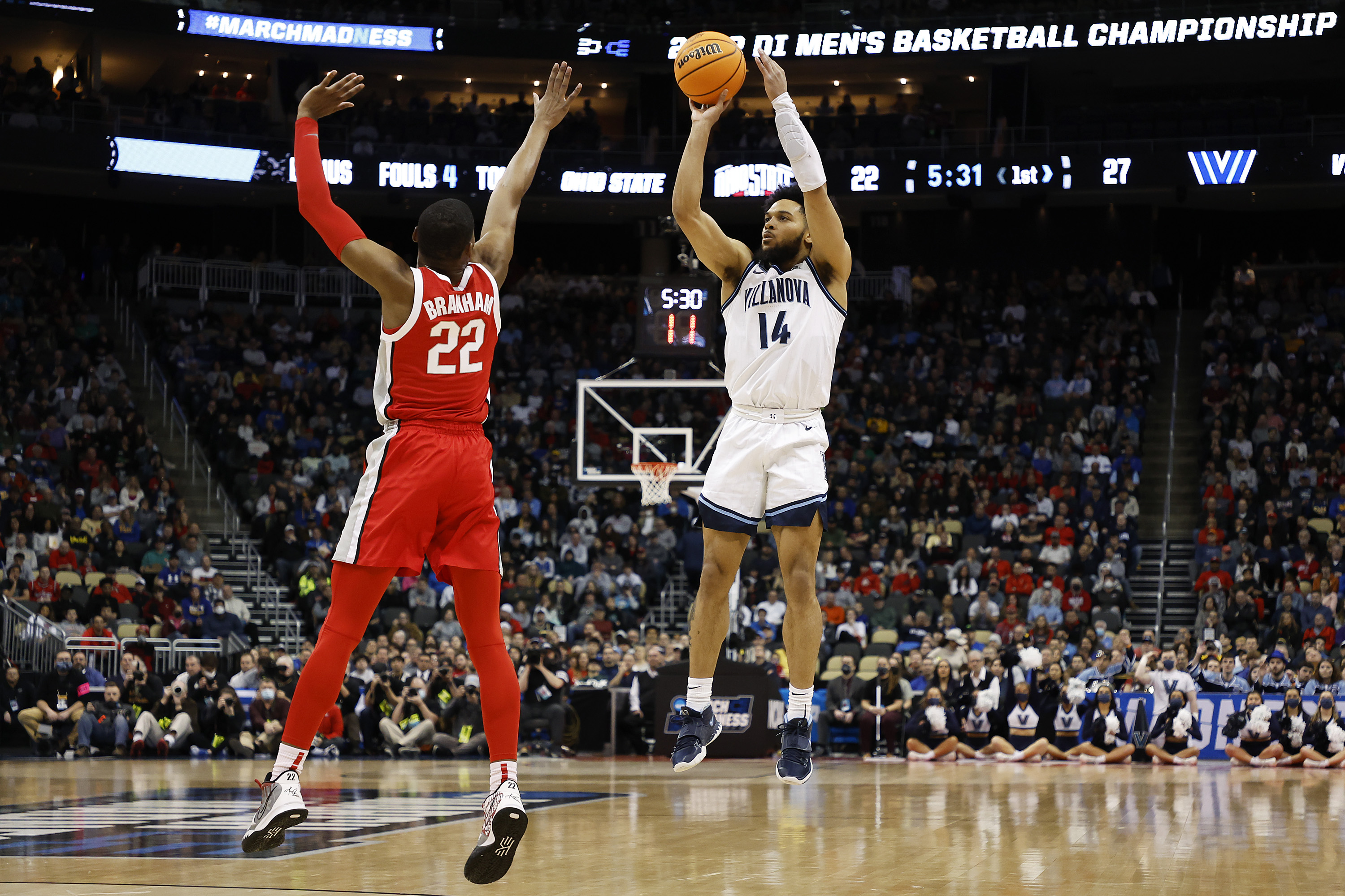 PITTSBURGH, PENNSYLVANIA – MARCH 20: Caleb Daniels #14 of the Villanova Wildcats shoots the ball over Malaki Branham #22 of the Ohio State Buckeyes in the first half of the game during the second round of the 2022 NCAA Men’s Basketball Tournament at PPG PAINTS Arena on March 20, 2022 in Pittsburgh, Pennsylvania. (Photo by Kirk Irwin/Getty Images)