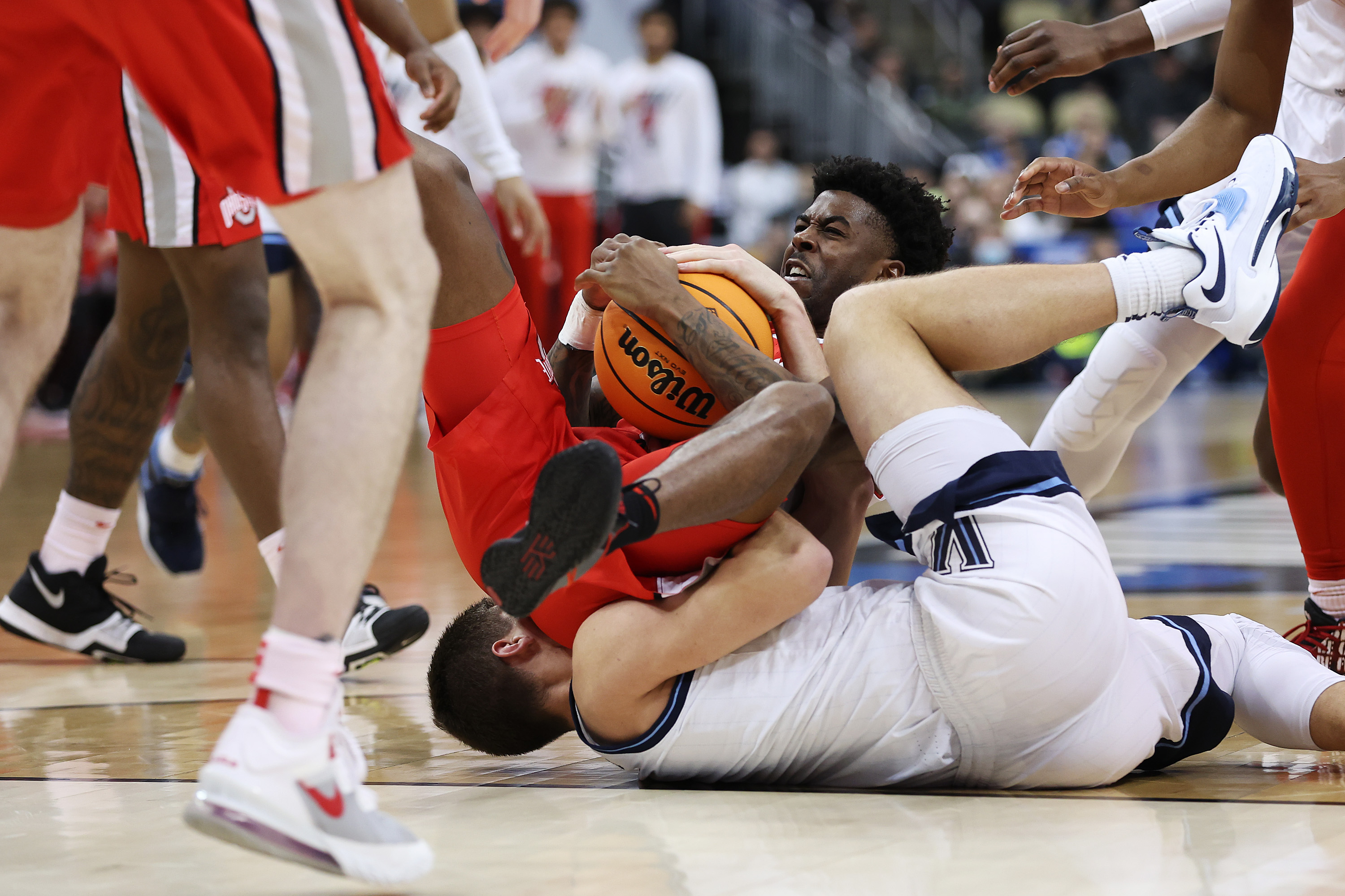 PITTSBURGH, PENNSYLVANIA – MARCH 20: Jamari Wheeler #55 of the Ohio State Buckeyes falls on top of Collin Gillespie #2 of the Villanova Wildcats in the second half of the game during the second round of the 2022 NCAA Men’s Basketball Tournament at PPG PAINTS Arena on March 20, 2022 in Pittsburgh, Pennsylvania. (Photo by Rob Carr/Getty Images)