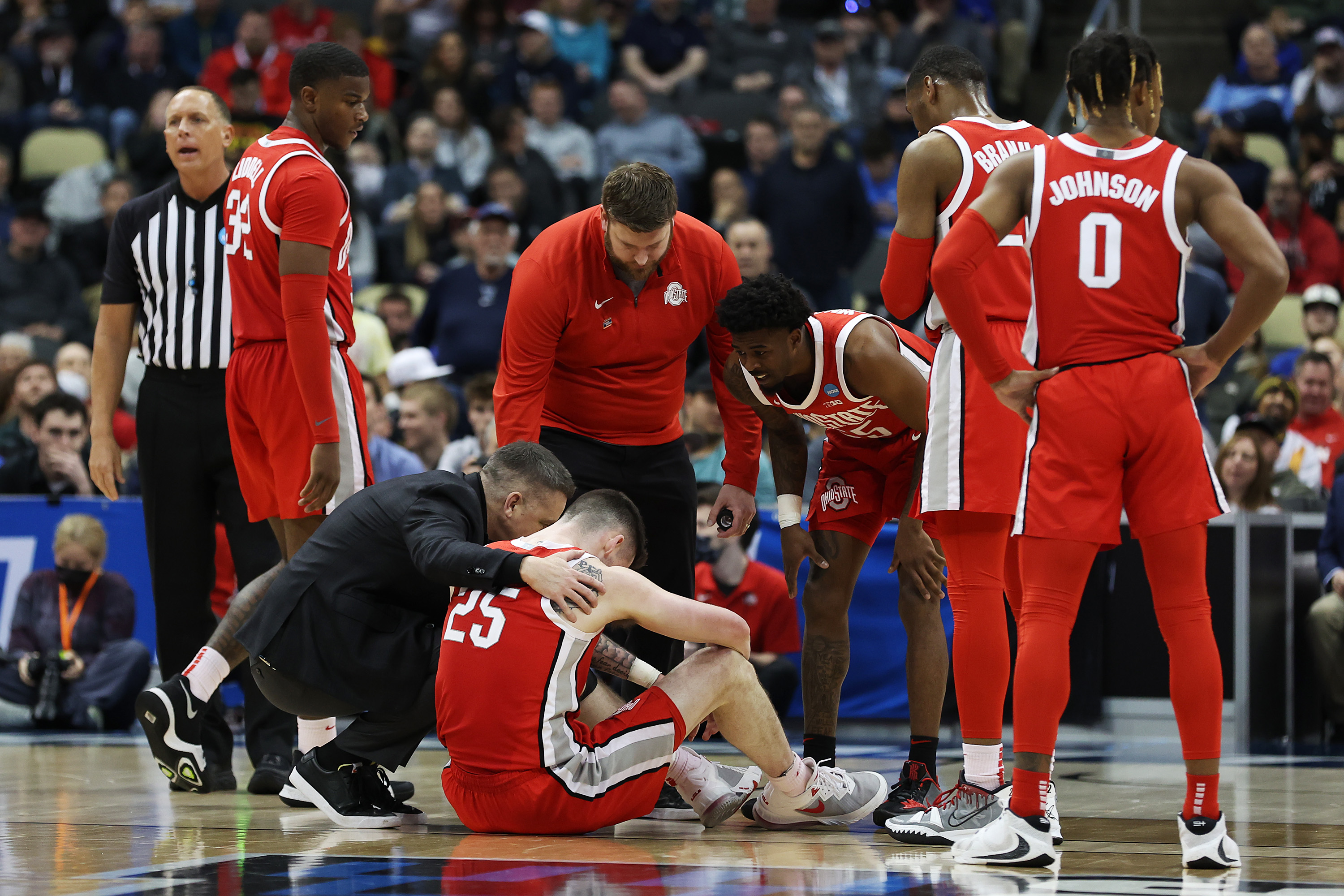 PITTSBURGH, PENNSYLVANIA – MARCH 20: Kyle Young #25 of the Ohio State Buckeyes is assessed for injury in the second half of the game against the Villanova Wildcats during the second round of the 2022 NCAA Men’s Basketball Tournament at PPG PAINTS Arena on March 20, 2022 in Pittsburgh, Pennsylvania. (Photo by Rob Carr/Getty Images)