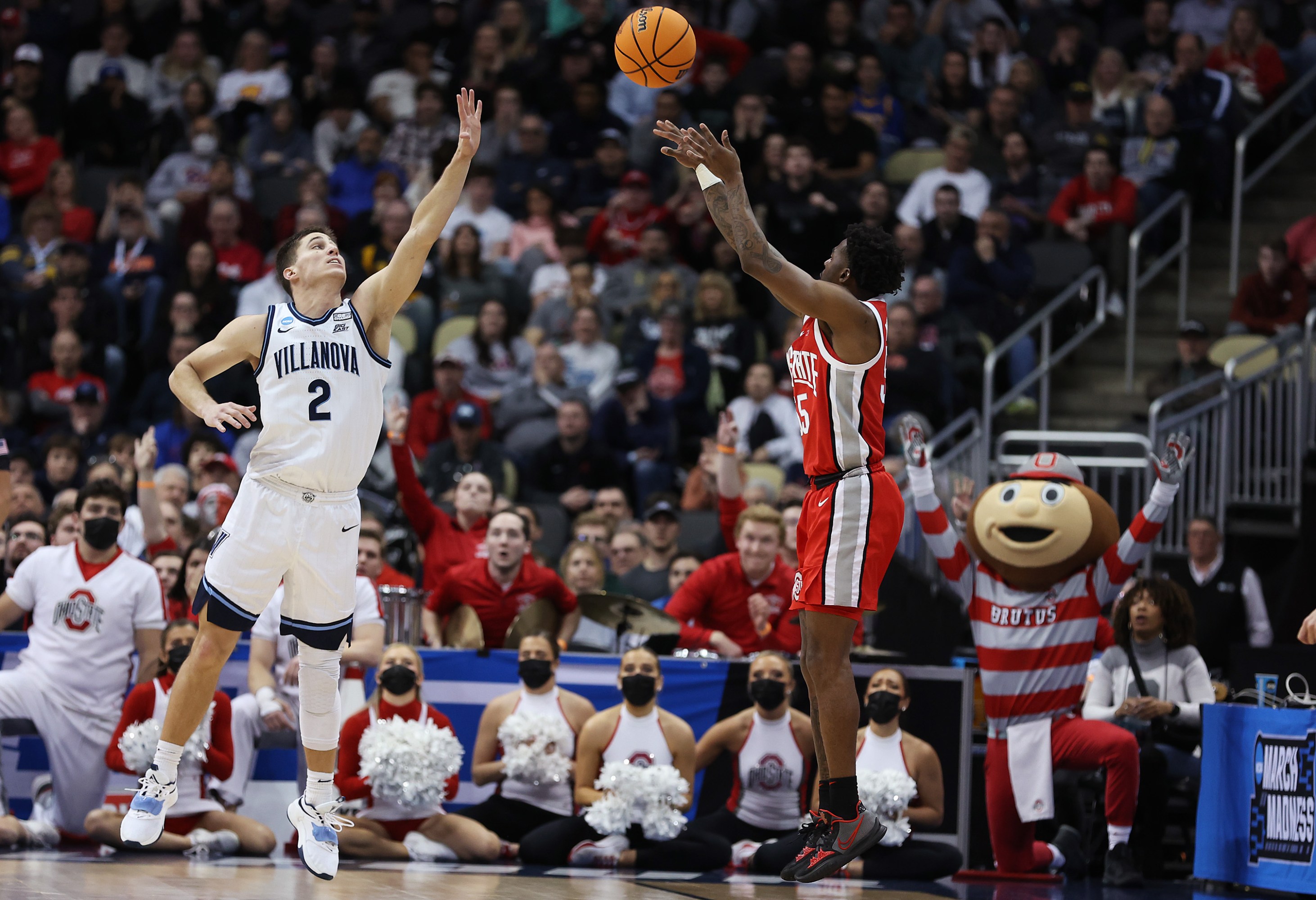PITTSBURGH, PENNSYLVANIA – MARCH 20: Jamari Wheeler #55 of the Ohio State Buckeyes shoots the ball for three points as Collin Gillespie #2 of the Villanova Wildcats defends in the second half of the game during the second round of the 2022 NCAA Men’s Basketball Tournament at PPG PAINTS Arena on March 20, 2022 in Pittsburgh, Pennsylvania. (Photo by Rob Carr/Getty Images)