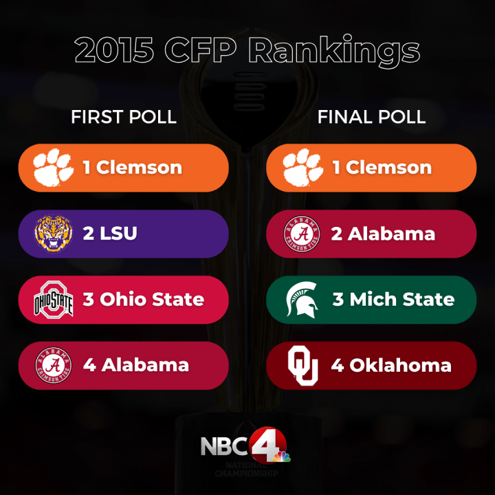 Nearly 60% of teams that are in the top four in the first CFP rankings end up in the playoff semifinals. The first team to get that coveted top ranking has made the playoffs on all but two occasions (2022 Tennessee and 2014 Mississippi State).