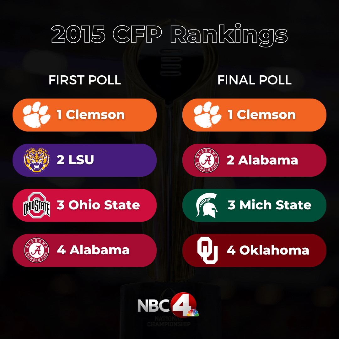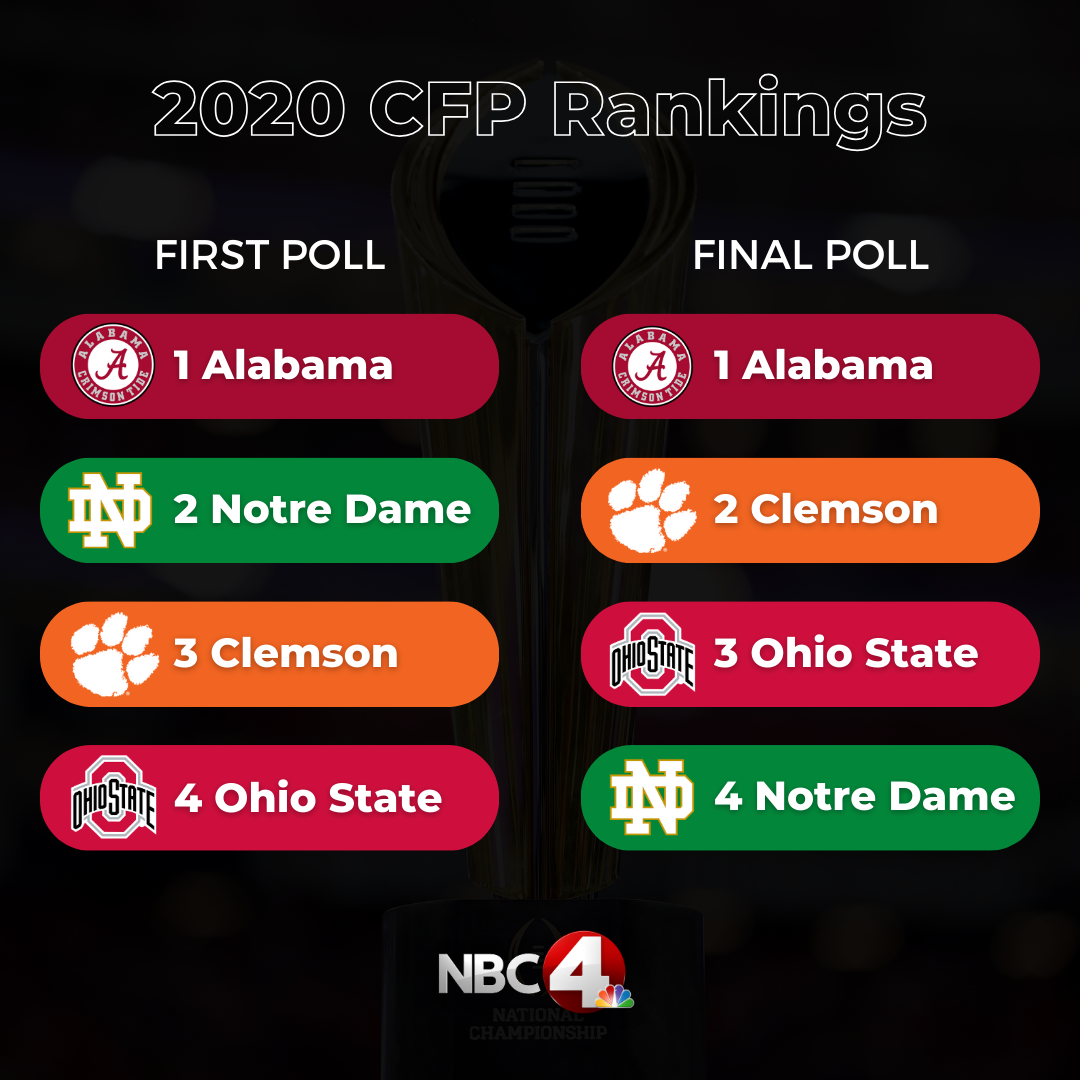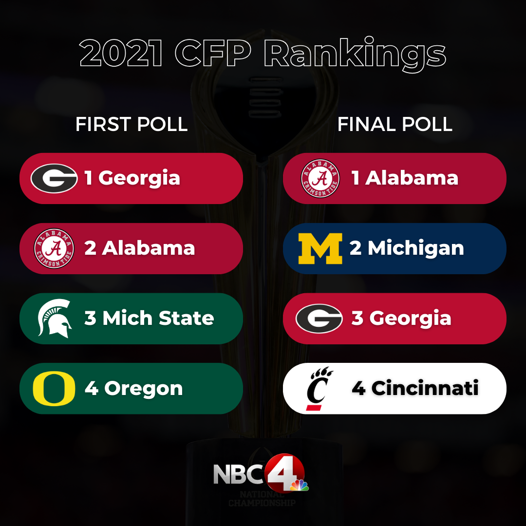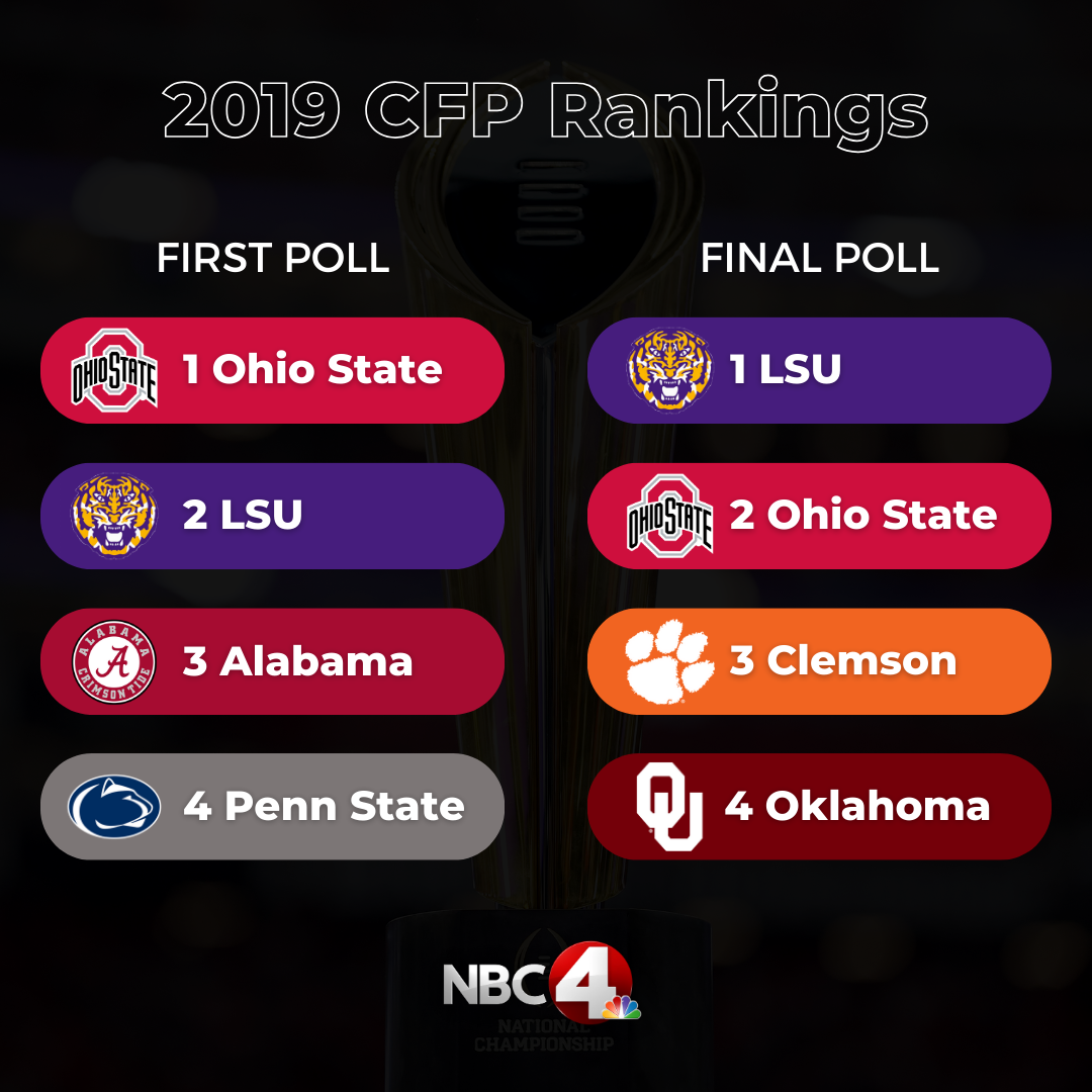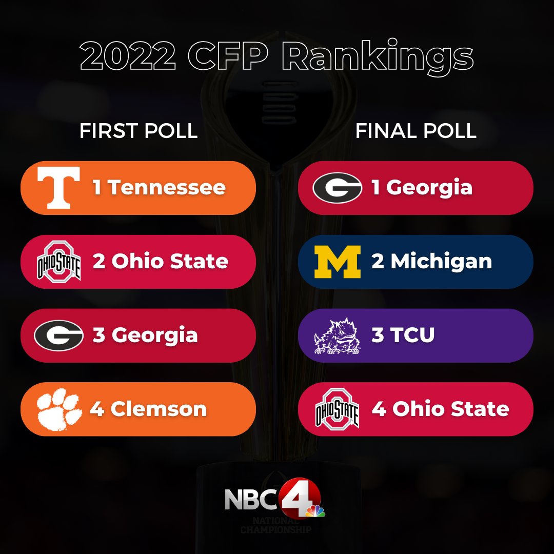 COLUMBUS, Ohio (WCMH) — For the final time, the College Football Playoff will only be contested by four teams and in the first rankings of 2023, the Ohio State Buckeyes are at the top.