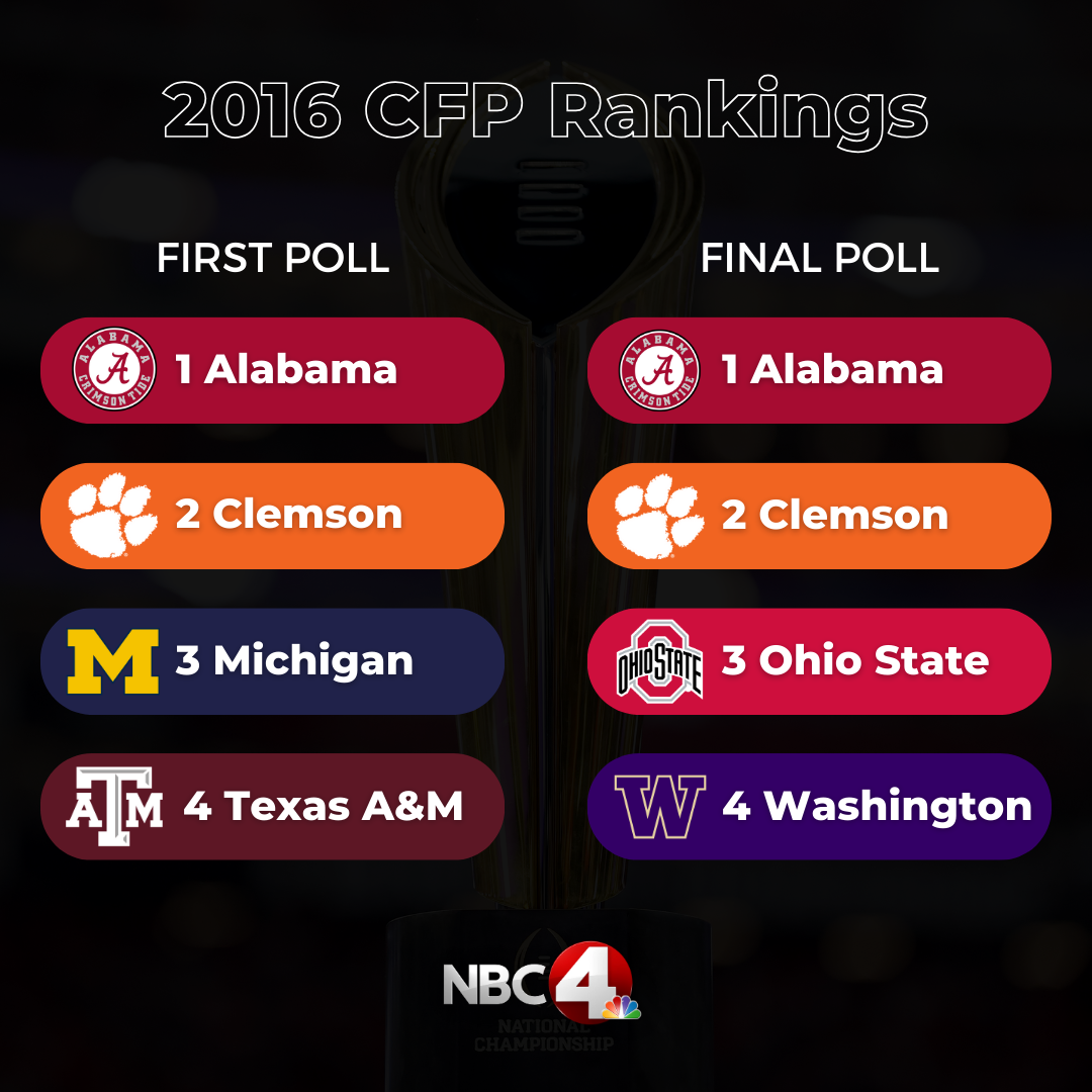 The first two teams out are No. 5 Washington and No. 6 Oregon. Since the CFP’s inception, 44% of teams that enter the first rankings at No. 5 and No. 6 have ended up making the playoffs.