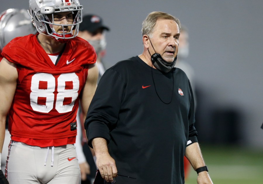 Ohio State offensive coordinator Kevin Wilson, right, is seen with tight end Jeremy Ruckert during an NCAA college football practice in Columbus, Ohio, Monday, April 5, 2021. (AP Photo/Paul Vernon)