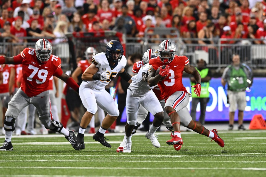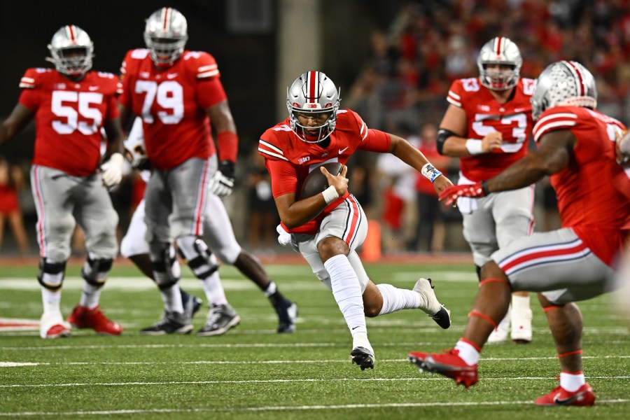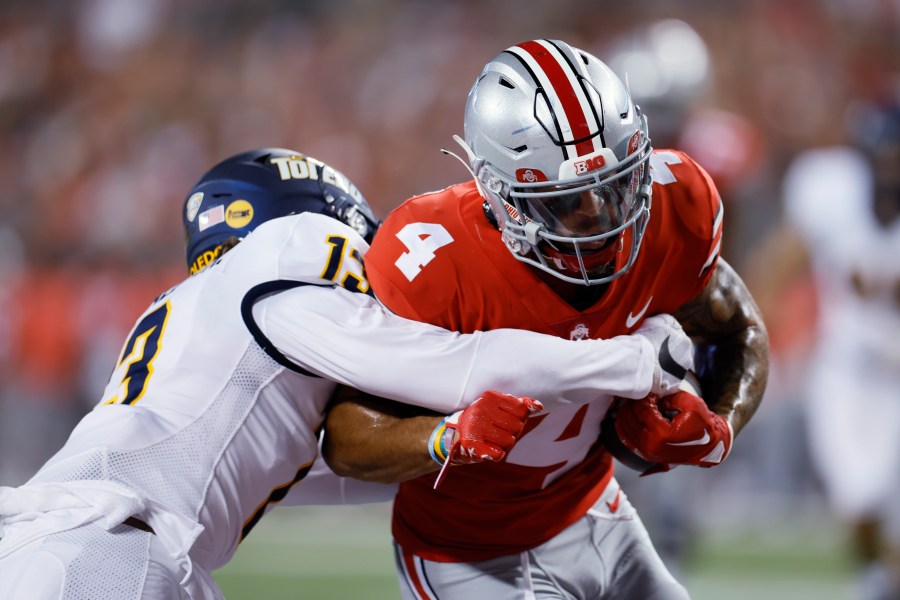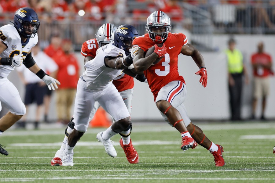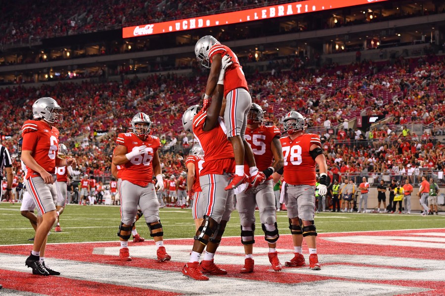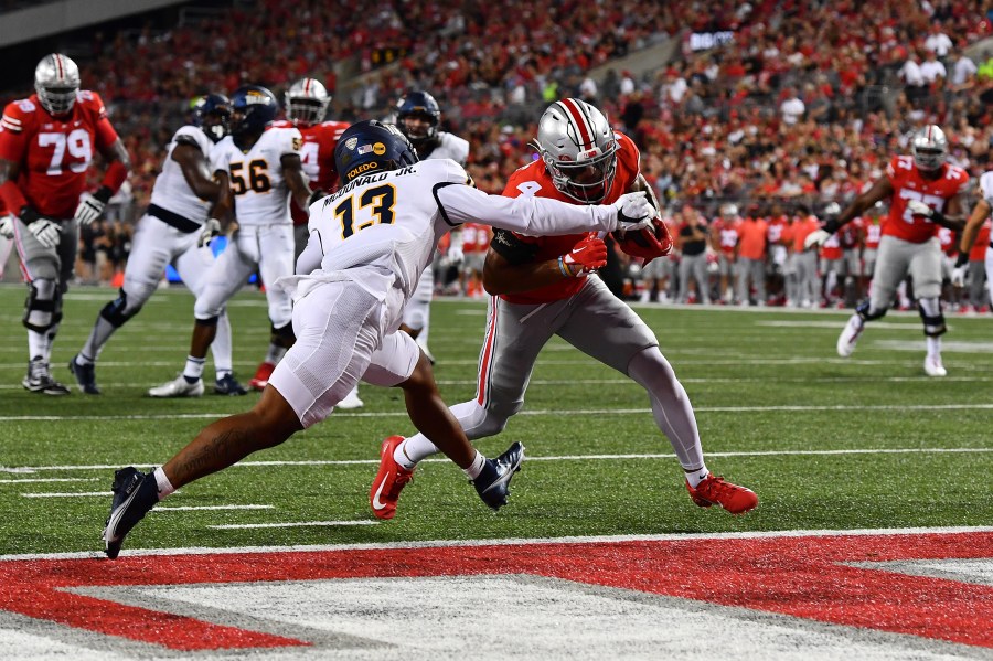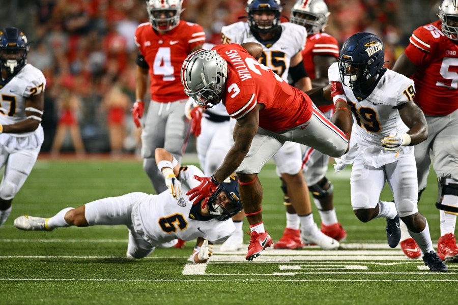 COLUMBUS, Ohio (WCMH) — Third-ranked Ohio State (3-0) had no problem beating one of the best teams in the Mid-American Conference, the Toledo Rockets (2-1), Saturday night at Ohio Stadium, putting on a clinic that saw the Buckeyes waltz away with a 77-21 victory.