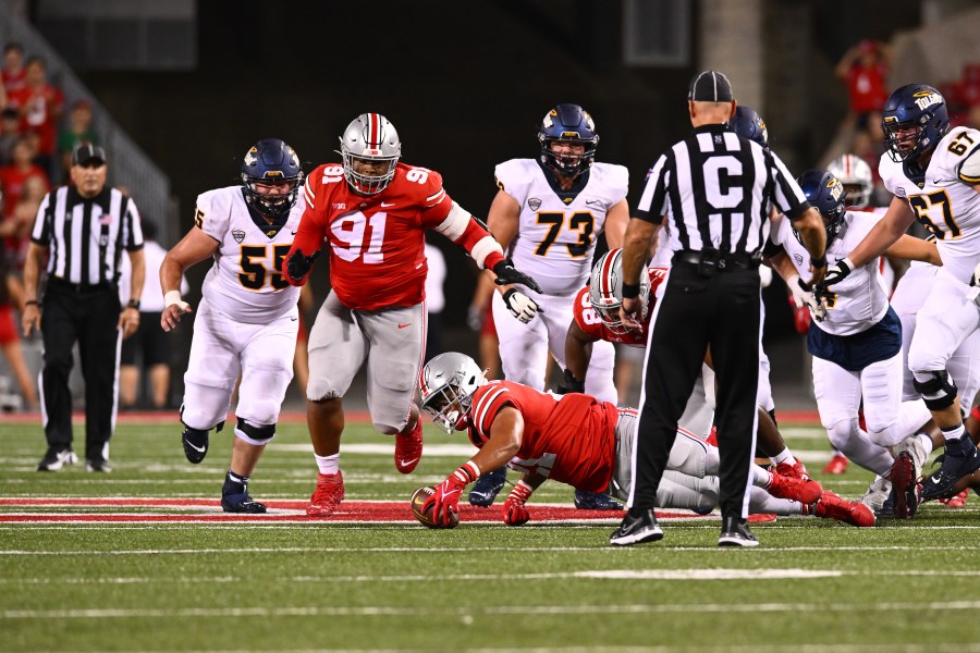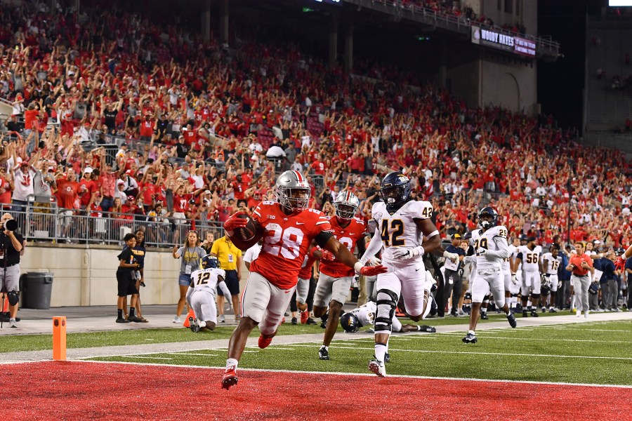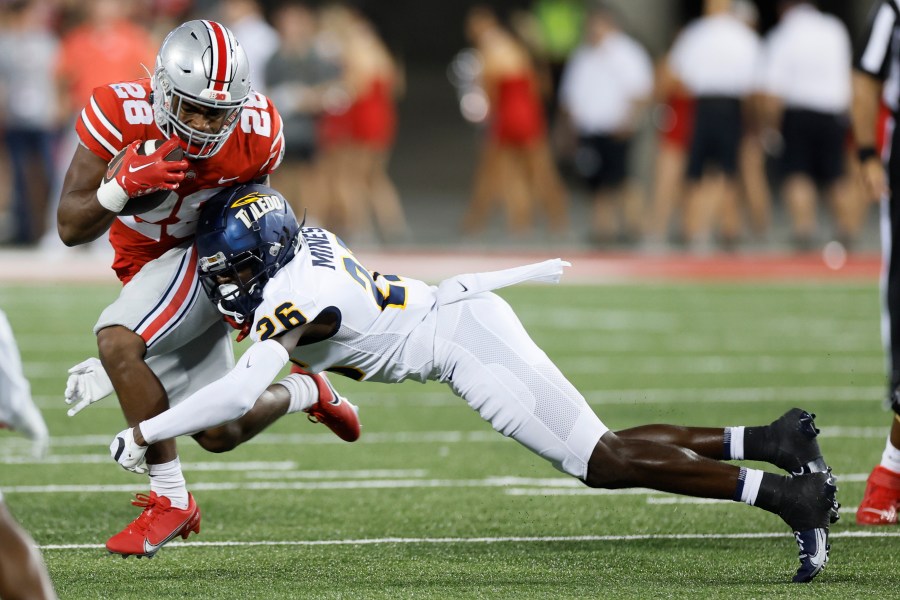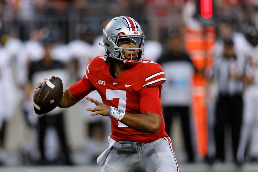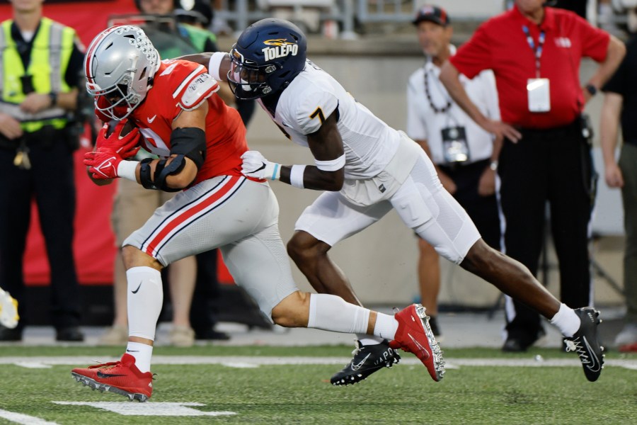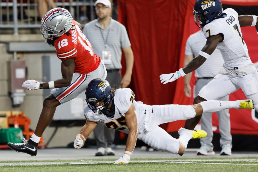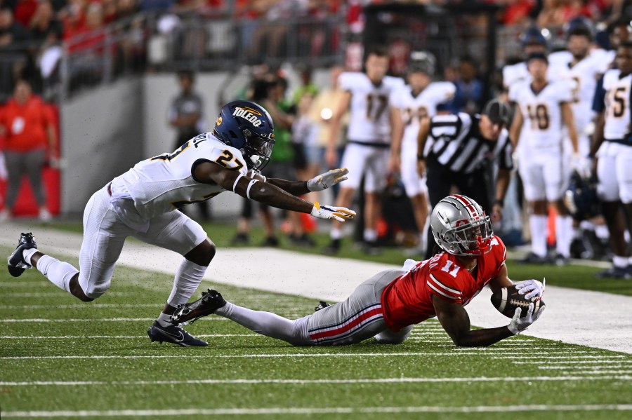 COLUMBUS, Ohio (WCMH) — Third-ranked Ohio State (3-0) had no problem beating one of the best teams in the Mid-American Conference, the Toledo Rockets (2-1), Saturday night at Ohio Stadium, putting on a clinic that saw the Buckeyes waltz away with a 77-21 victory.