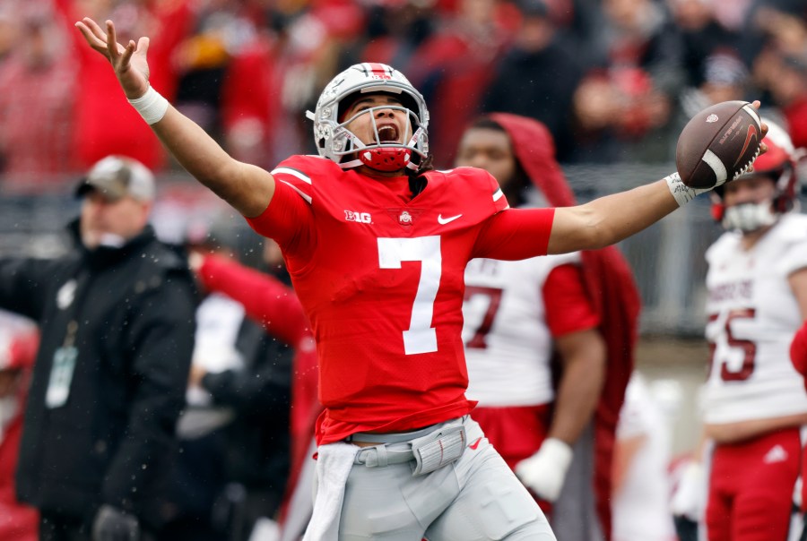 Ohio State quarterback C.J. Stroud celebrates after a long run against Indiana during the second half of an NCAA college football game Saturday, Nov. 12, 2022 in Columbus, Ohio. Ohio State won 56-14. (AP Photo/Paul Vernon)