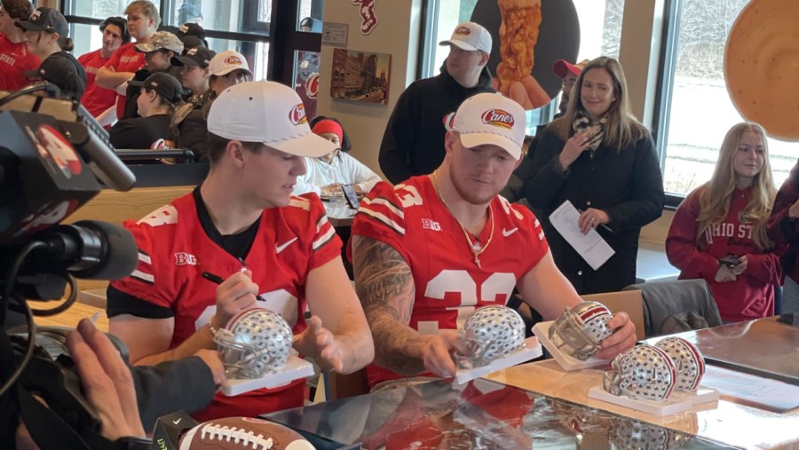 Howard and Sawyer, fresh off an Ohio State victory over Notre Dame in the CFP Championship in Atlanta, bagged orders, served customers, buttered some toast and signed autographs for dozens of fans, who waited in sub-zero temperatures outside of Raising Cane’s on Olentangy River Road, just north of the Ohio State campus.