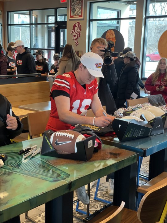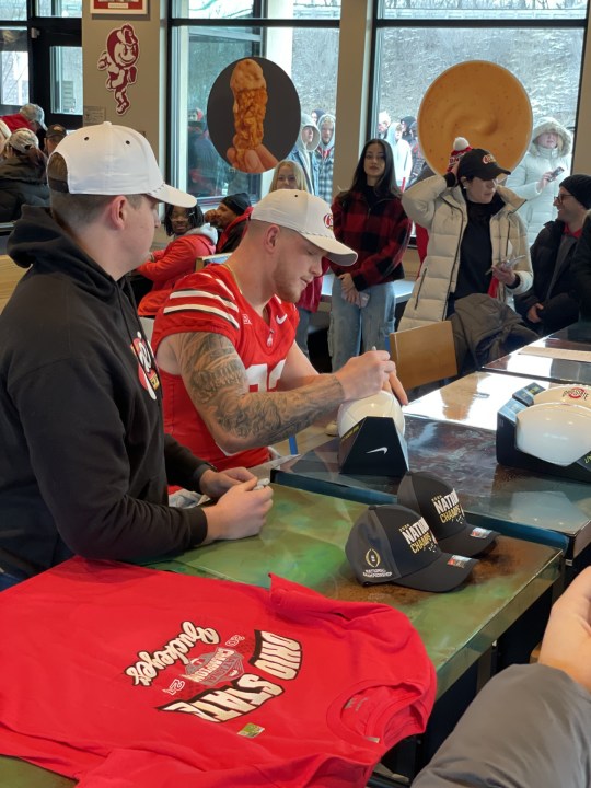The duo worked the drive-thru at the Riverview area location, where Buckeyes fans waited in a line out the door and around the restaurant to meet and greet Howard, the offensive MVP for the game at Atlanta’s Mercedes-Benz Stadium, and future 2025 NFL Draft first-round pick Sawyer. The players signed miniature footballs, commemorative footballs, t-shirts, and hats before their morning shift.
