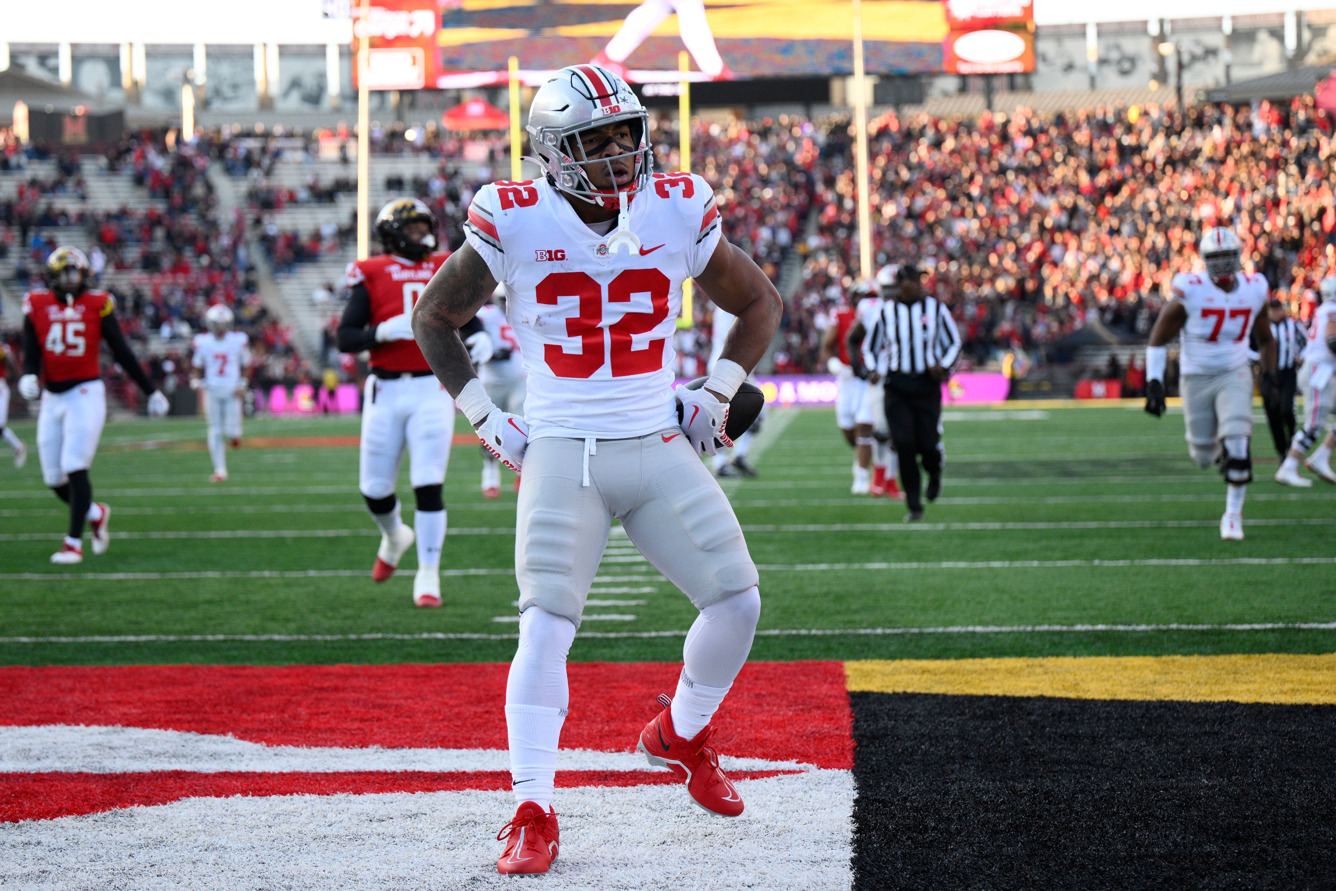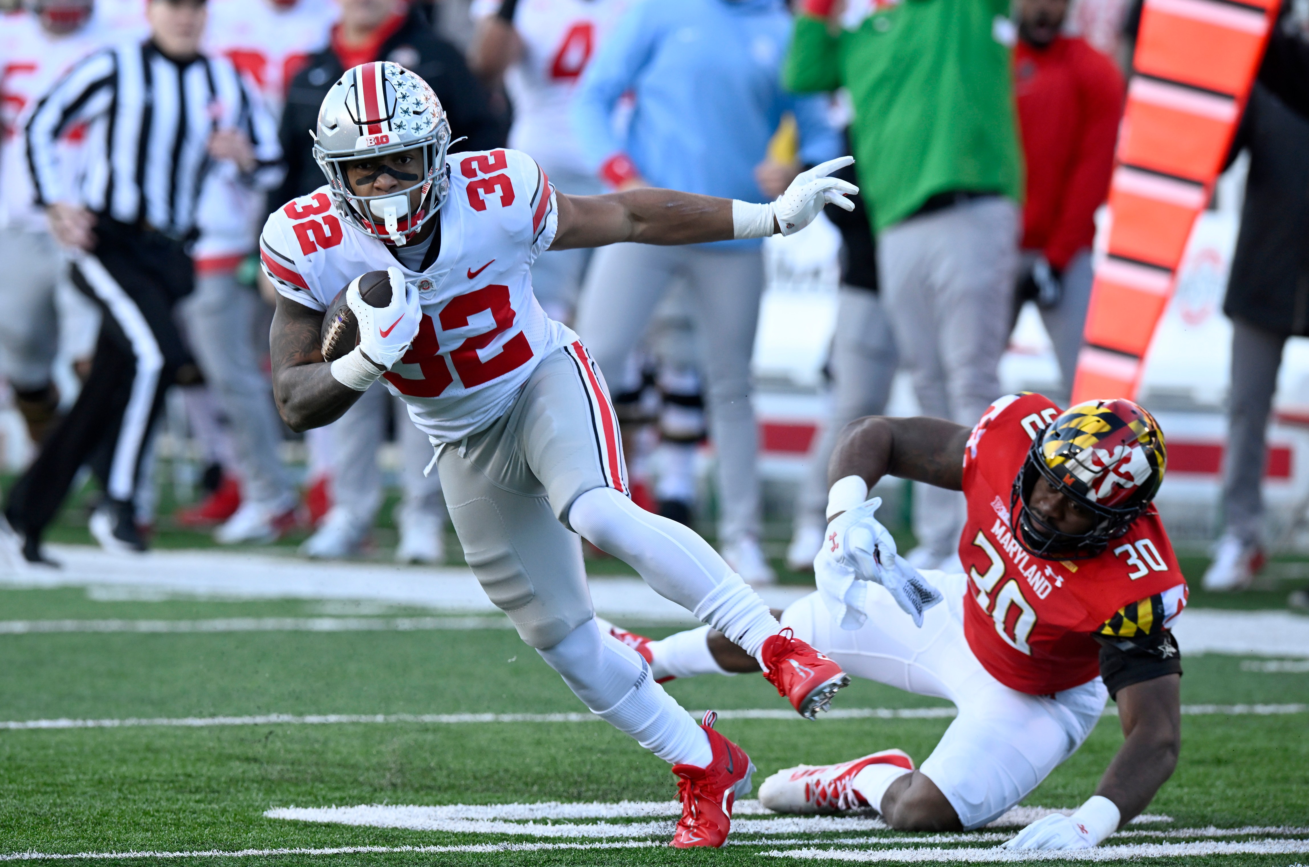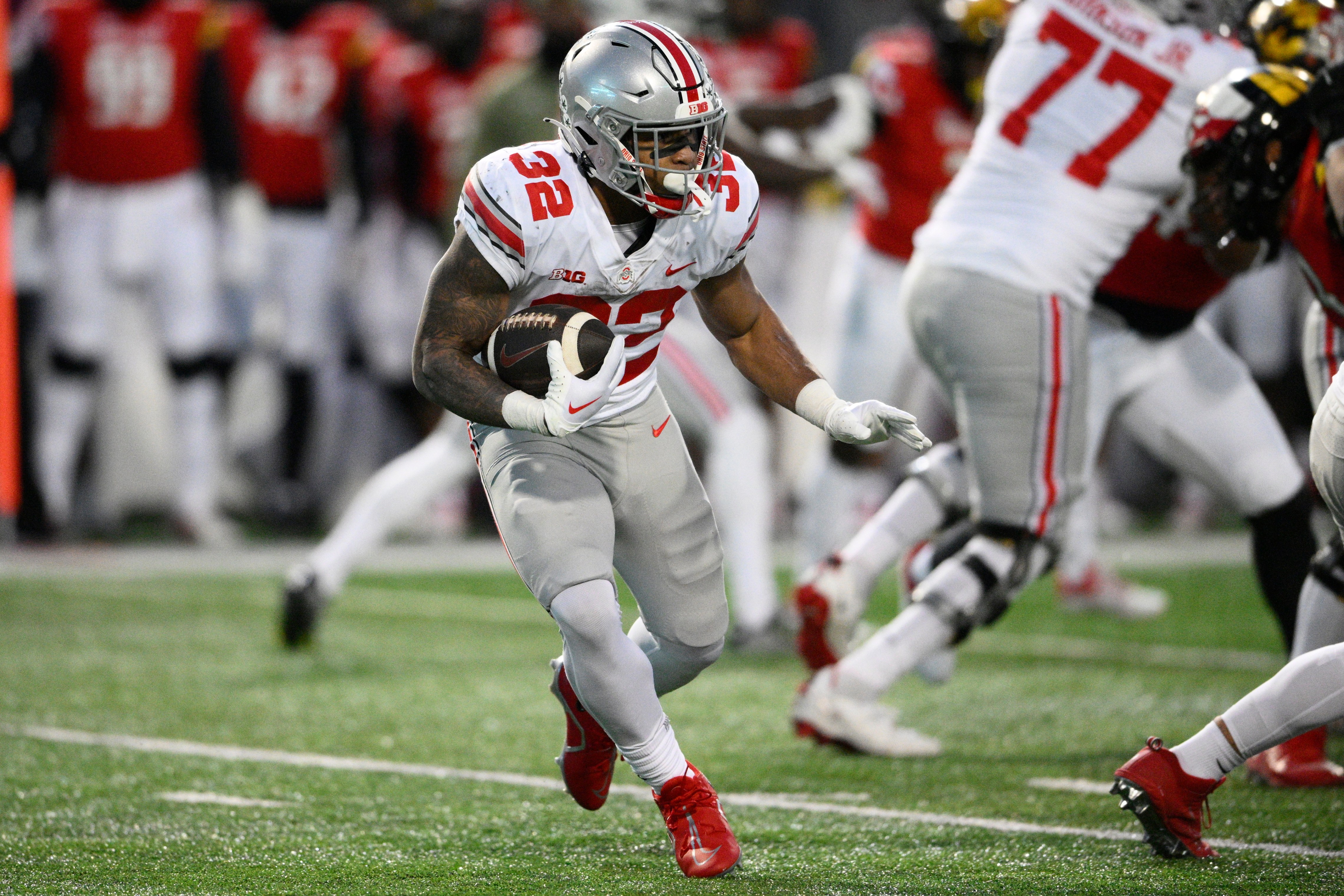 COLLEGE PARK, MARYLAND – NOVEMBER 19: TreVeyon Henderson #32 of the Ohio State Buckeyes rushes the ball in the second quarter against the Maryland Terrapins at SECU Stadium on November 19, 2022 in College Park, Maryland. (Photo by Greg Fiume/Getty Images)