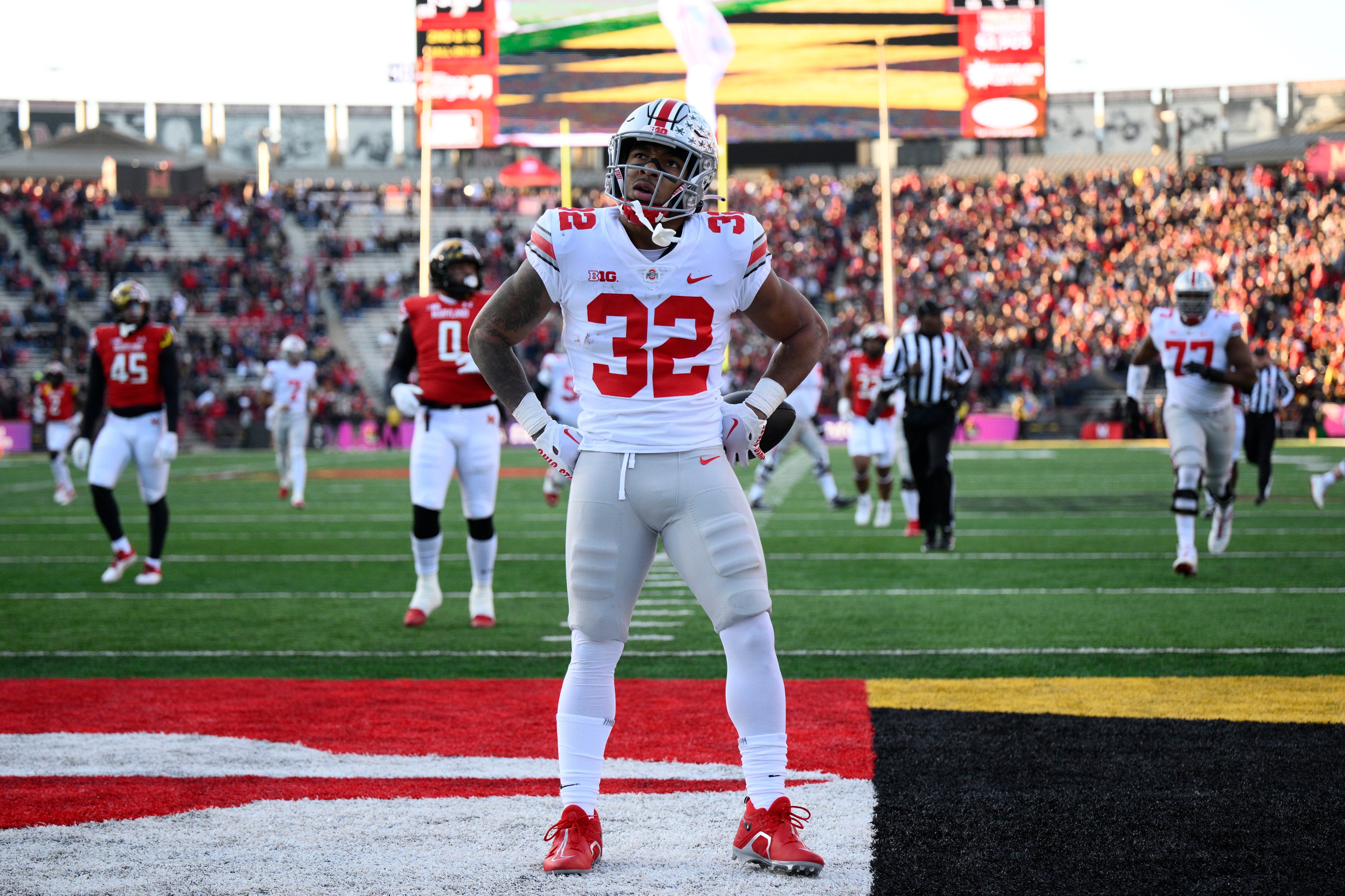 COLLEGE PARK, MARYLAND – NOVEMBER 19: TreVeyon Henderson #32 of the Ohio State Buckeyes runs in for a touchdown after making a catch in the first quarter against the Maryland Terrapins at SECU Stadium on November 19, 2022 in College Park, Maryland. (Photo by Greg Fiume/Getty Images)