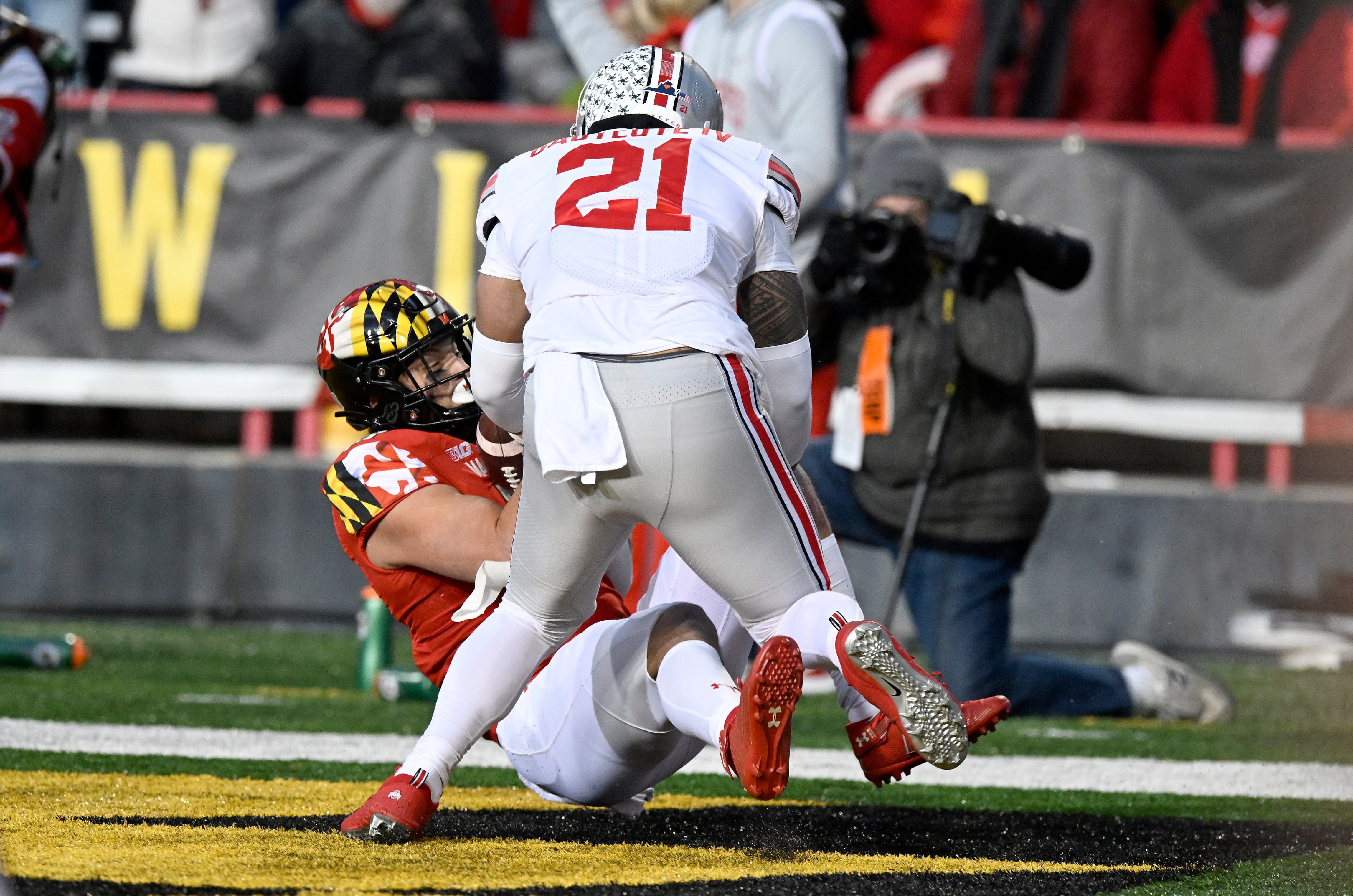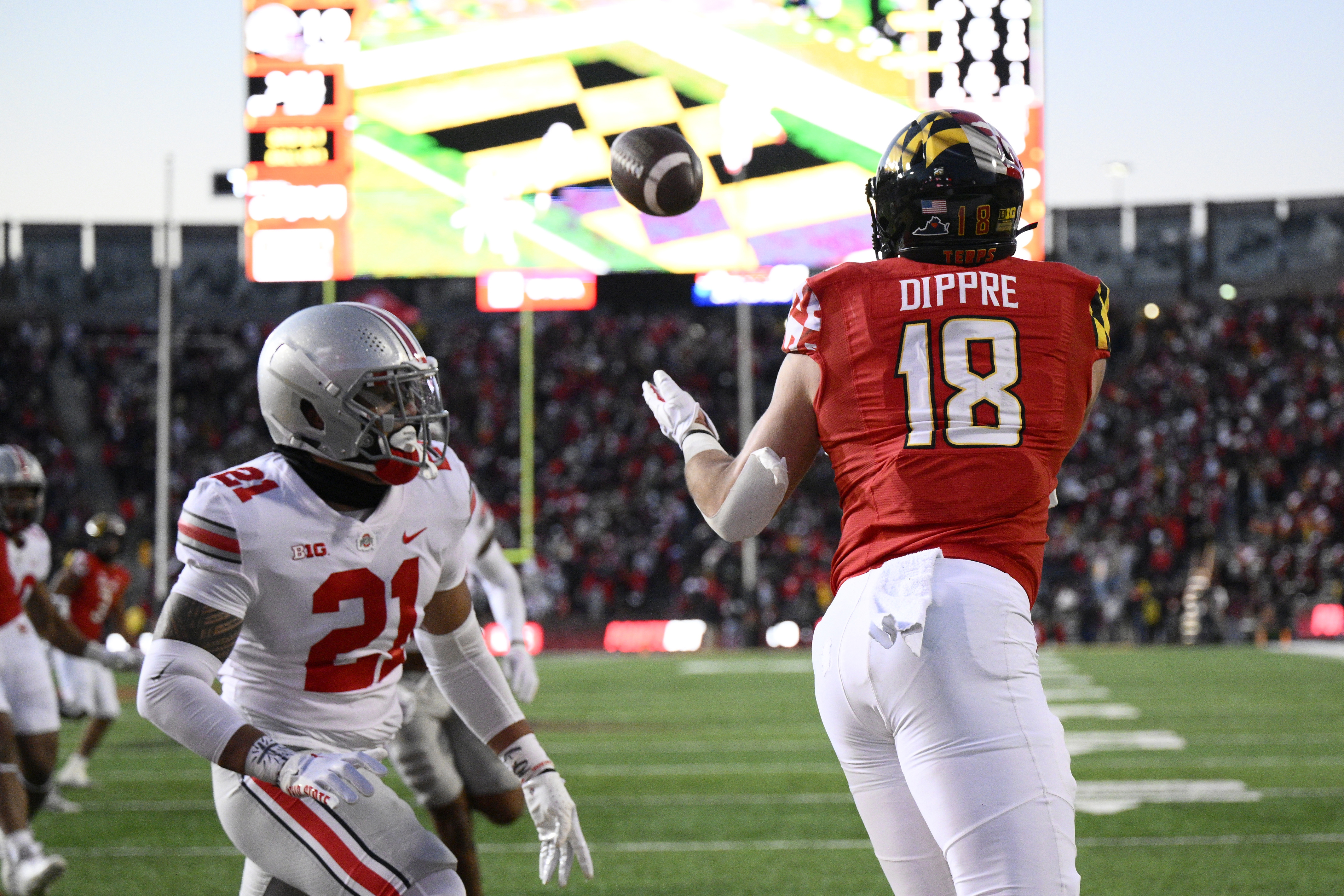 COLLEGE PARK, MARYLAND – NOVEMBER 19: CJ Dippre #18 of the Maryland Terrapins scores a touchdown in the second quarter against Palaie Gaoteote IV #21 of the Ohio State Buckeyes at SECU Stadium on November 19, 2022 in College Park, Maryland. (Photo by Greg Fiume/Getty Images)