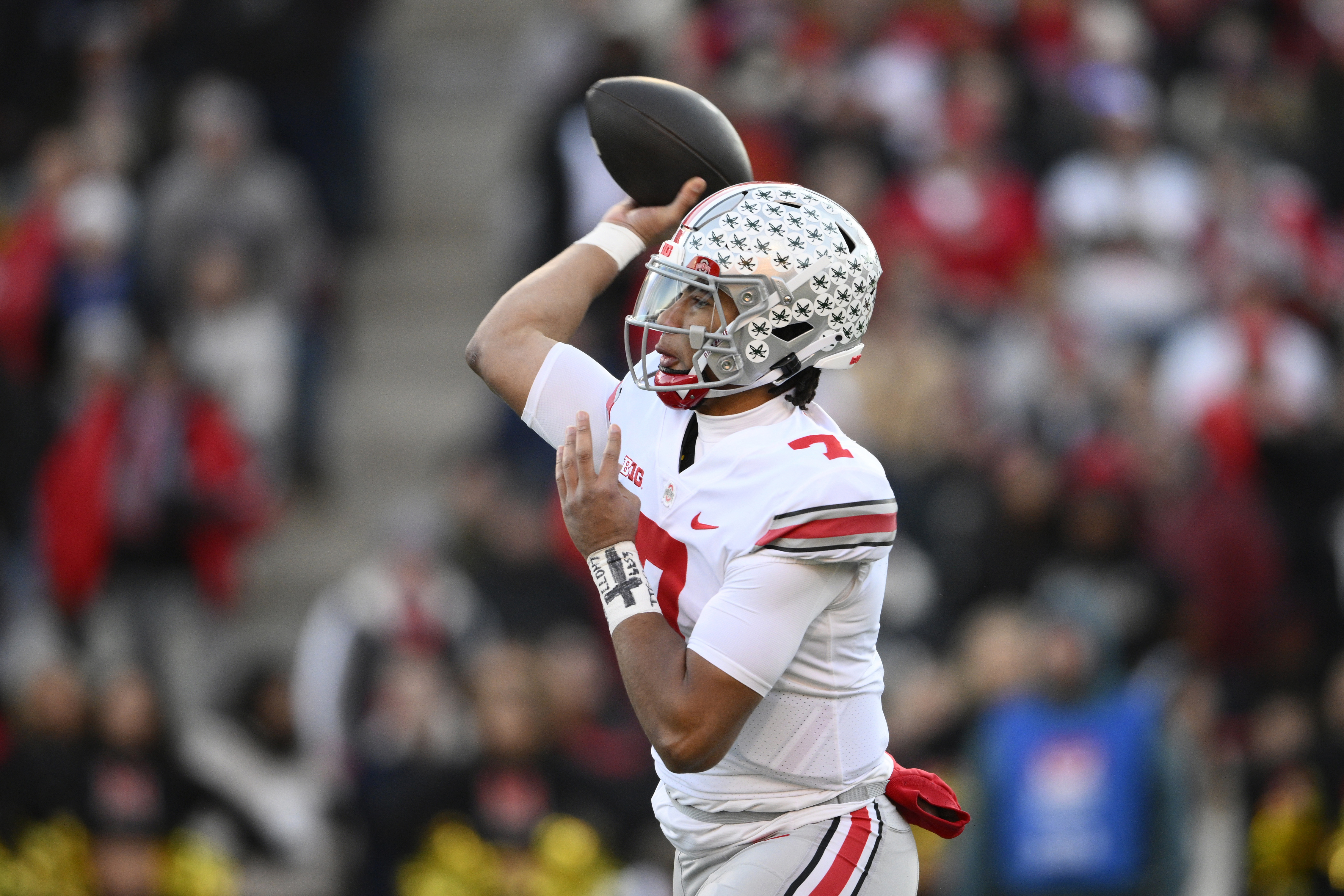 COLLEGE PARK, MARYLAND – NOVEMBER 19: C.J. Stroud #7 of the Ohio State Buckeyes throws a pass against the Maryland Terrapins in the second quarter at SECU Stadium on November 19, 2022 in College Park, Maryland. (Photo by Greg Fiume/Getty Images)