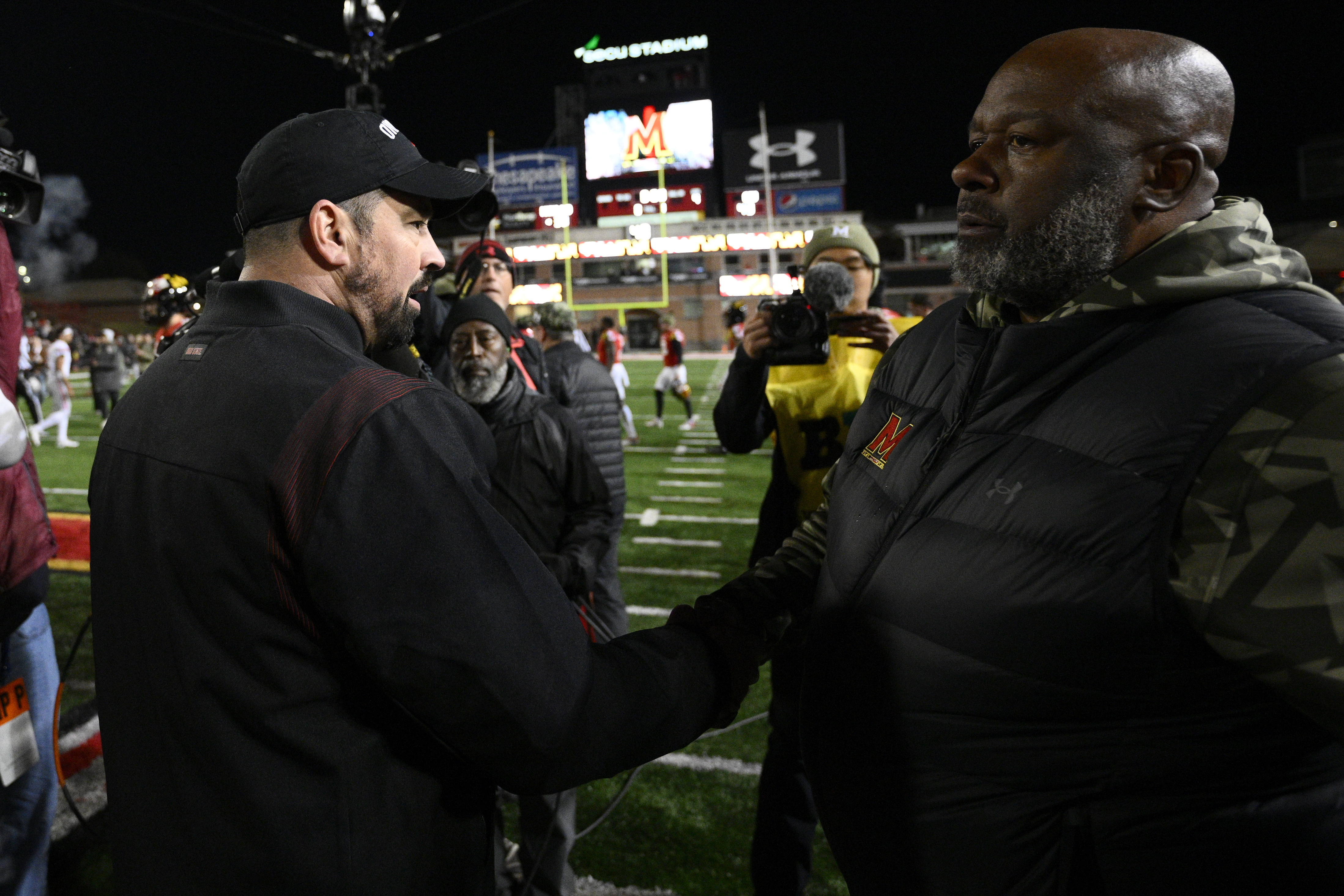 Ohio State head coach Ryan Day, left, shakes hands with Maryland head coach Mike Locksley after an NCAA college football game, Saturday, Nov. 19, 2022, in College Park, Md. Ohio State won 43-30. (AP Photo/Nick Wass)