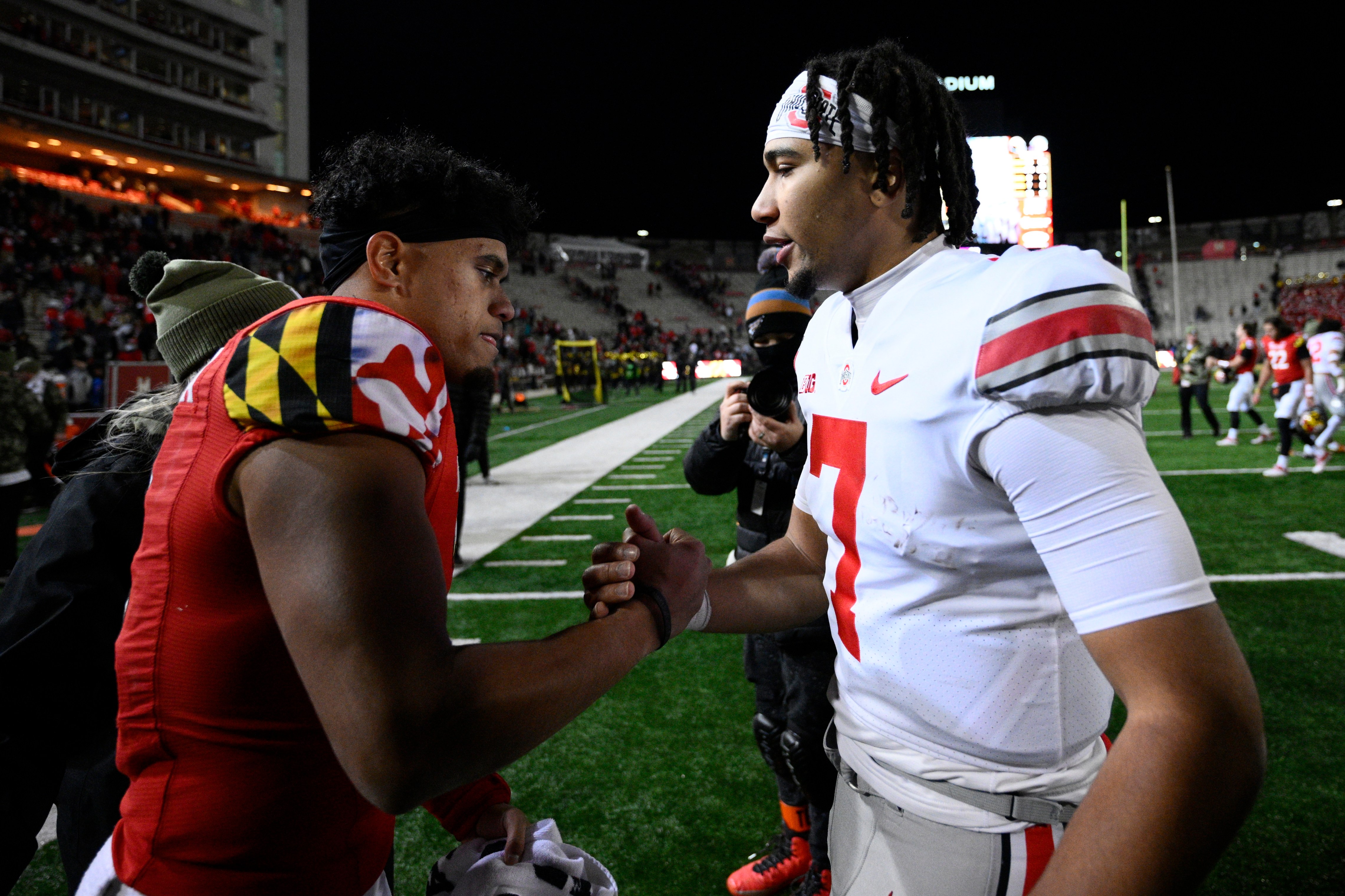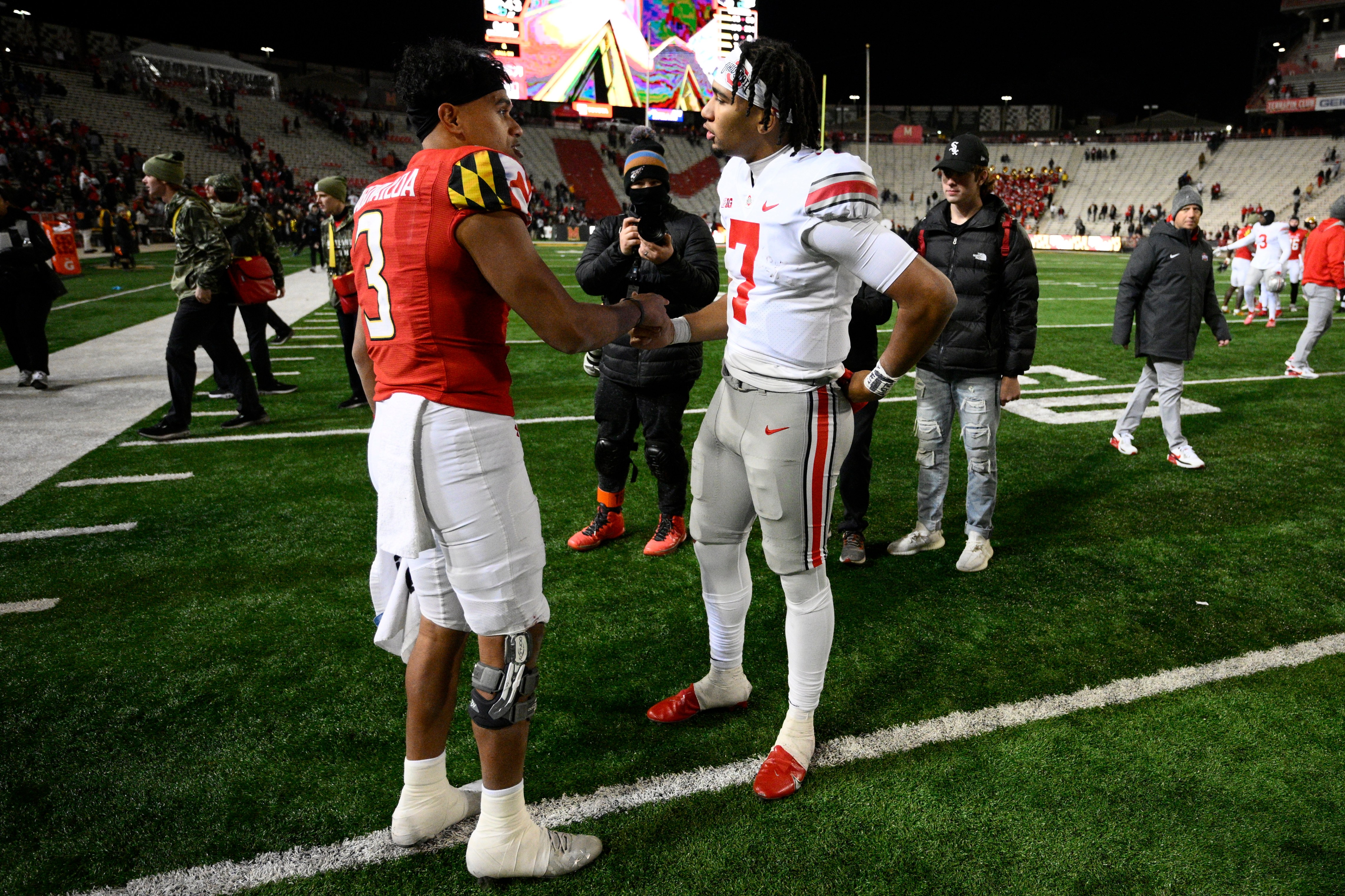 Ohio State quarterback C.J. Stroud (7) shakes hands with Maryland quarterback Taulia Tagovailoa (3) after an NCAA college football game, Saturday, Nov. 19, 2022, in College Park, Md. Ohio State won 43-30. (AP Photo/Nick Wass)