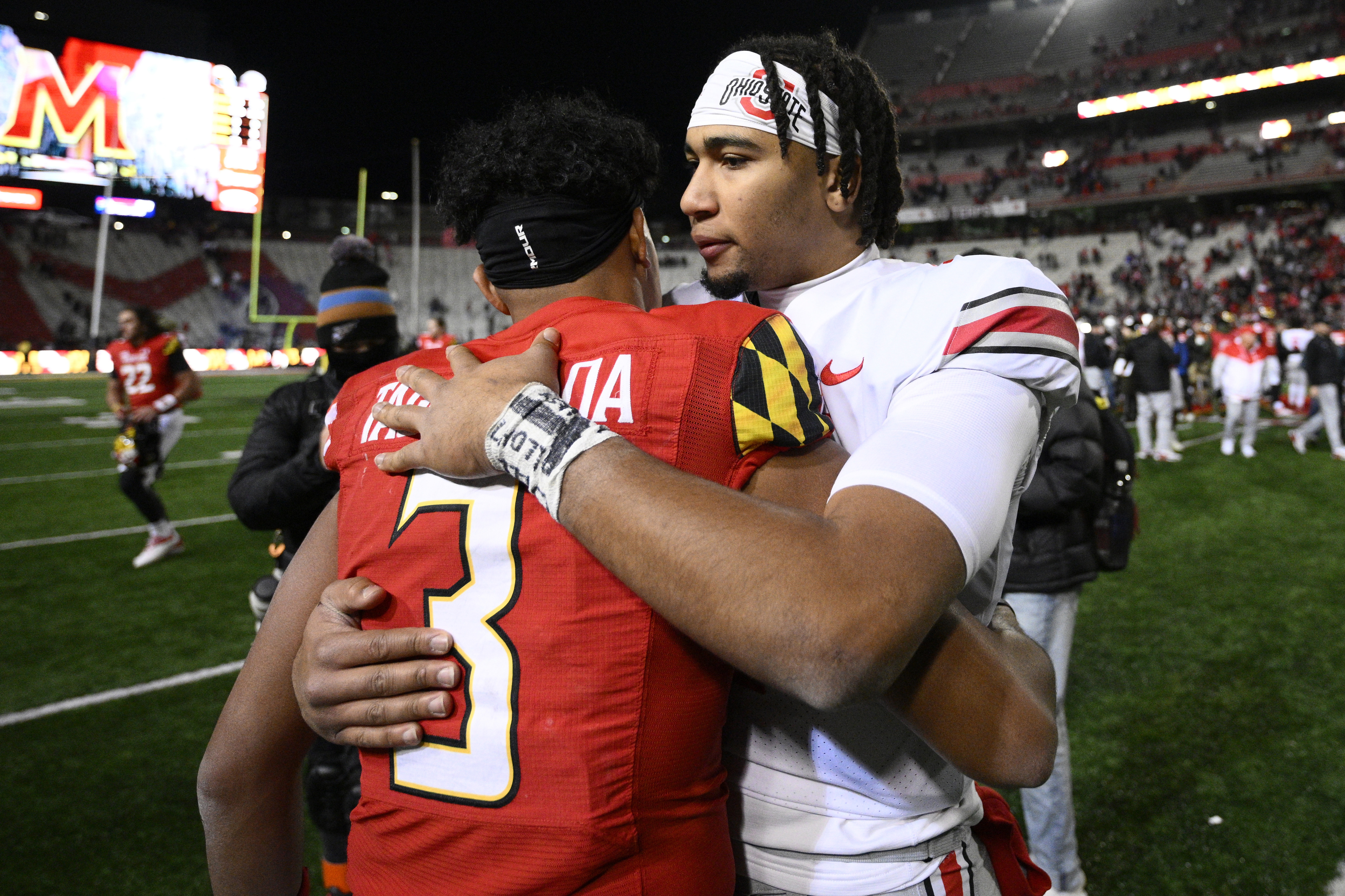 Ohio State quarterback C.J. Stroud (7) hugs Maryland quarterback Taulia Tagovailoa (3) after an NCAA college football game, Saturday, Nov. 19, 2022, in College Park, Md. Ohio State won 43-30. (AP Photo/Nick Wass)