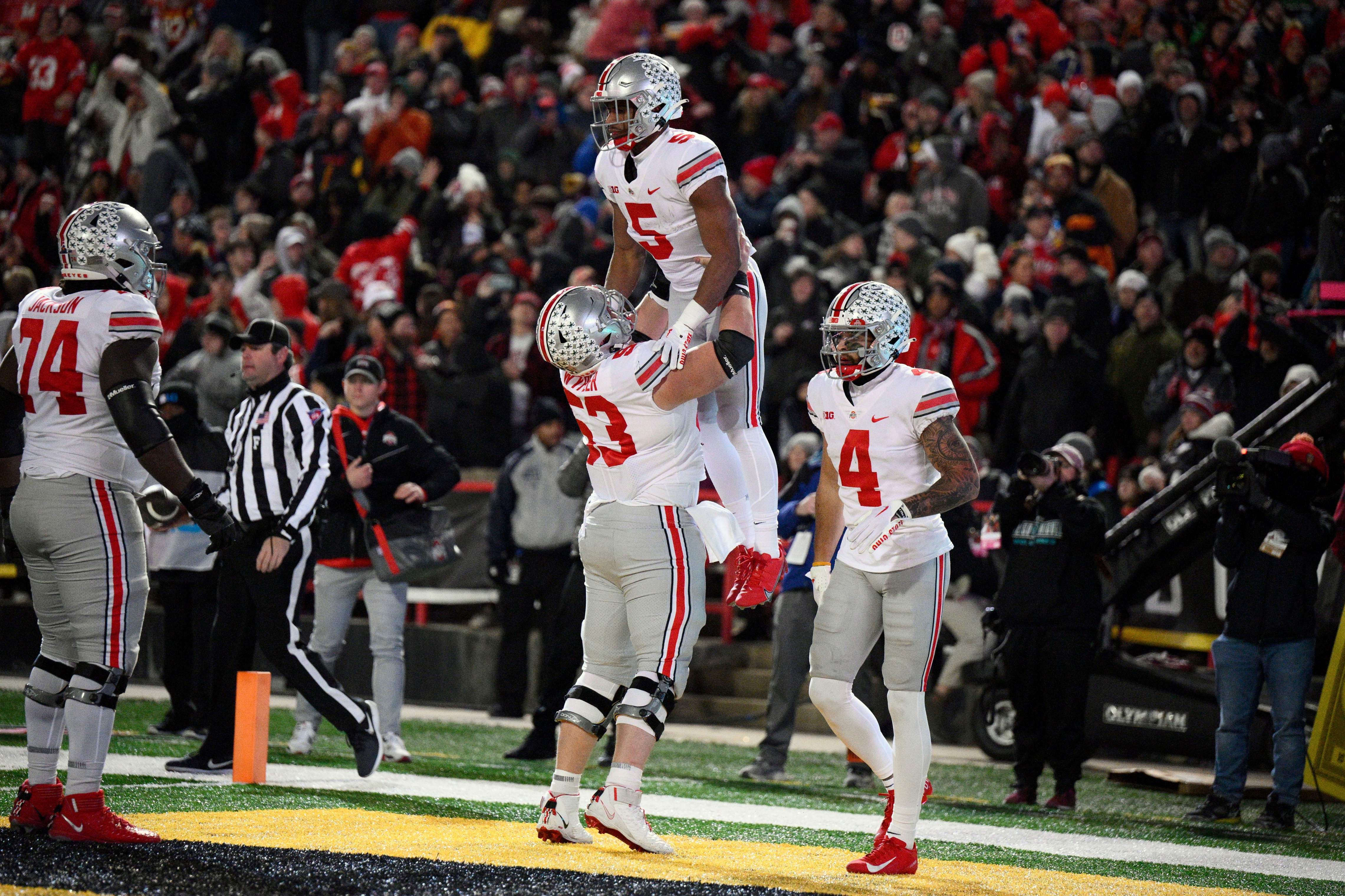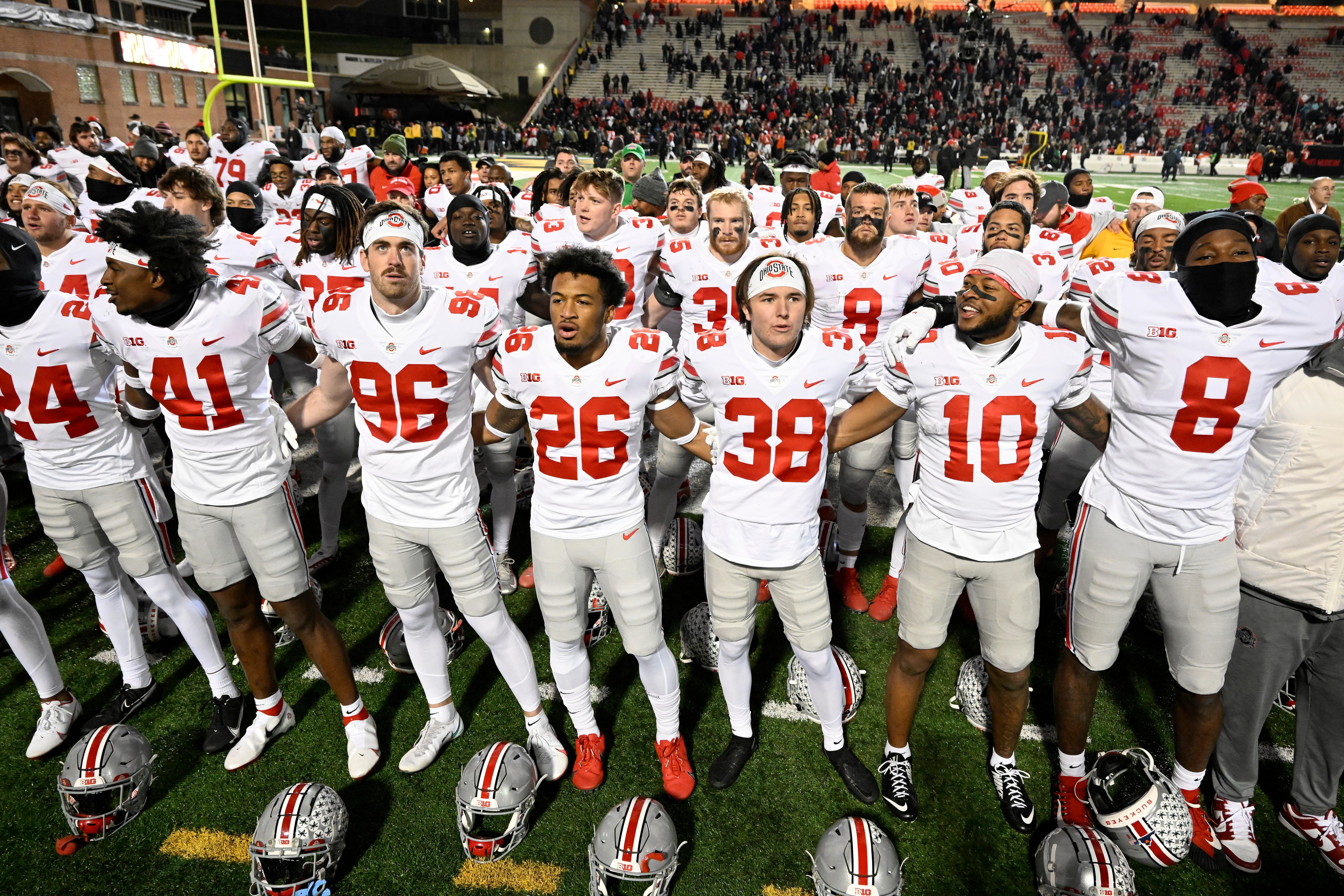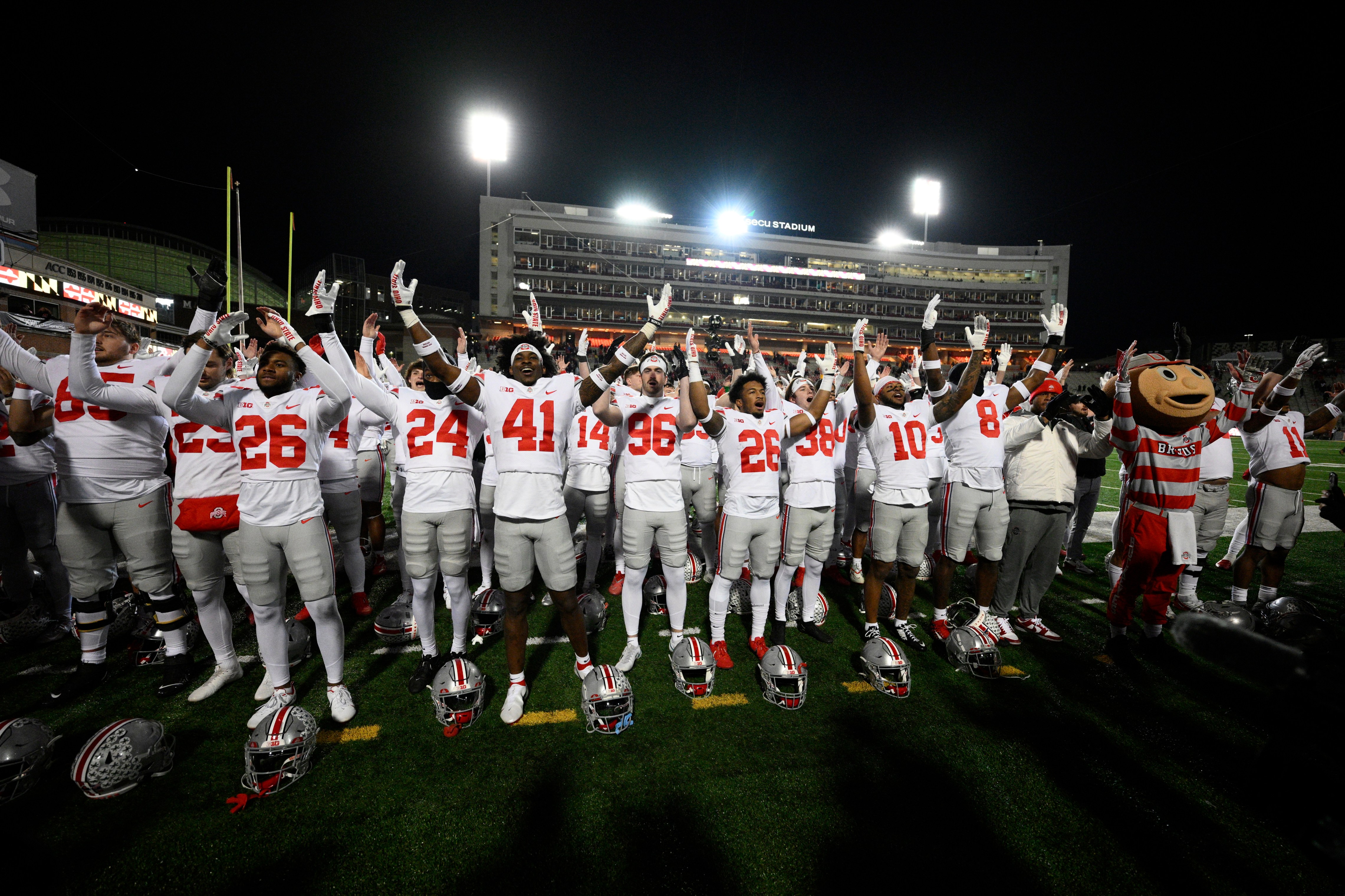 COLLEGE PARK, MARYLAND – NOVEMBER 19: The Ohio State Buckeyes celebrate after a 43-30 victory against the Maryland Terrapins at SECU Stadium on November 19, 2022 in College Park, Maryland. (Photo by Greg Fiume/Getty Images)