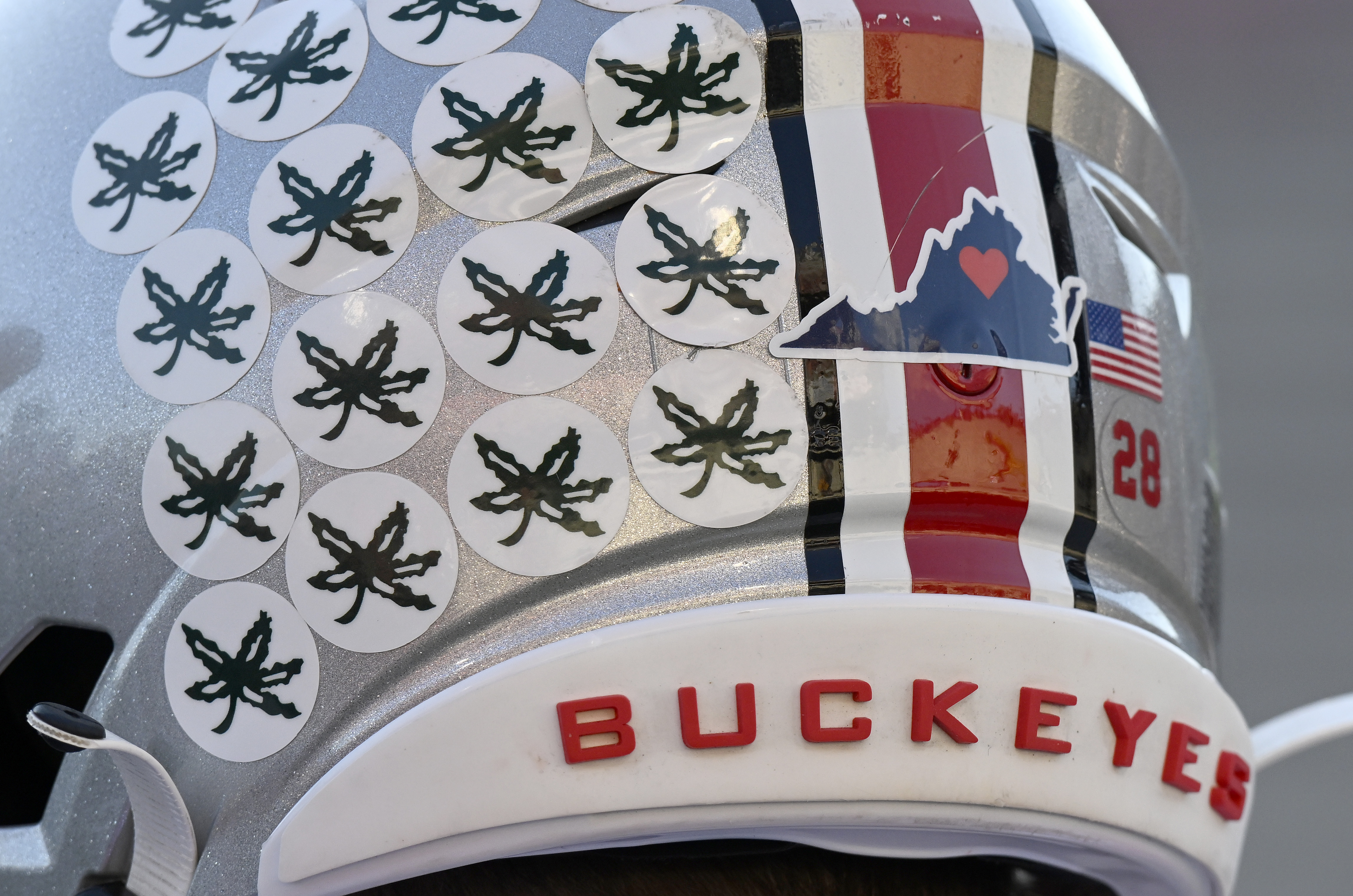 COLLEGE PARK, MARYLAND – NOVEMBER 19: The Ohio State Buckeyes wear a Virginia sticker on their helmet to honor the shooting victims from the University of Virginia during the game against the Maryland Terrapins at SECU Stadium on November 19, 2022 in College Park, Maryland. (Photo by Greg Fiume/Getty Images)