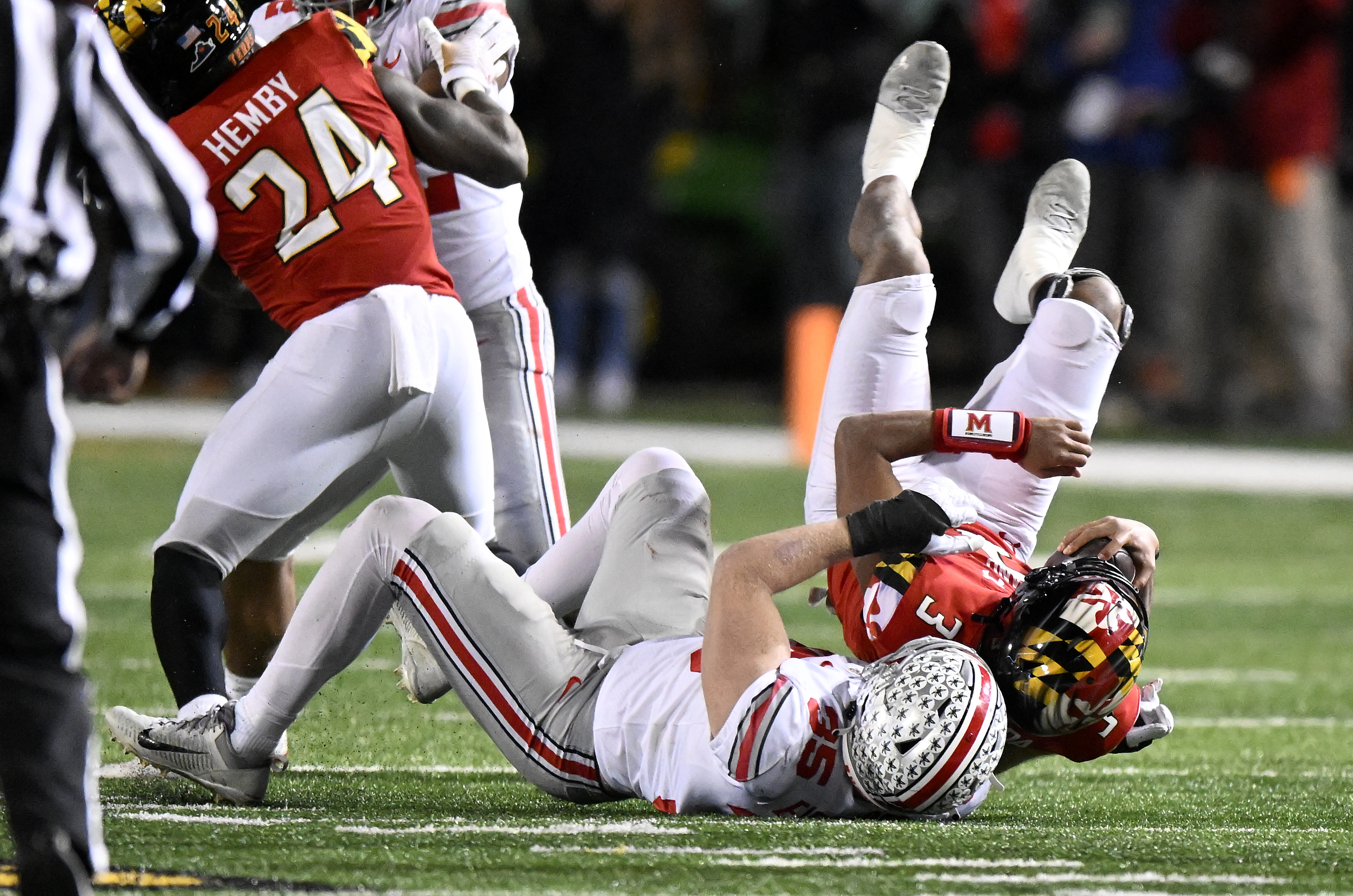 COLLEGE PARK, MARYLAND – NOVEMBER 19: Tommy Eichenberg #35 of the Ohio State Buckeyes sacks Taulia Tagovailoa #3 of the Maryland Terrapins in the third quarter at SECU Stadium on November 19, 2022 in College Park, Maryland. (Photo by Greg Fiume/Getty Images)