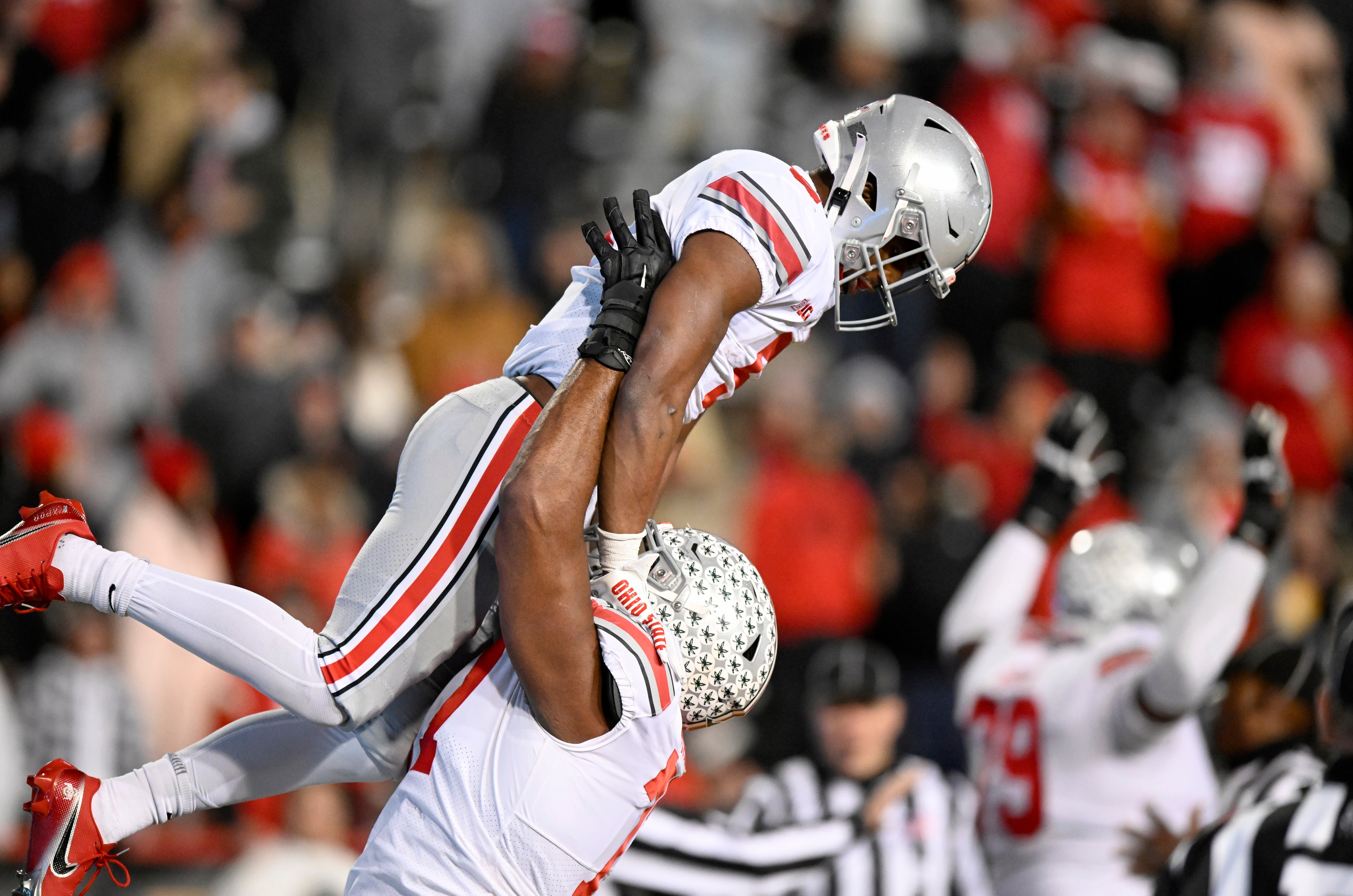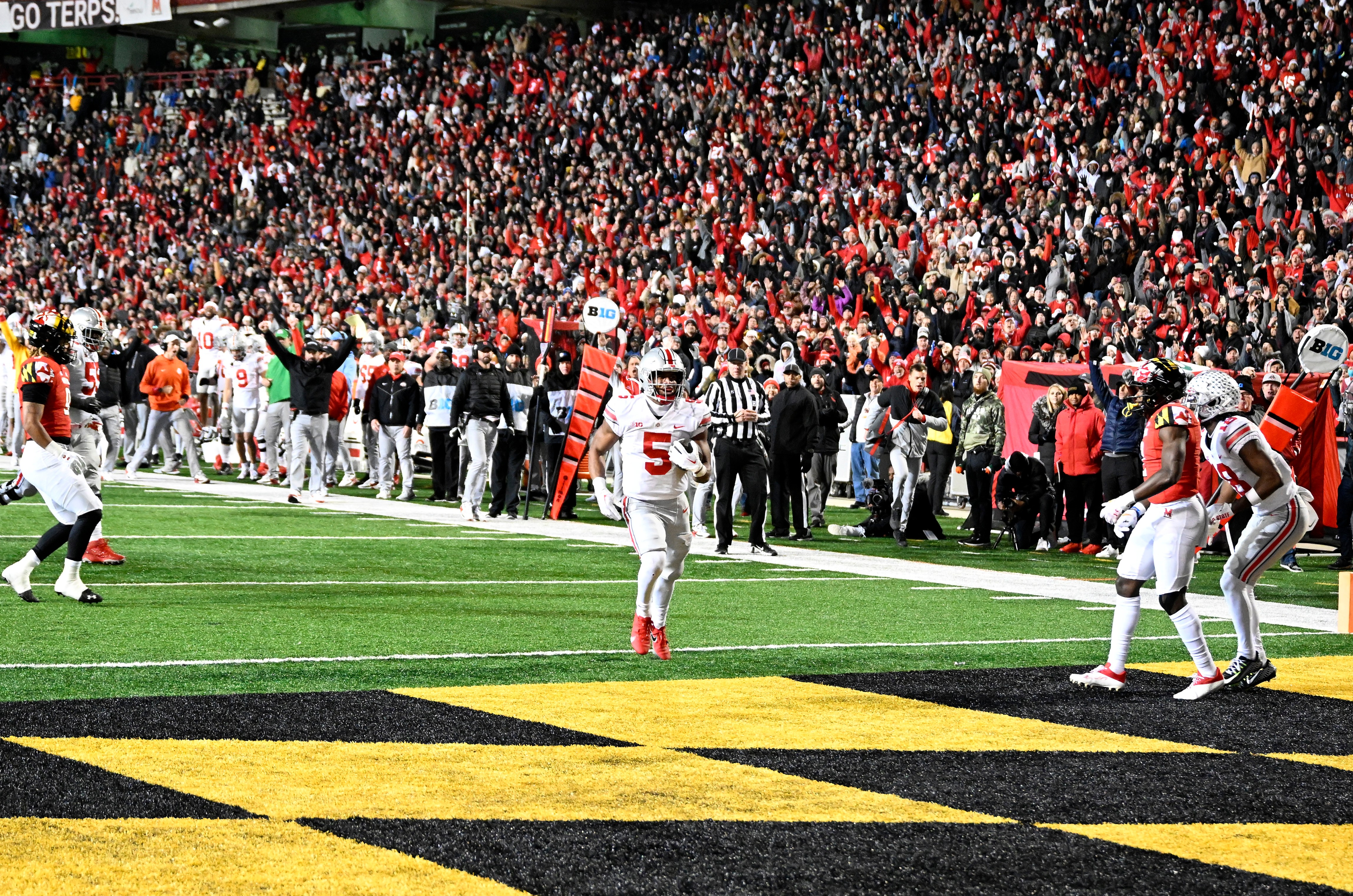COLLEGE PARK, MARYLAND – NOVEMBER 19: Dallan Hayden #5 of the Ohio State Buckeyes celebrates after scoring a touchdown in the third quarter against the Maryland Terrapins at SECU Stadium on November 19, 2022 in College Park, Maryland. (Photo by Greg Fiume/Getty Images)