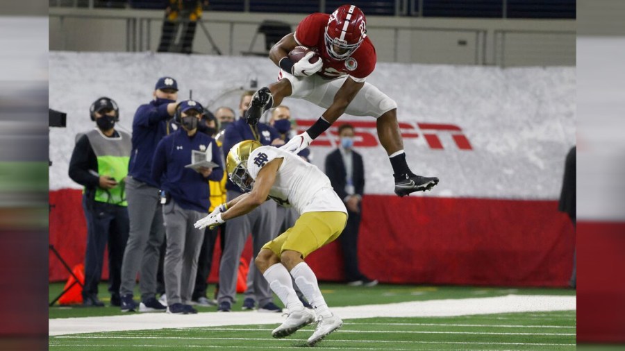 Alabama running back Najee Harris (22) hurdles Notre Dame cornerback Nick McCloud (4) as he carries the ball for a long gain in the first half of the Rose Bowl NCAA college football game in Arlington, Texas, Friday, Jan. 1, 2021. (AP Photo/Michael Ainsworth)