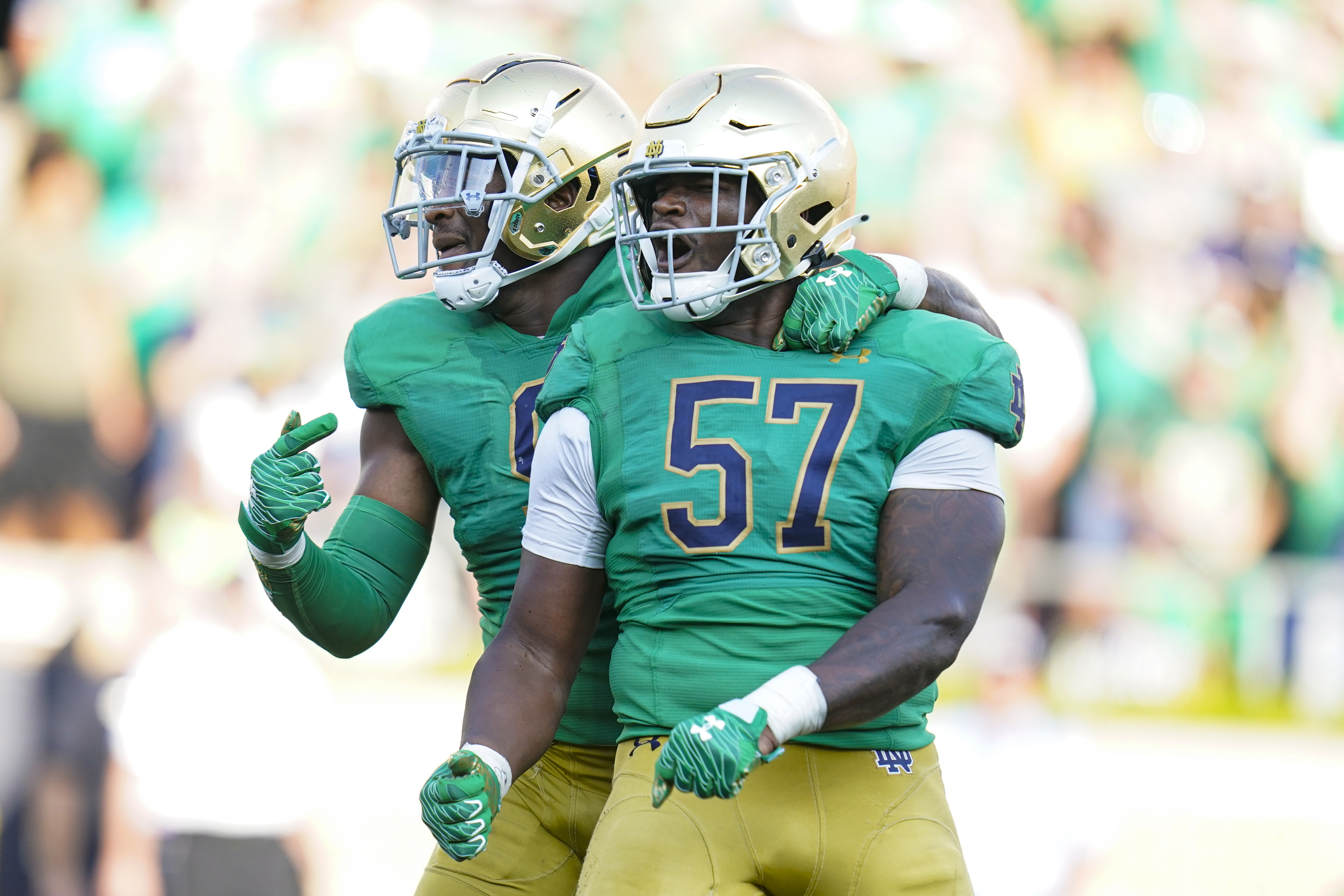 Notre Dame defensive lineman Jayson Ademilola (57) celebrates a sack against California with defensive lineman Justin Ademilola during the second half of an NCAA college football game in South Bend, Ind., Saturday, Sept. 17, 2022. Notre Dame defeated California 24-17.(AP Photo/Michael Conroy)