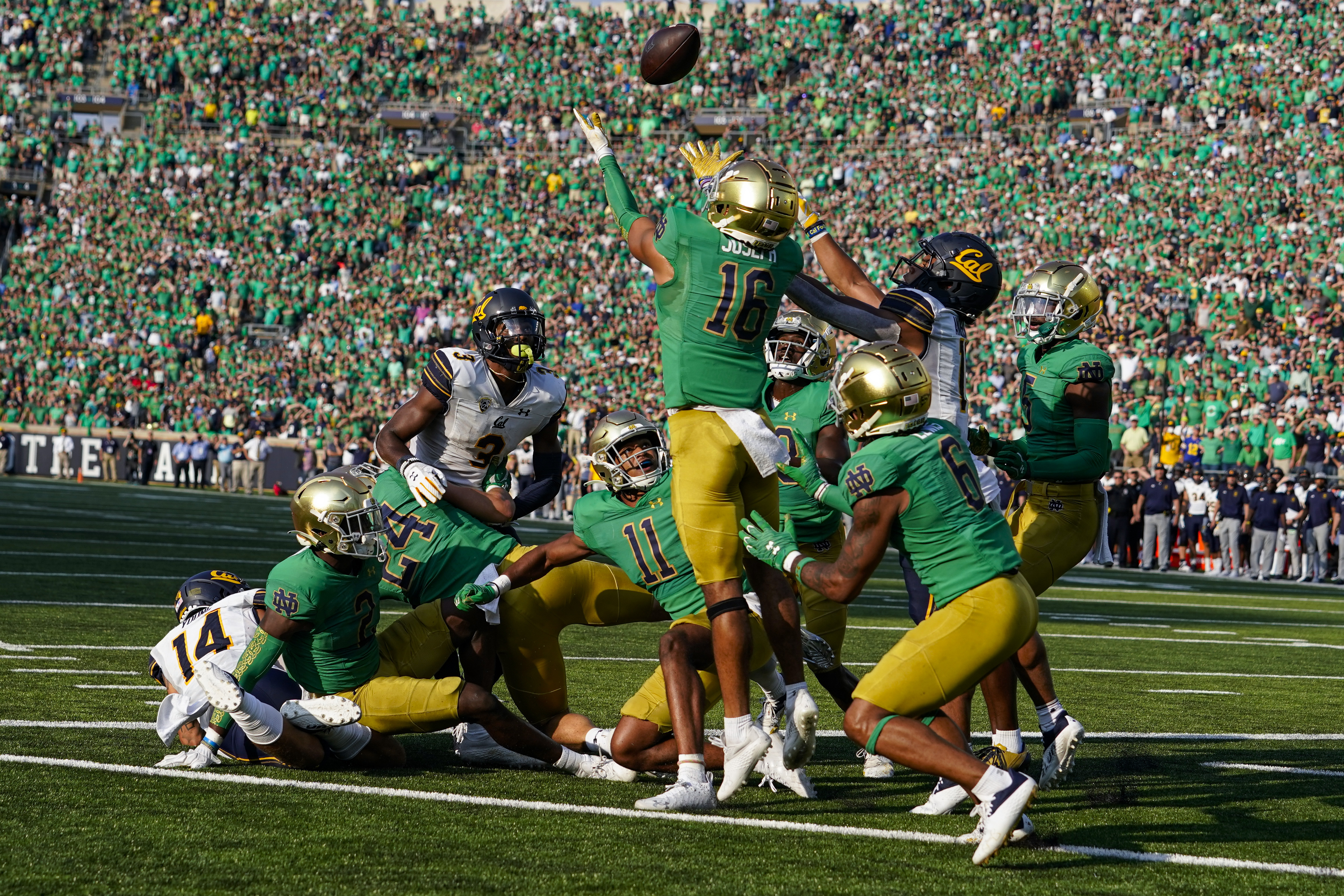 Notre Dame safety Brandon Joseph and California wide receiver Mavin Anderson (11) leap for a tipped ball as time expired in the second half of an NCAA college football game in South Bend, Ind., Saturday, Sept. 17, 2022. The pass was incomplete. Notre Dame defeated California 24-17.(AP Photo/Michael Conroy)
