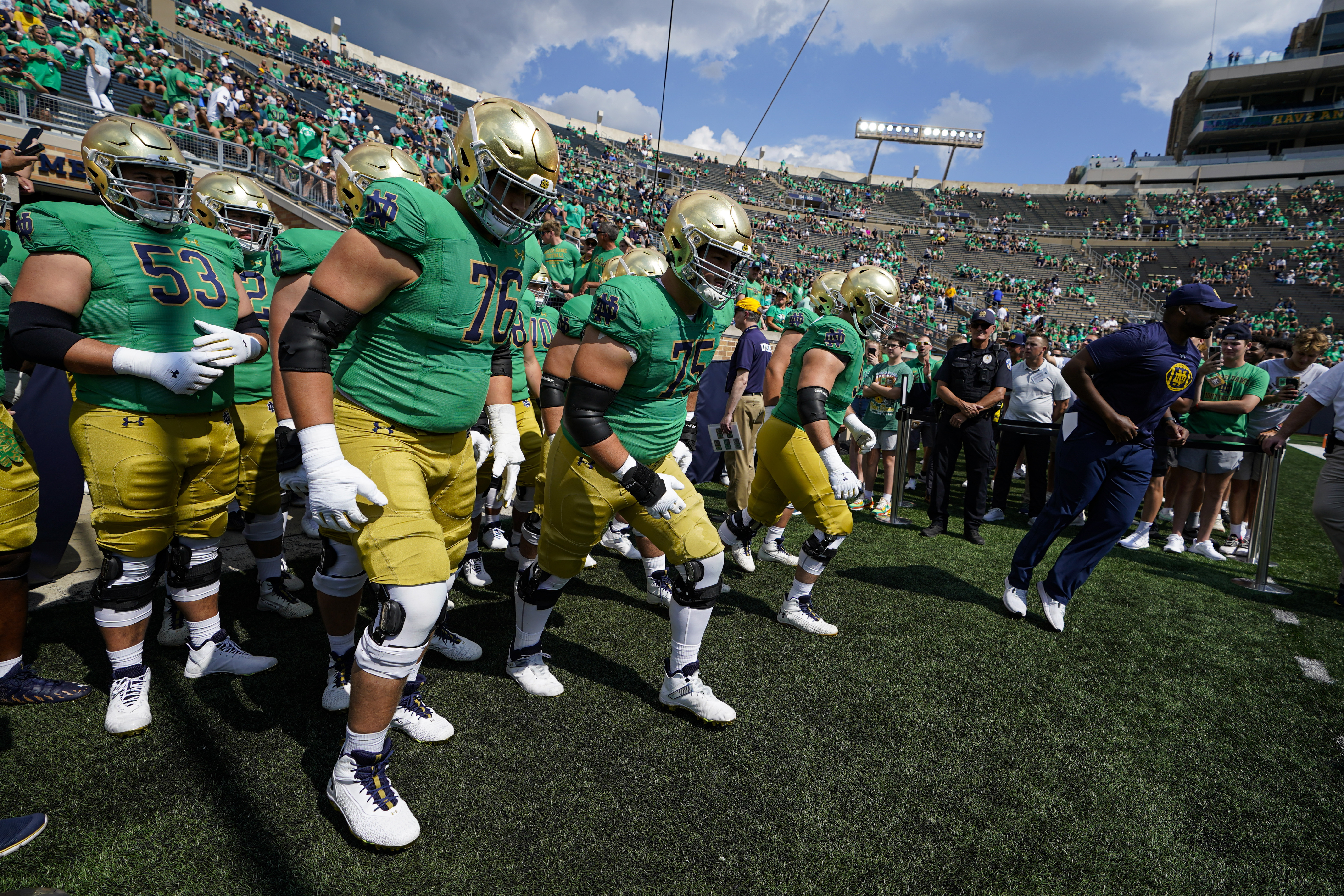Members of the offensive line take the field for warm ups before an NCAA college football game against California in South Bend, Ind., Saturday, Sept. 17, 2022. (AP Photo/Michael Conroy)