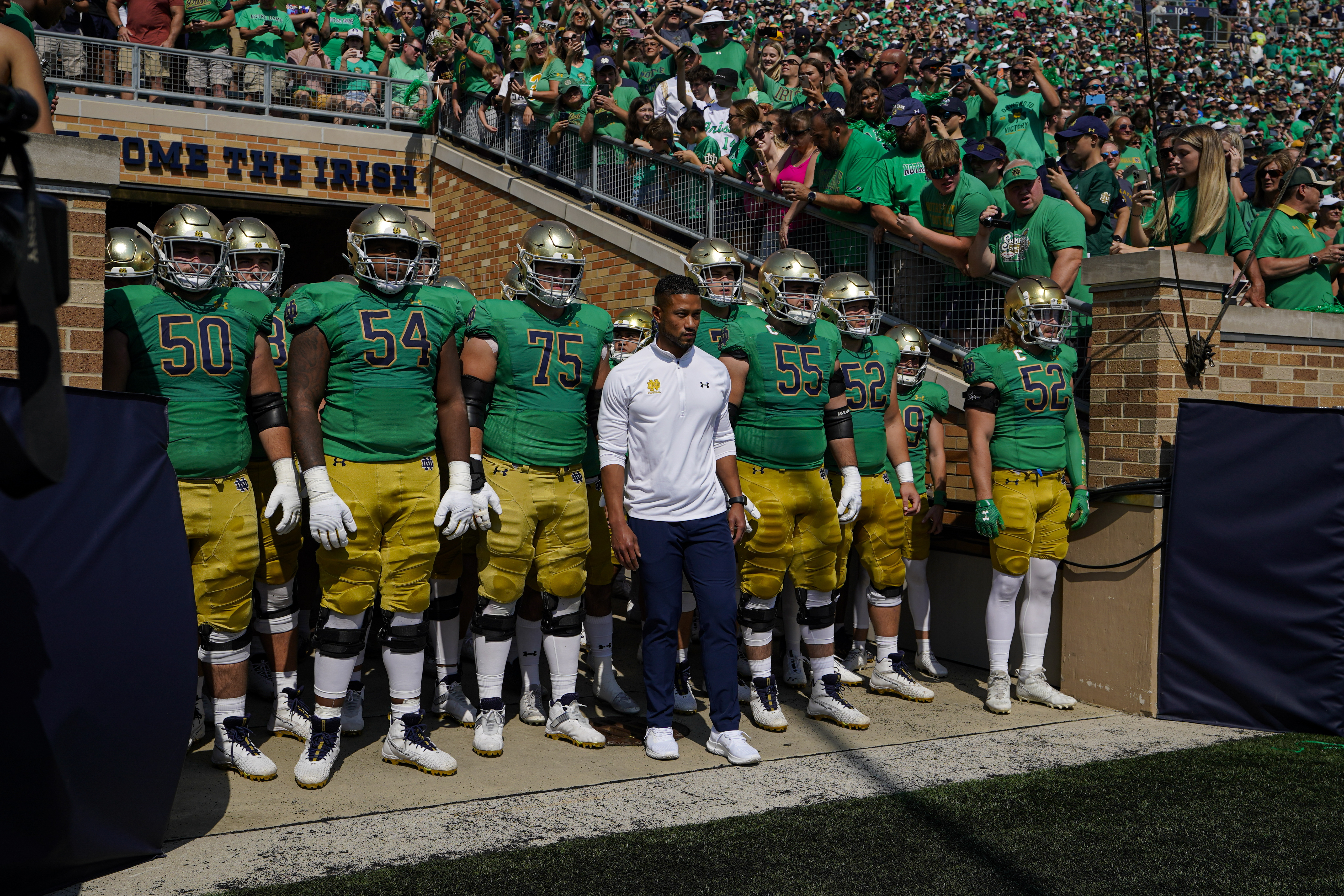 Notre Dame head coach Marcus Freeman leads his team through the tunnel and to the field before an NCAA college football game between Notre Dame and California in South Bend, Ind., Saturday, Sept. 17, 2022. (AP Photo/Michael Conroy)